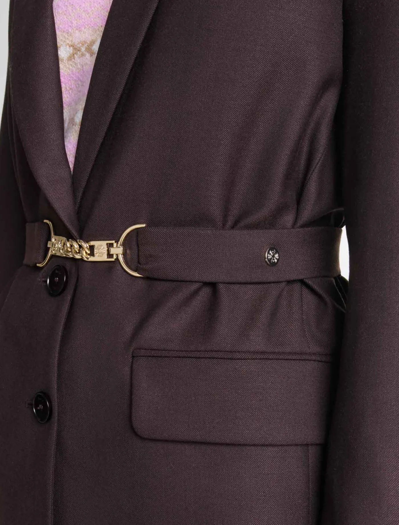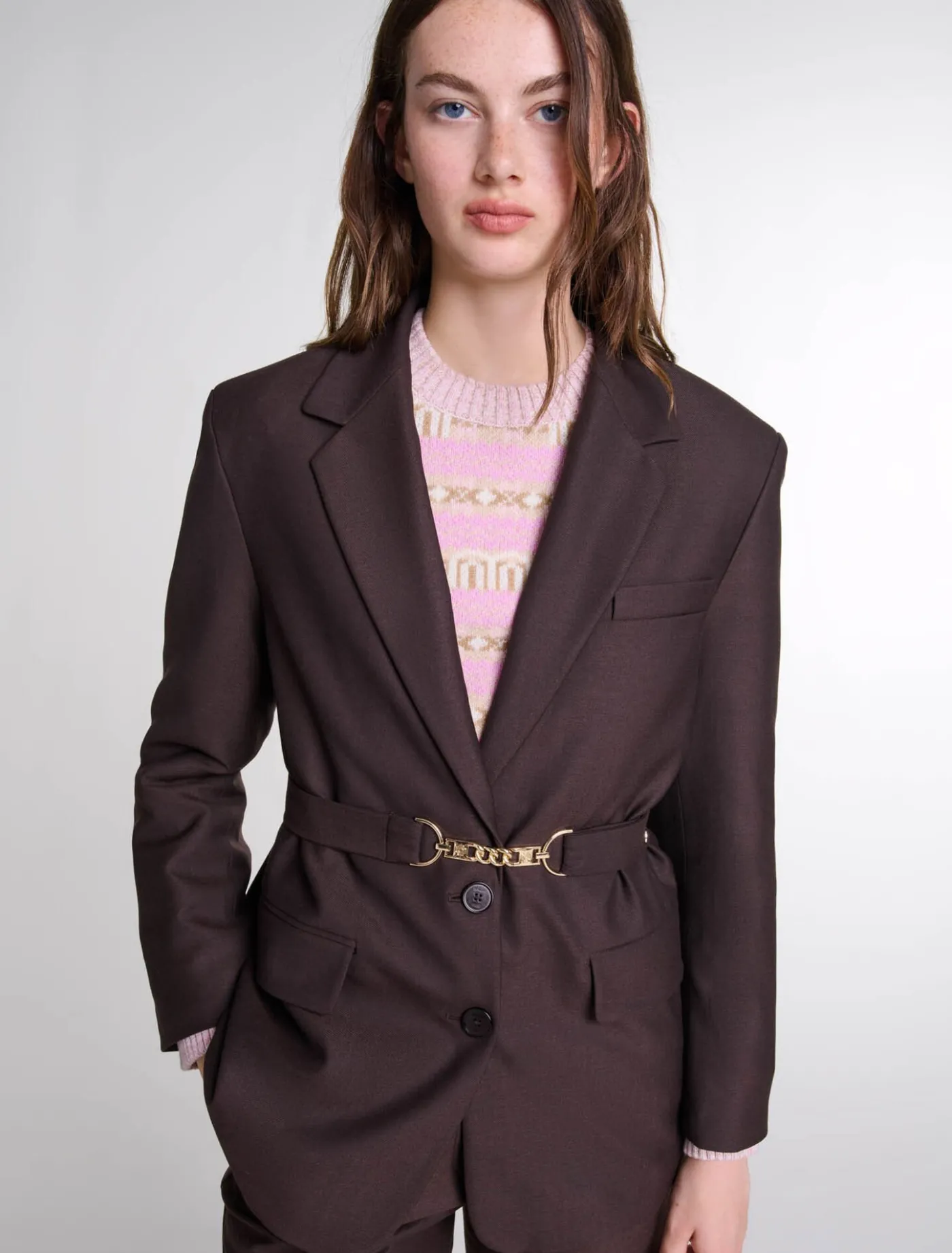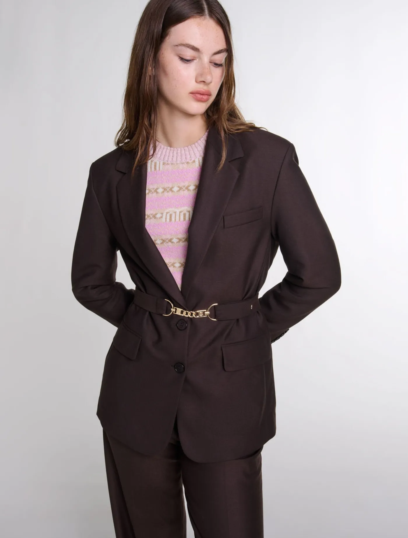 The waist is discreetly accentuated on this long-sleeved suit jacket with lapel collar. Both chic and structured, it features a removable belt with curb chain links – this season’s hottest accessory. Add matching trousers for an elegant silhouette, and set off with slingback pumps.