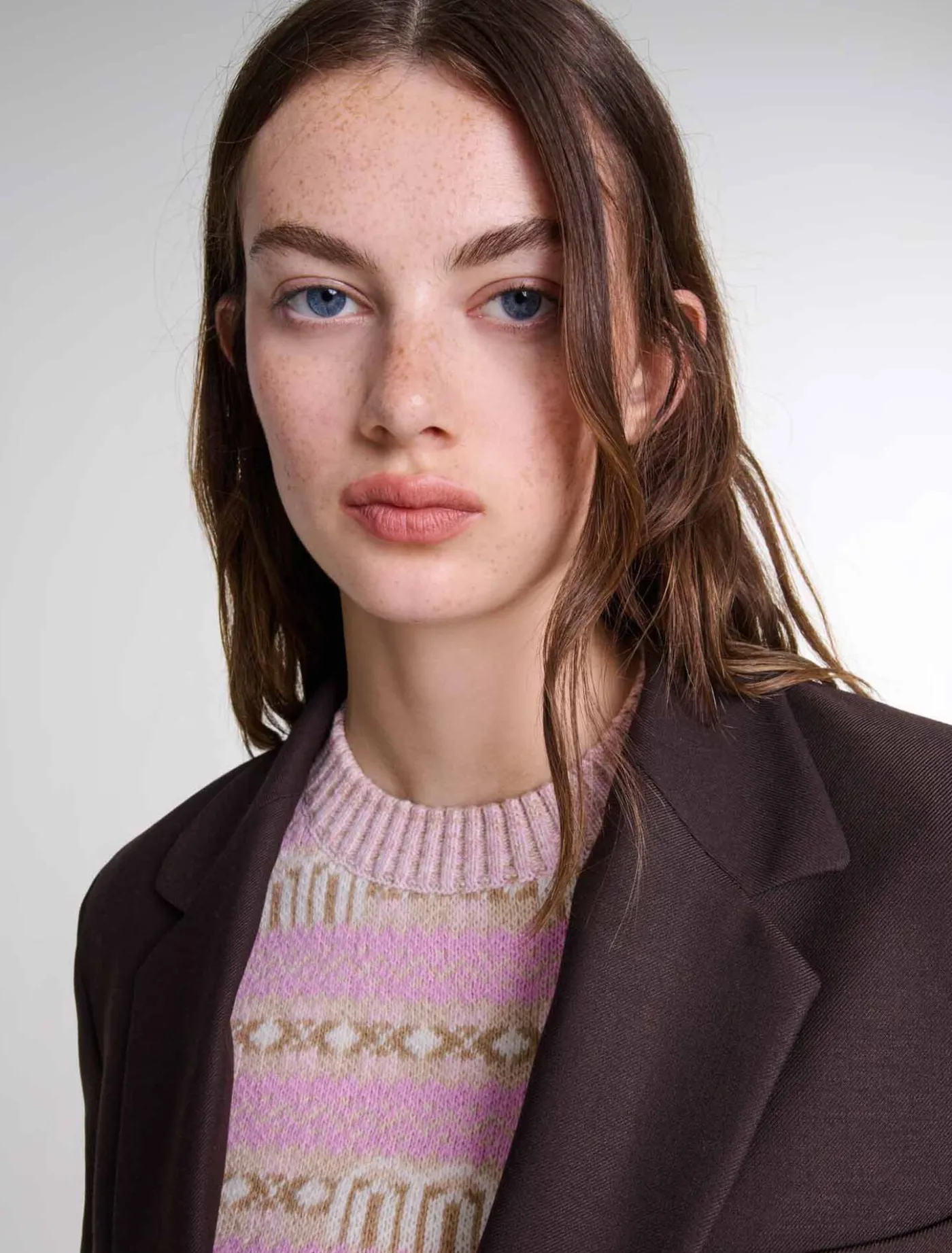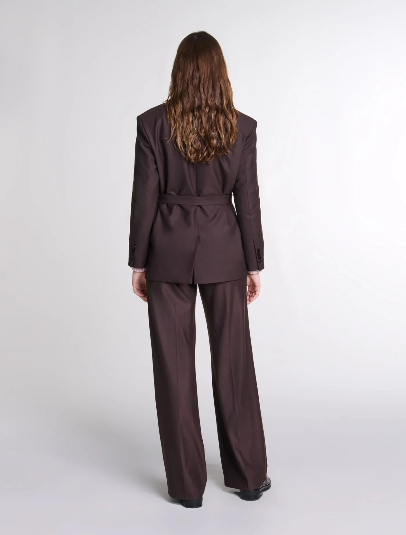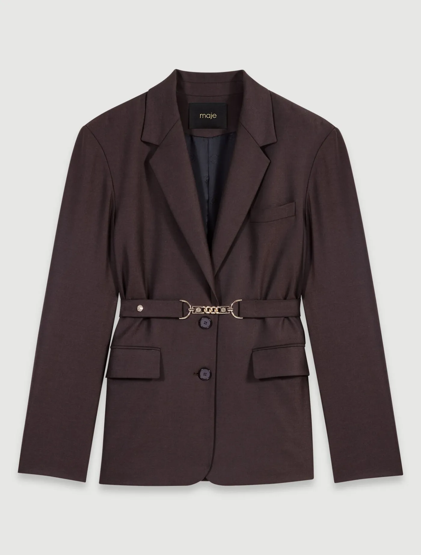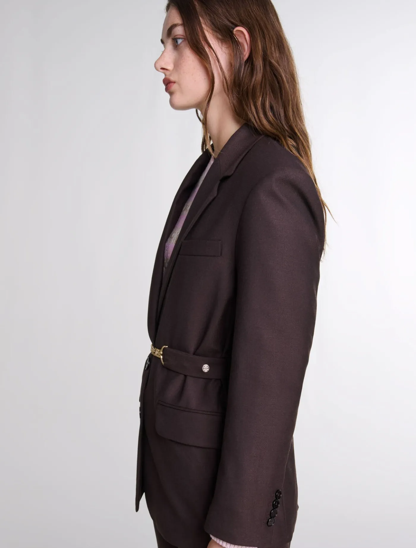 The waist is discreetly accentuated on this long-sleeved suit jacket with lapel collar. Both chic and structured, it features a removable belt with curb chain links – this season’s hottest accessory. Add matching trousers for an elegant silhouette, and set off with slingback pumps.