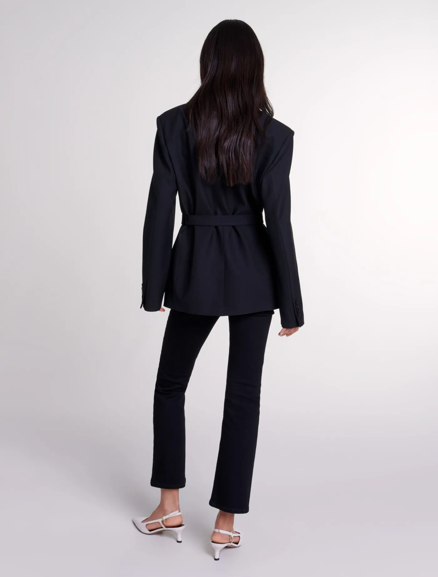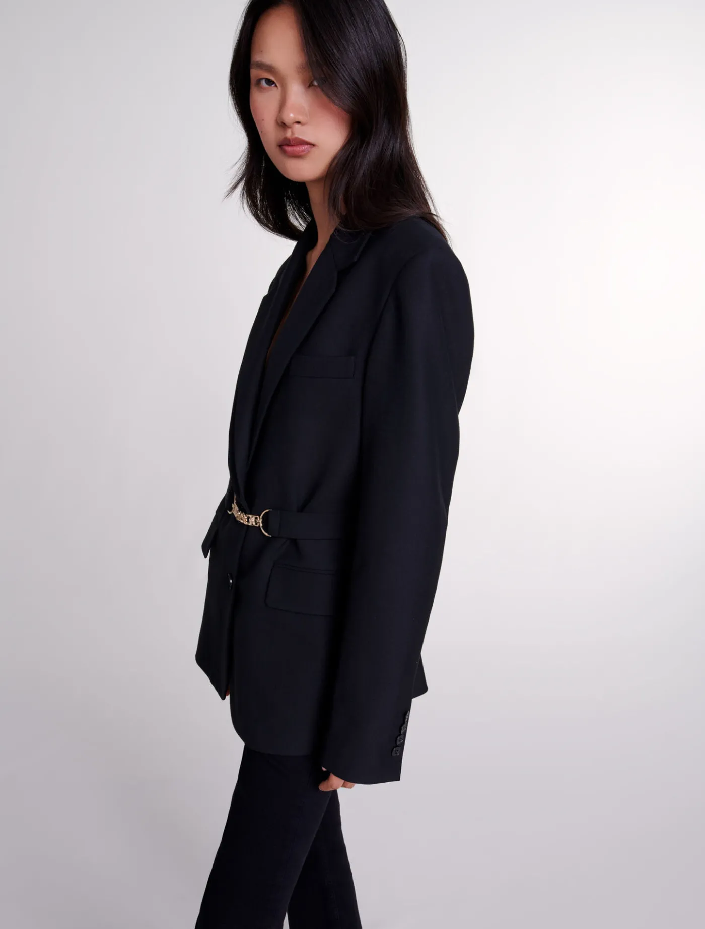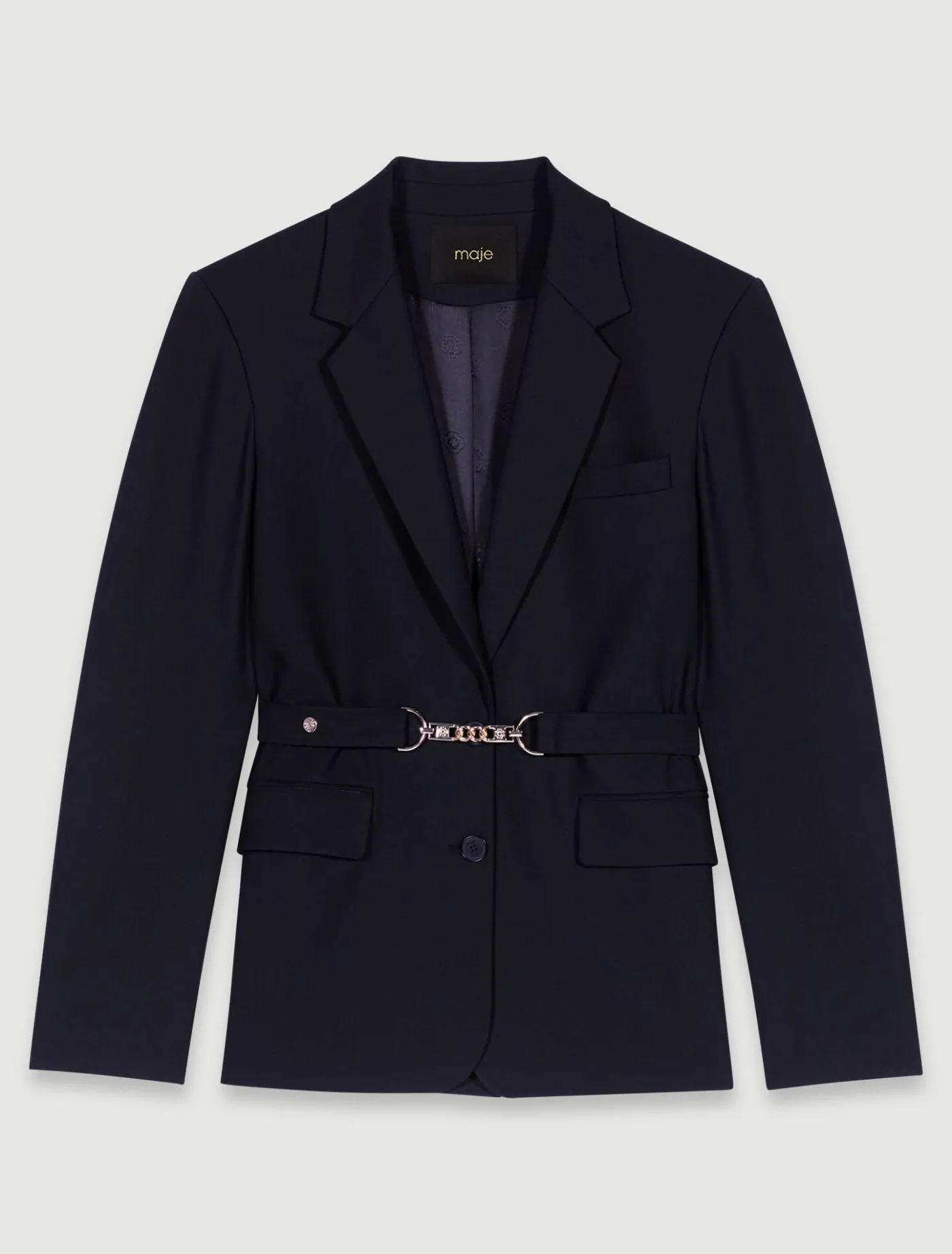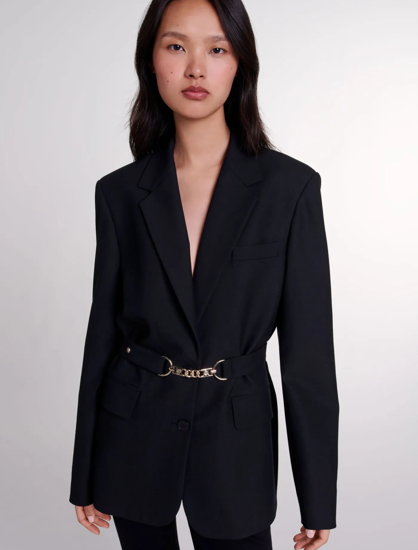 The waist is discreetly accentuated on this long-sleeved suit jacket with lapel collar. Both chic and structured, it features a removable belt with curb chain links – this season’s hottest accessory. Add matching trousers for an elegant silhouette, and set off with slingback pumps.