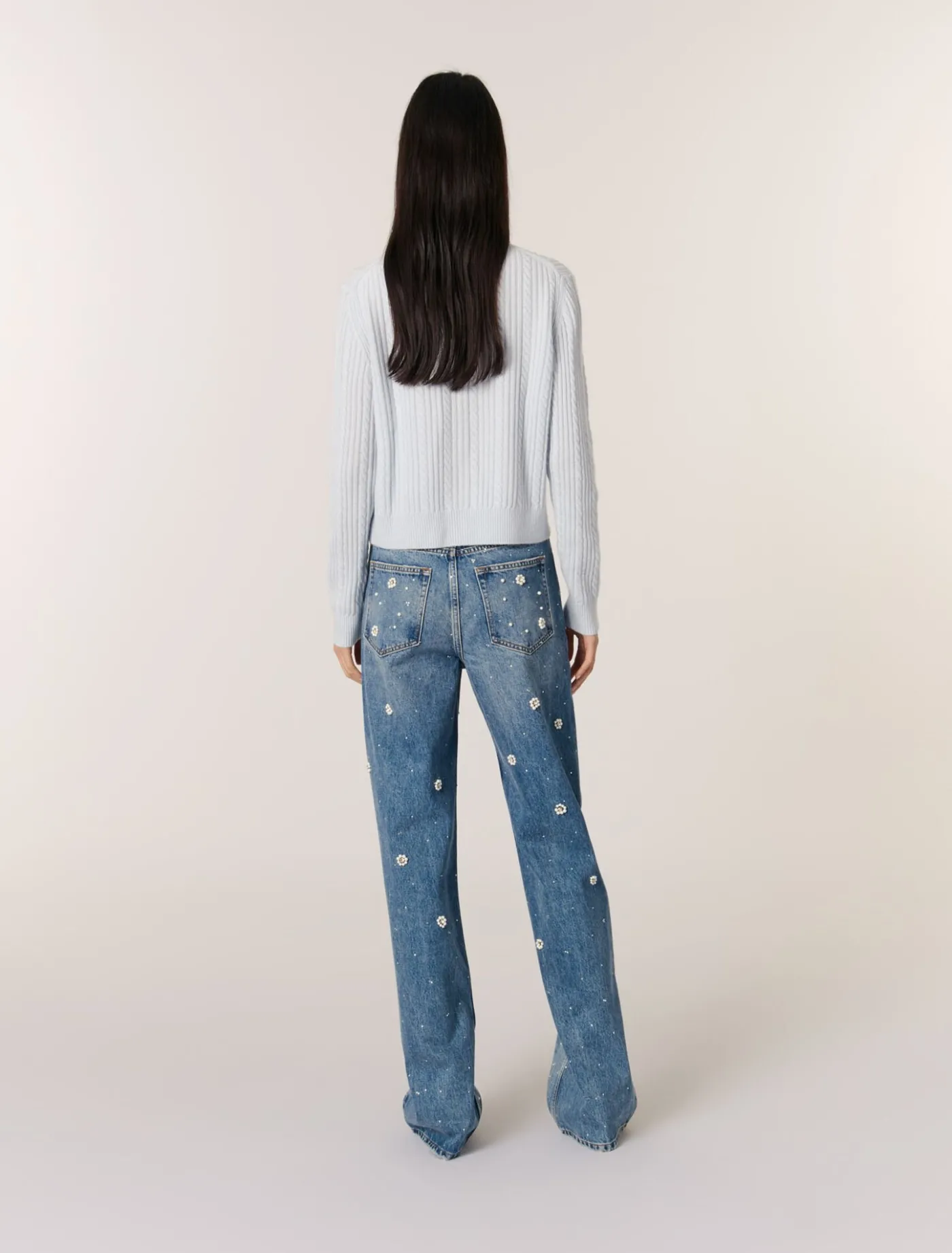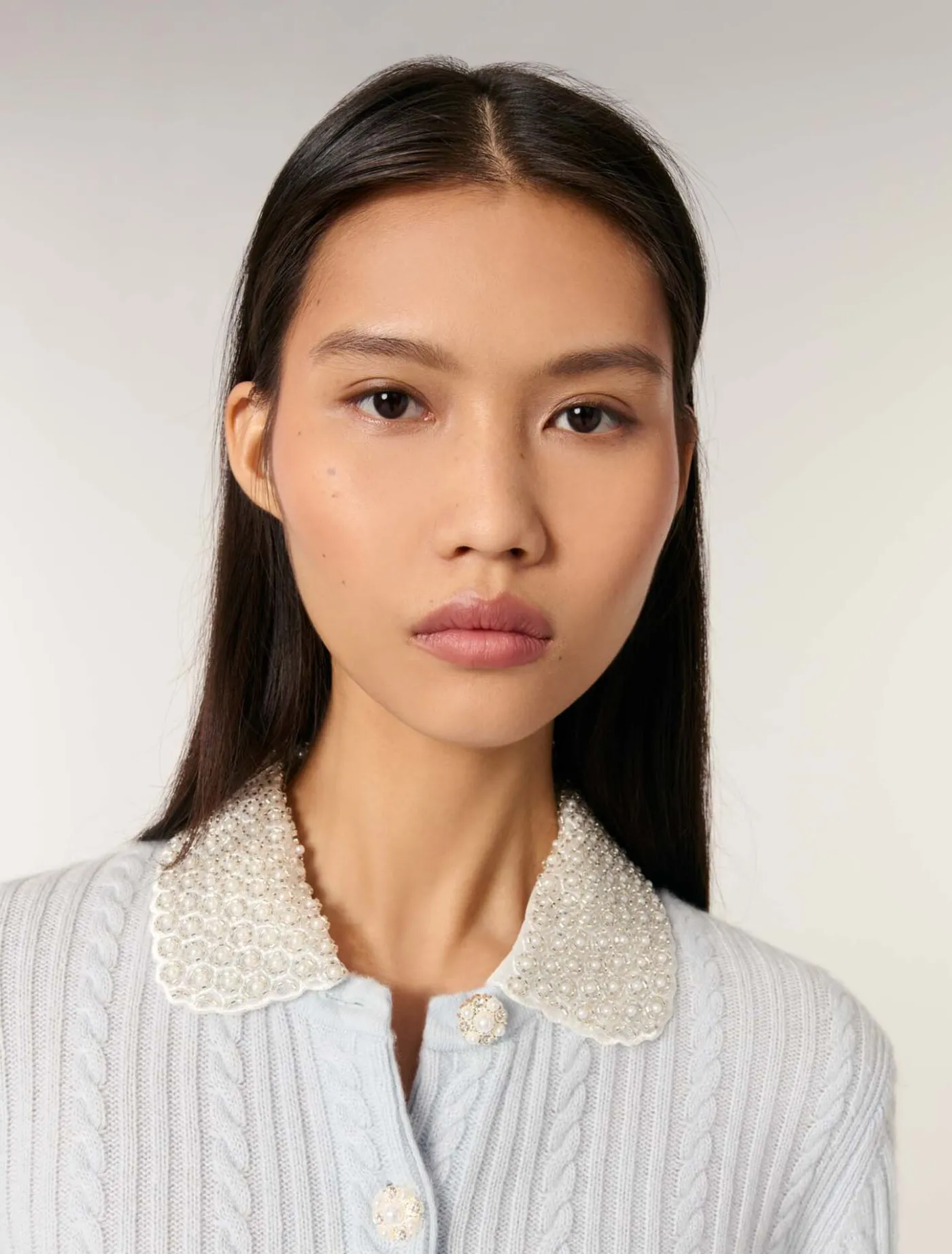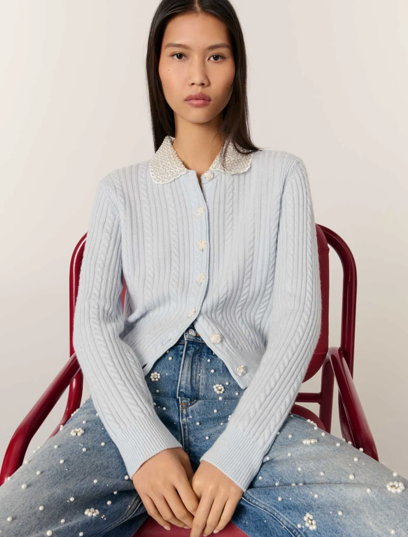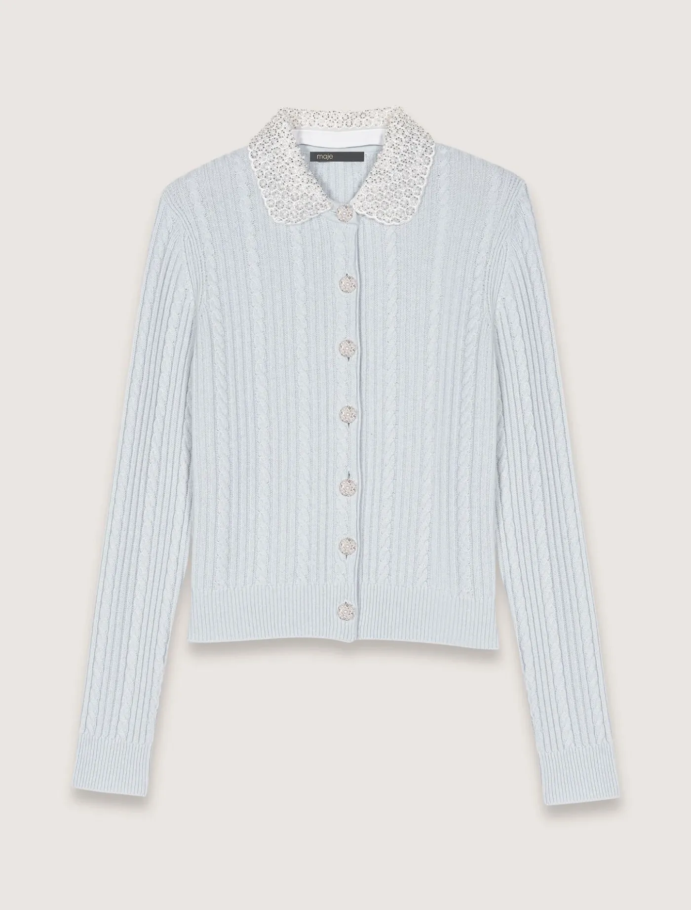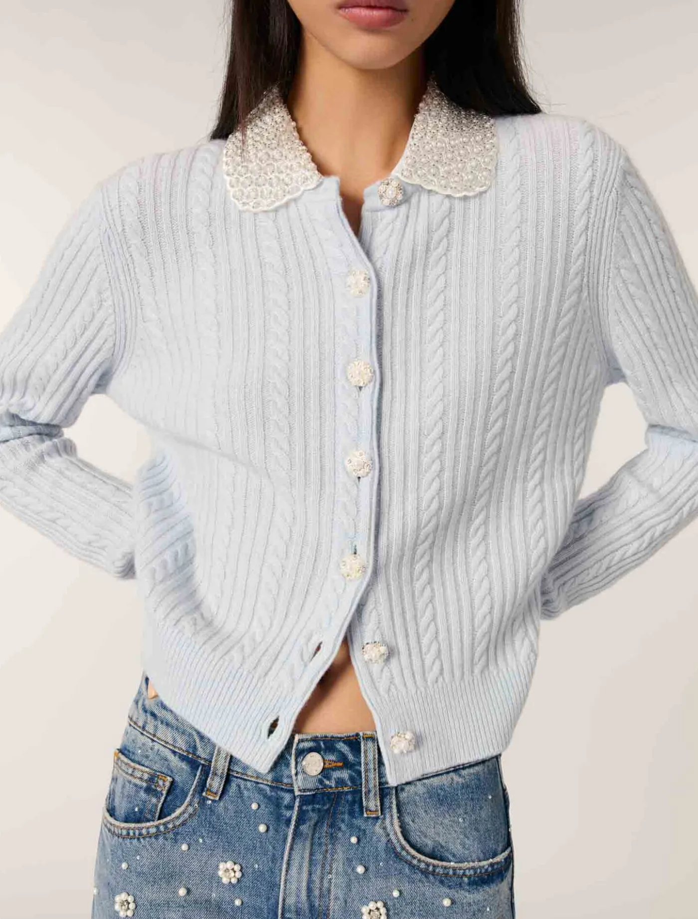 This cardigan is made from a cable knit for comfort and softness. Its removable Peter Pan collar, textured with scalloped edges, features embroidered beads and rhinestones. Jewellery buttons give the piece a striking structure.