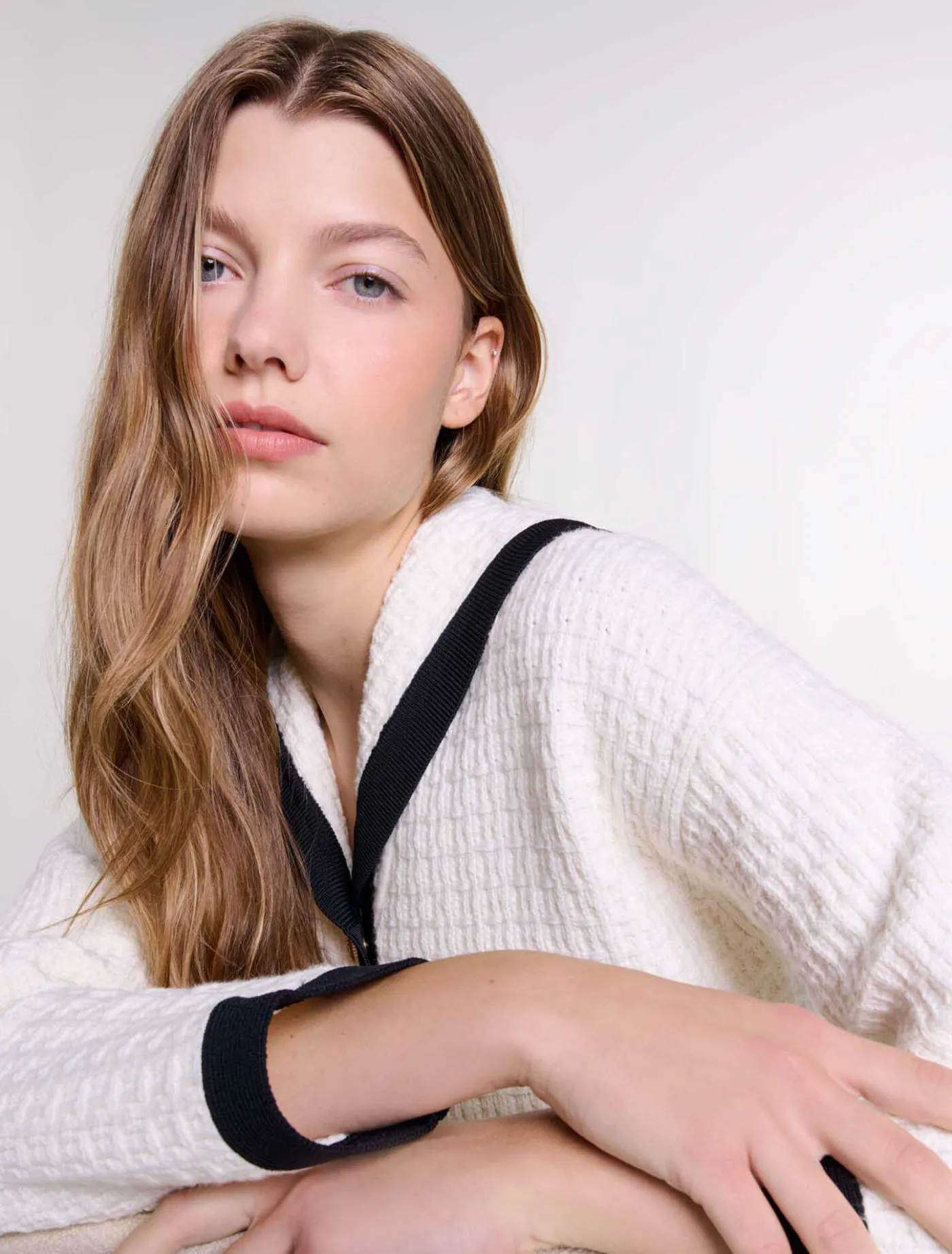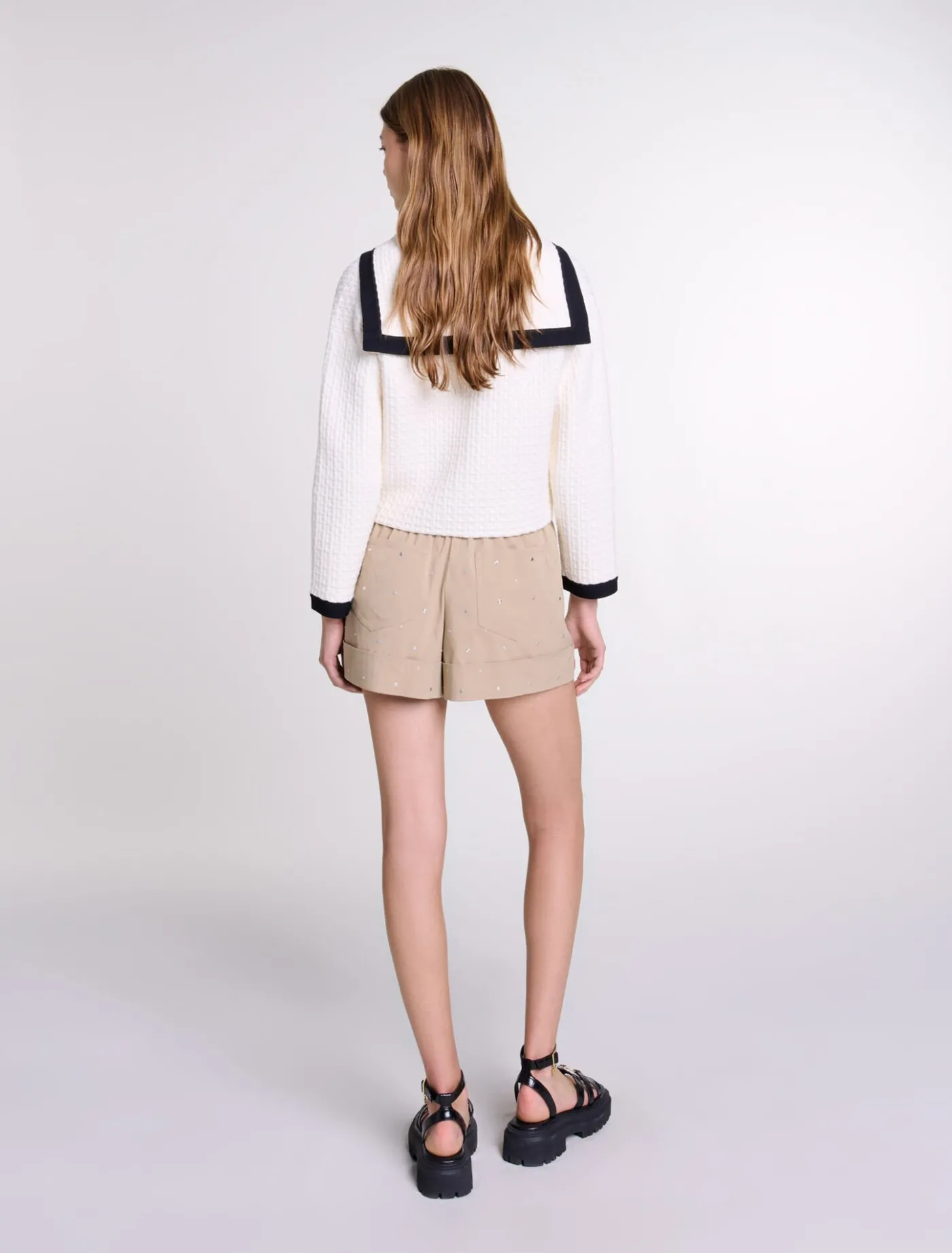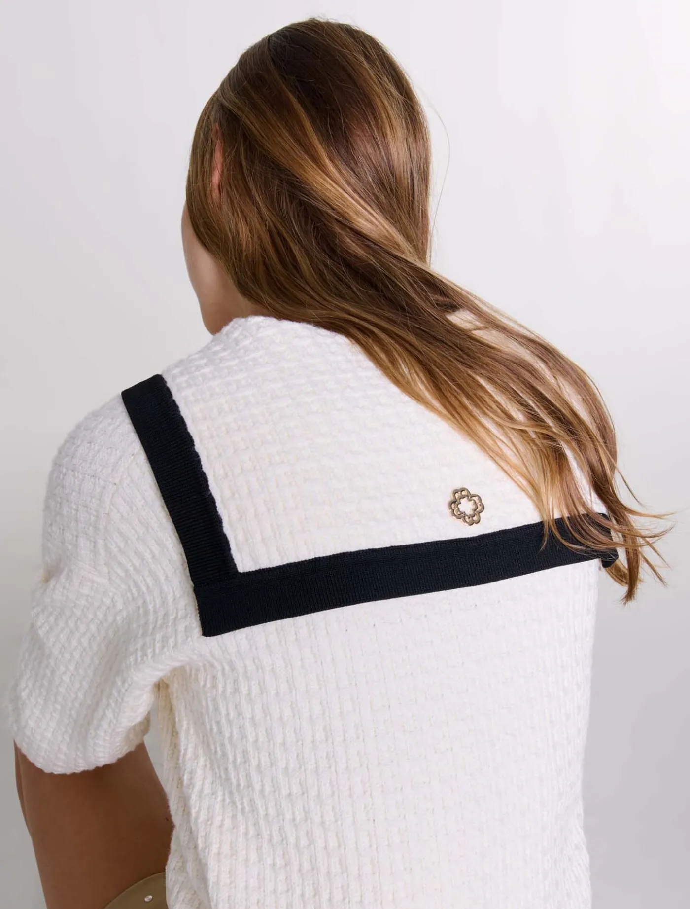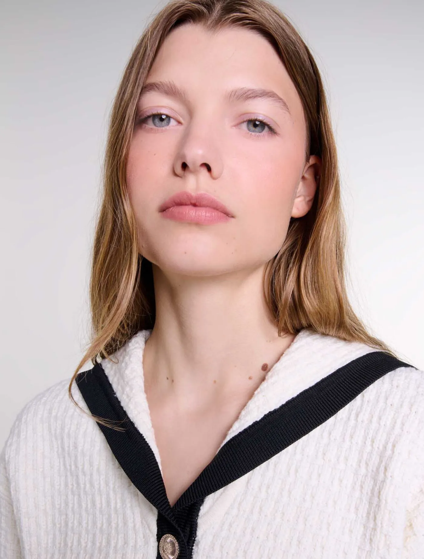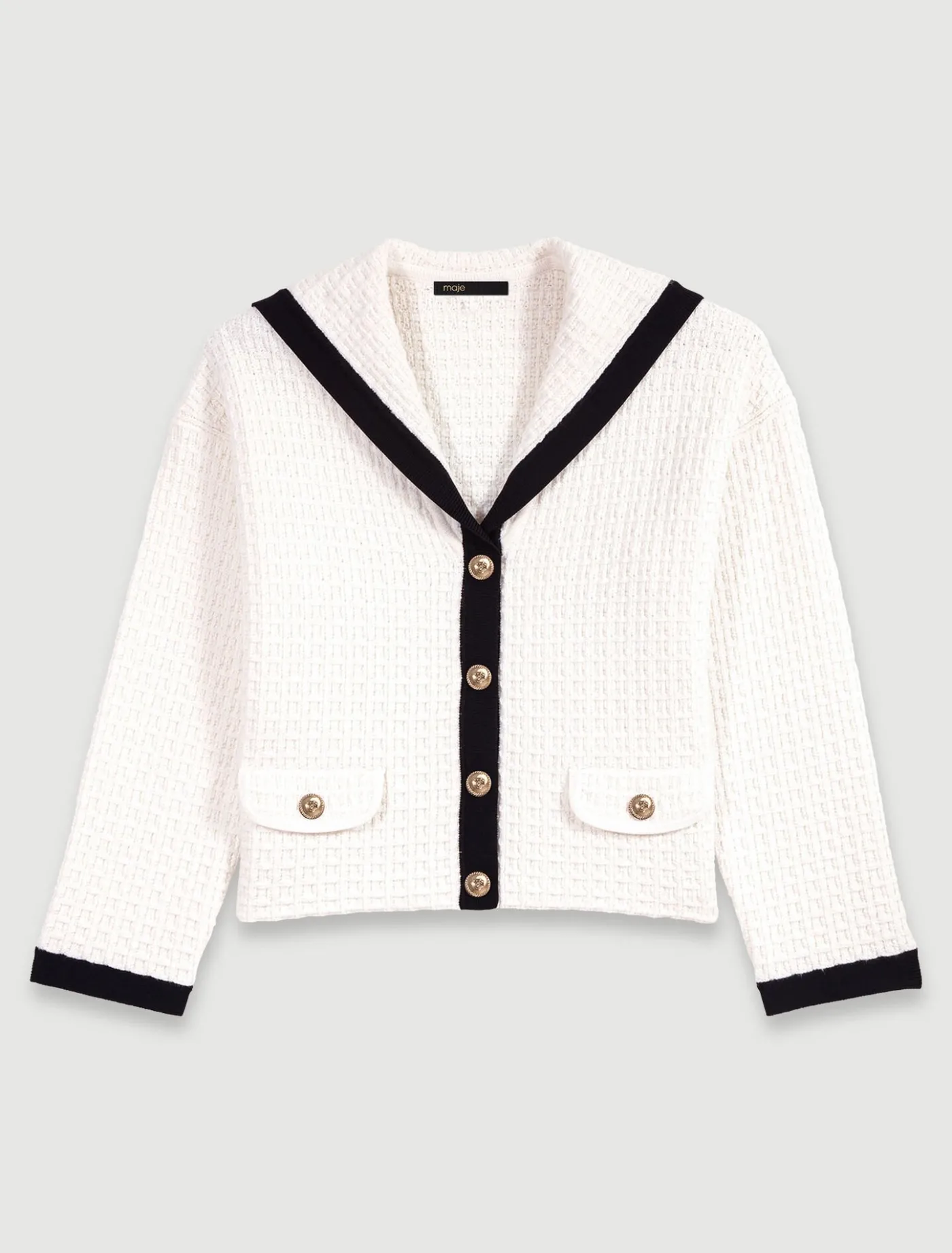 This short, structured jumper features a woven knit, accented with contrasting edging and elaborate gold buttons. With two flap pockets and long sleeves, it features a sailor collar and a gold Clover embroidered tag on the back.