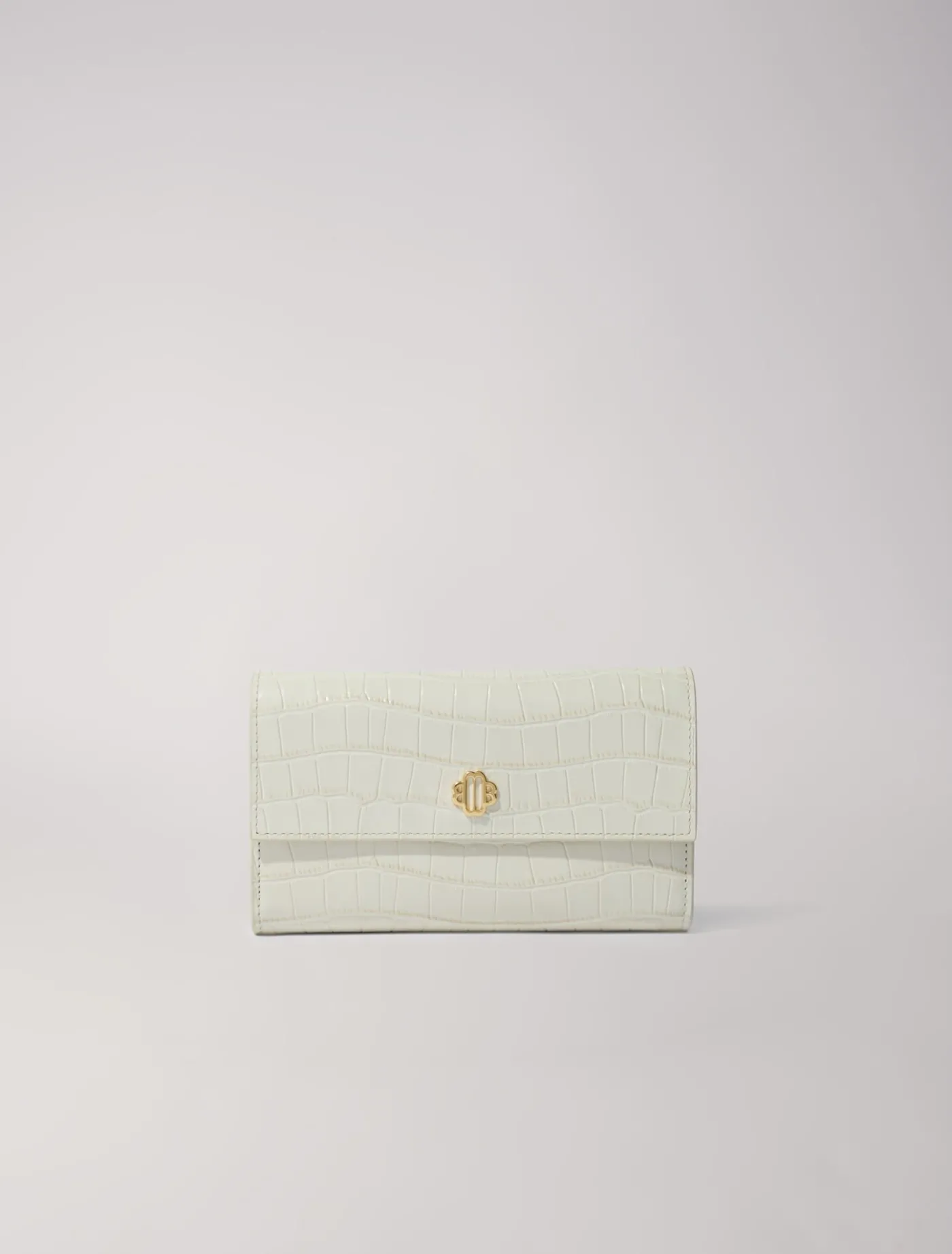 Croc-effect embossed leather clutch with flap. Practical gold-tone metal Clover clasp. Inside patch pocket. Cotton linin…