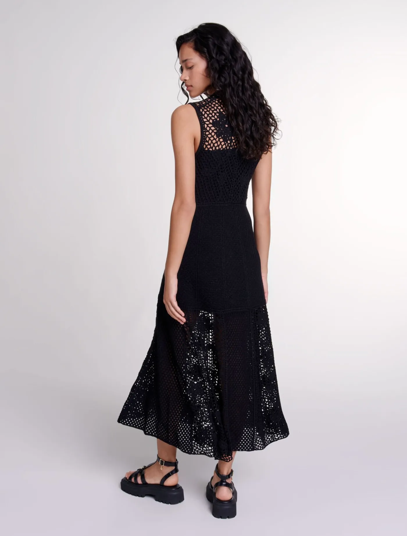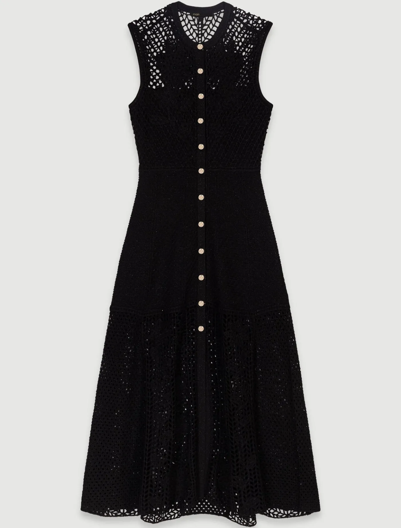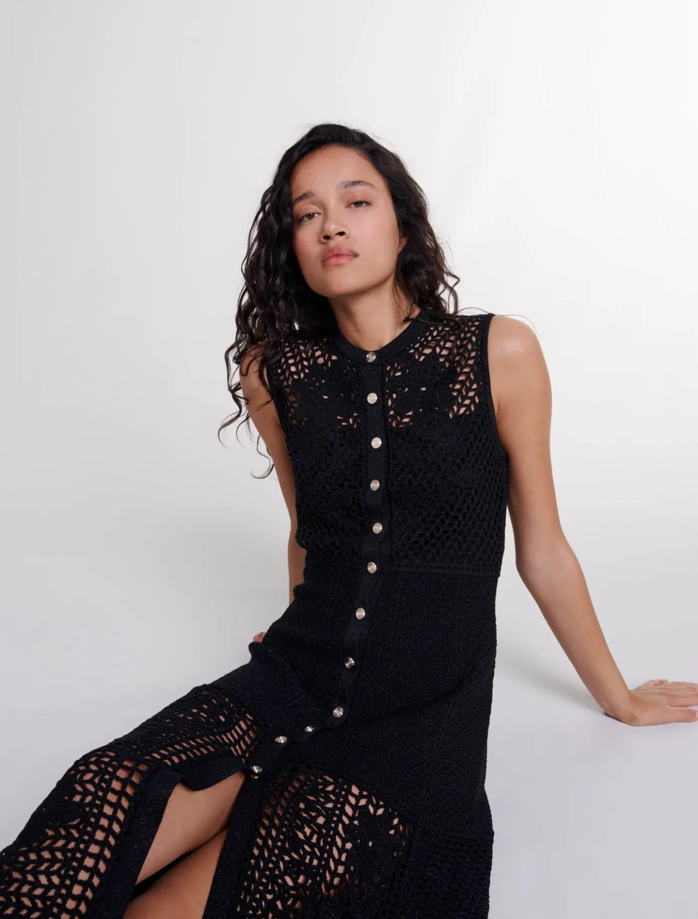 A light, elegant look: this sleeveless openwork crochet maxi dress is flared with see-through details. Alongside a short lining and button fastening, you can choose how open it is to suit your mood.