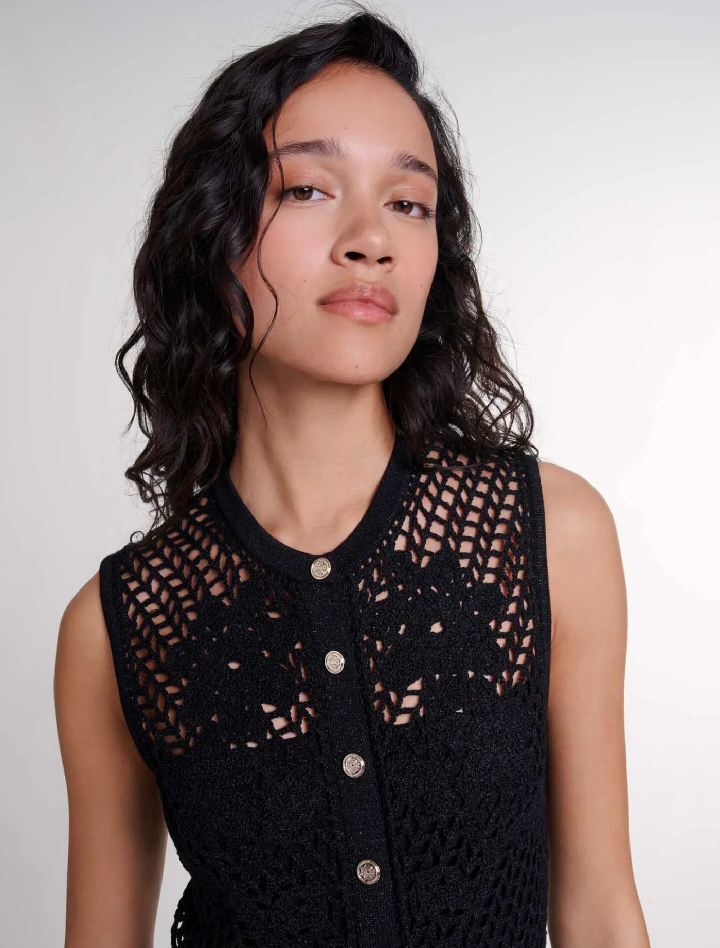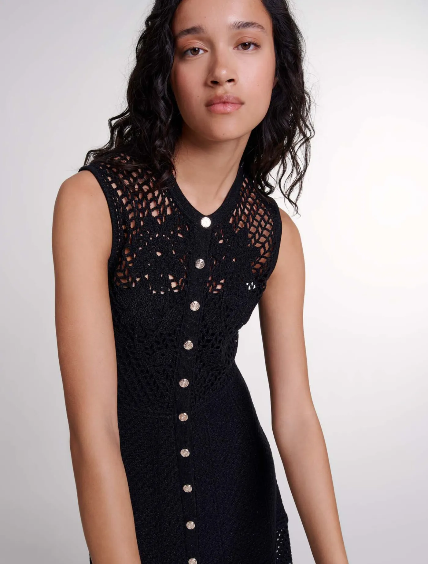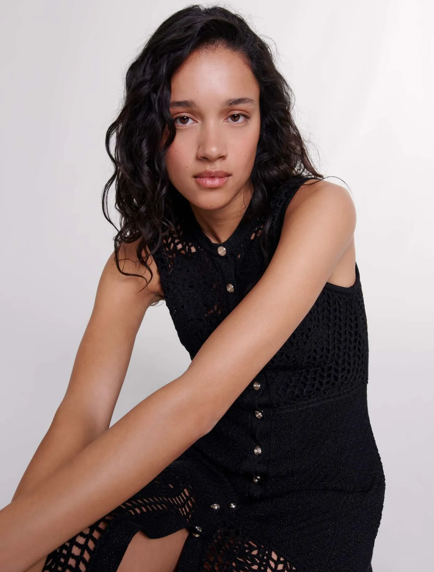 A light, elegant look: this sleeveless openwork crochet maxi dress is flared with see-through details. Alongside a short lining and button fastening, you can choose how open it is to suit your mood.