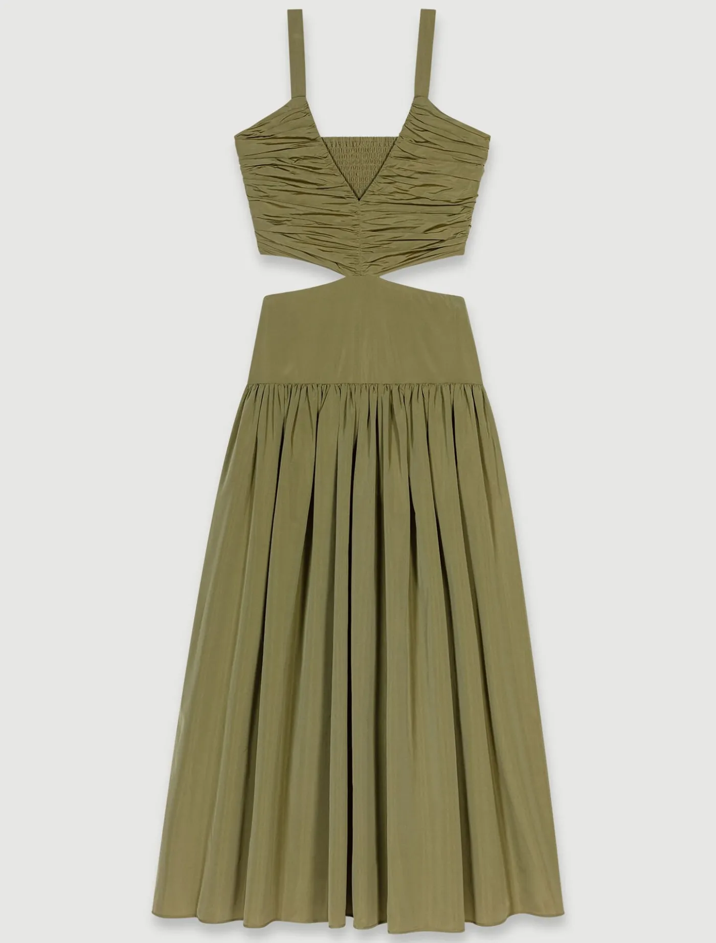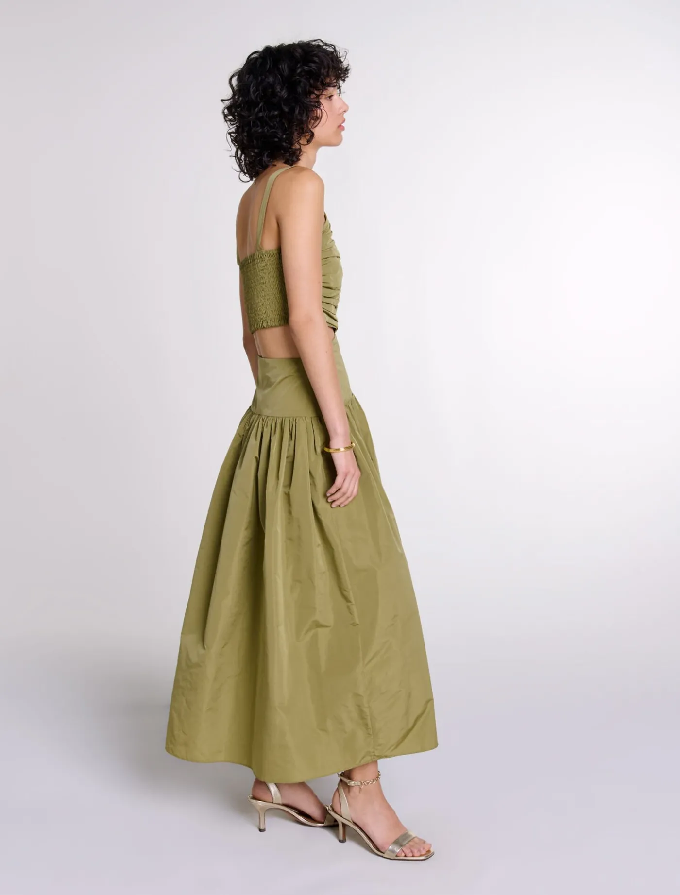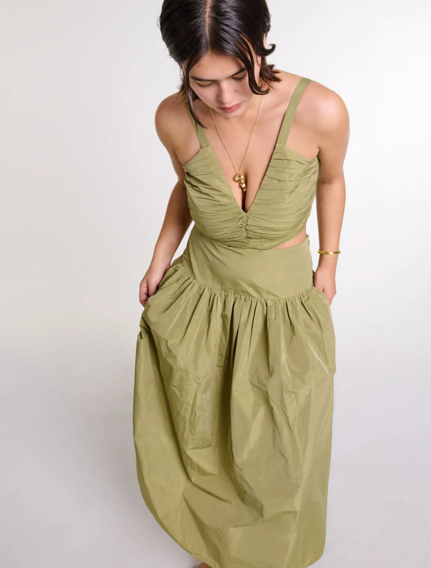 Made from a technical taffeta-style fabric, this long dress has a plunging V-neckline with a ruched effect, set off by wide straps. With a dainty smocked back, it features a bold interplay of cutaway sections at the waist, subtly revealing the skin, and an airy, full skirt.