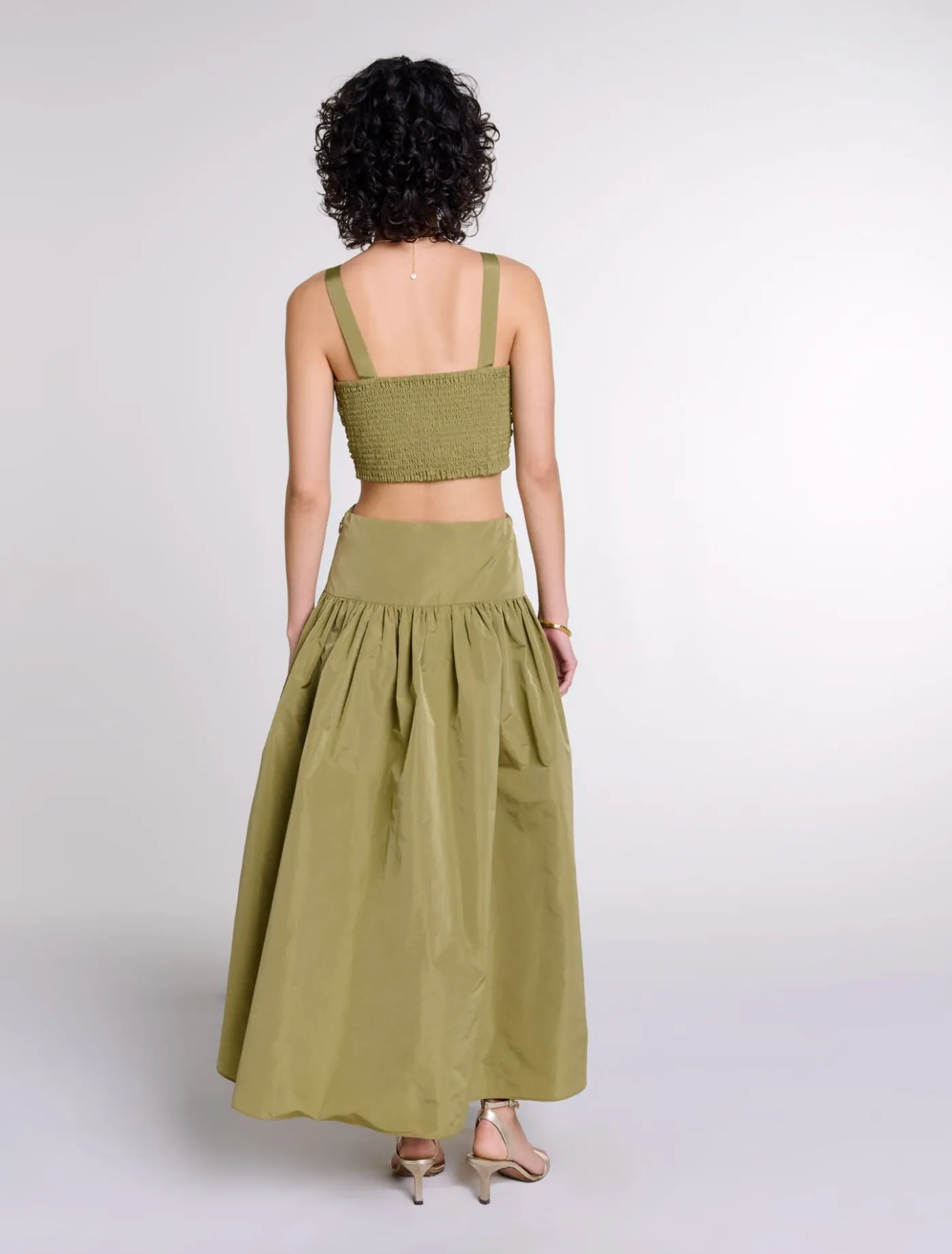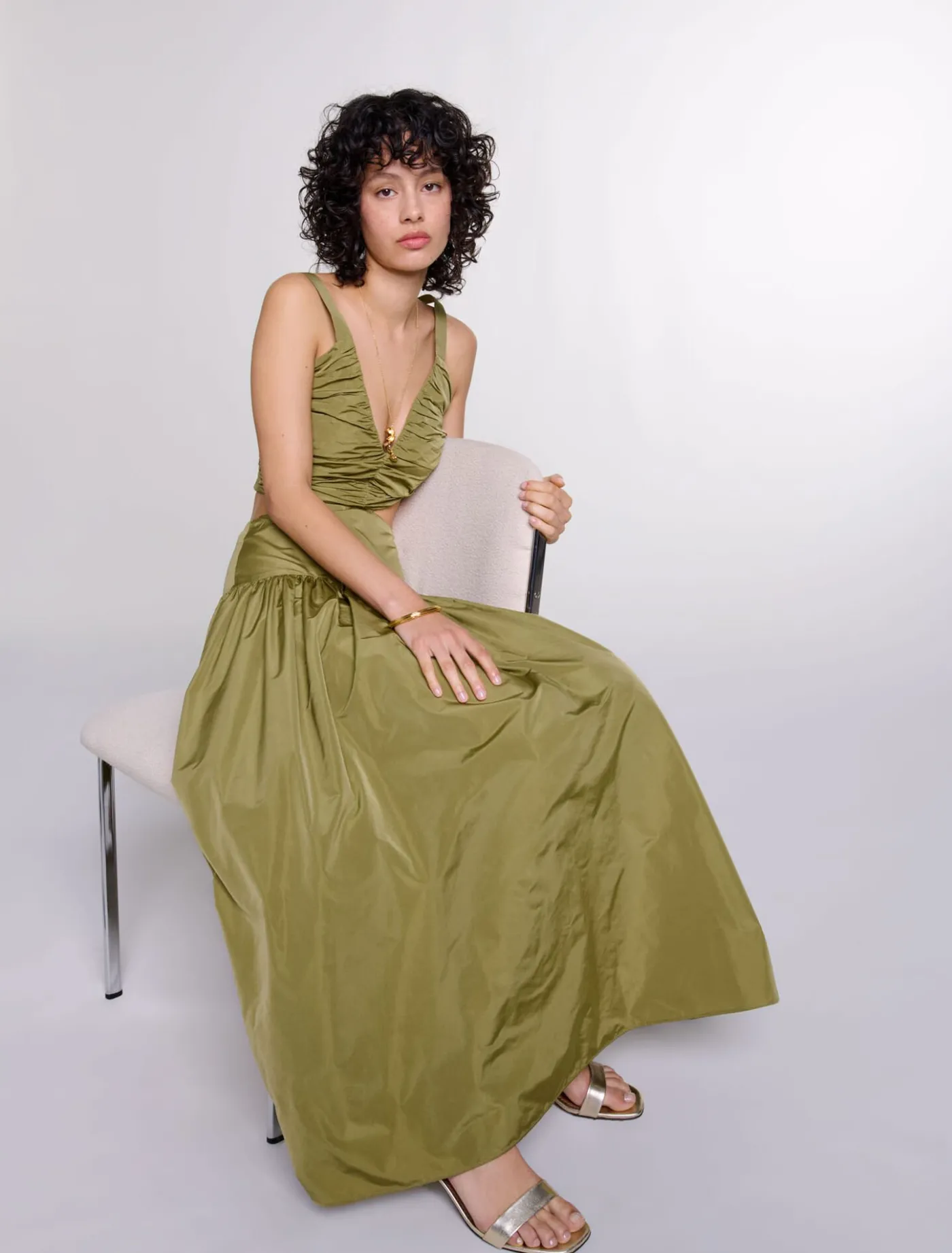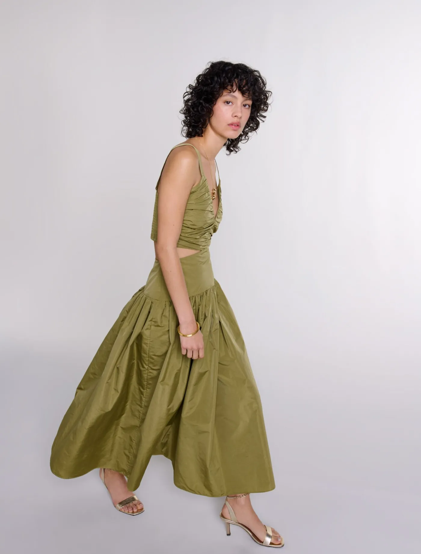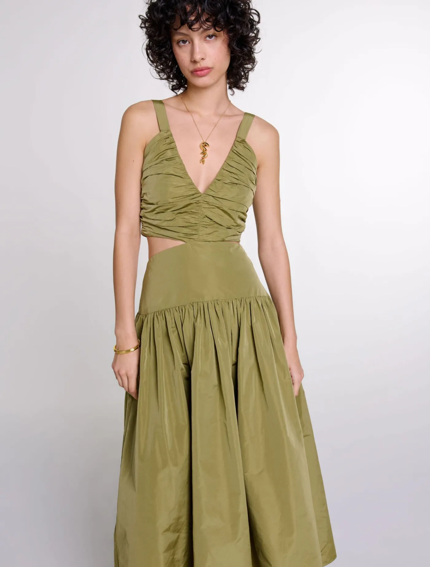 Made from a technical taffeta-style fabric, this long dress has a plunging V-neckline with a ruched effect, set off by wide straps. With a dainty smocked back, it features a bold interplay of cutaway sections at the waist, subtly revealing the skin, and an airy, full skirt.
