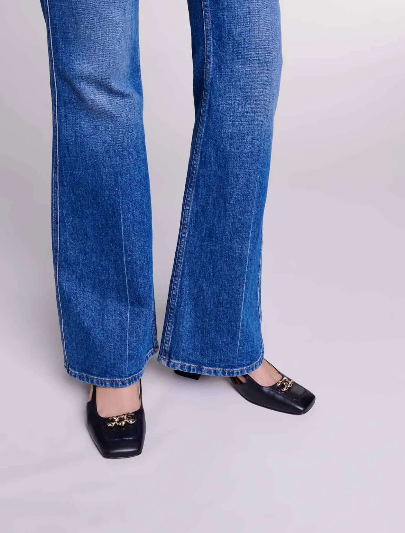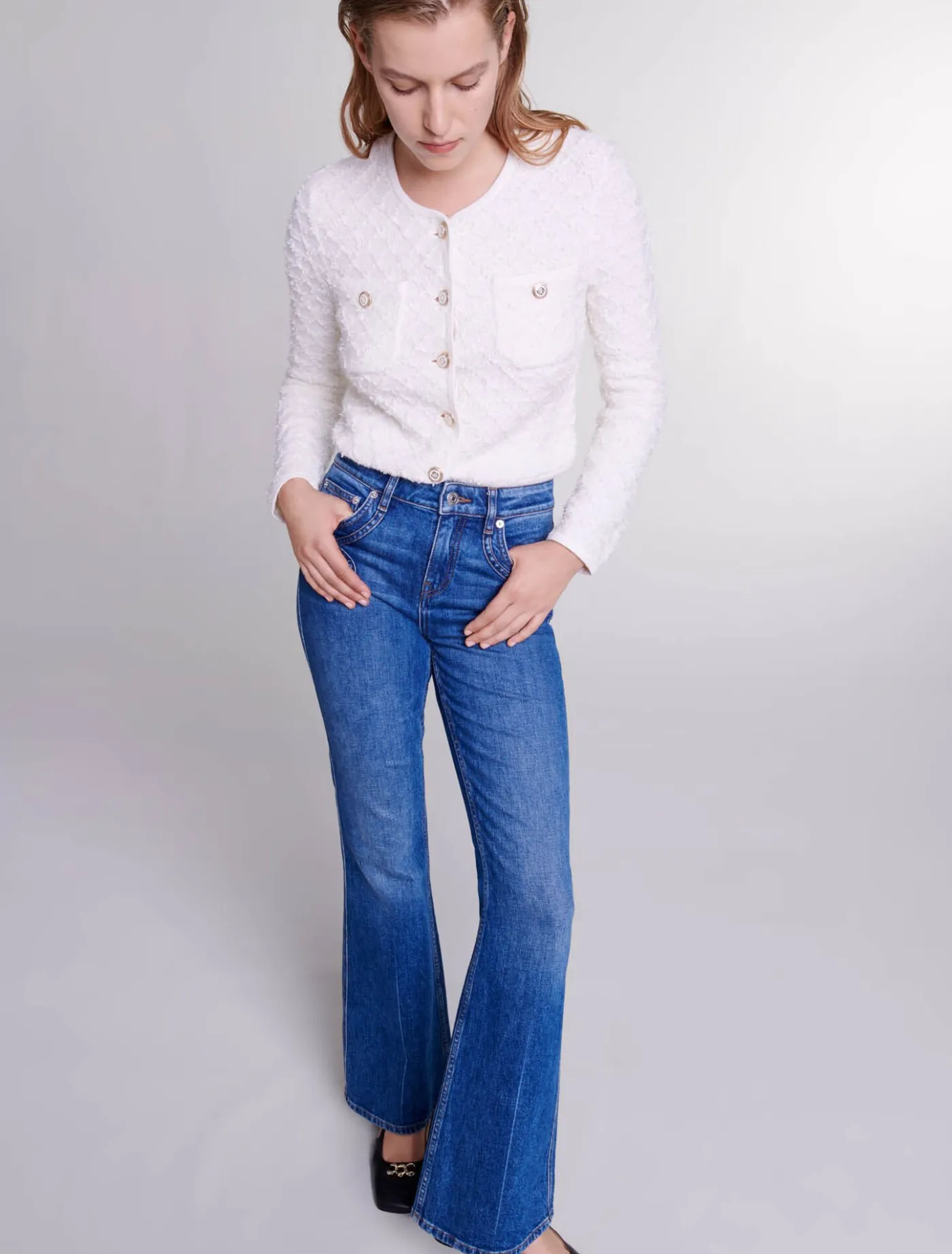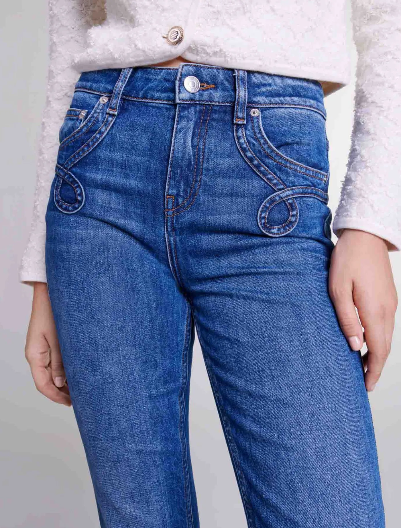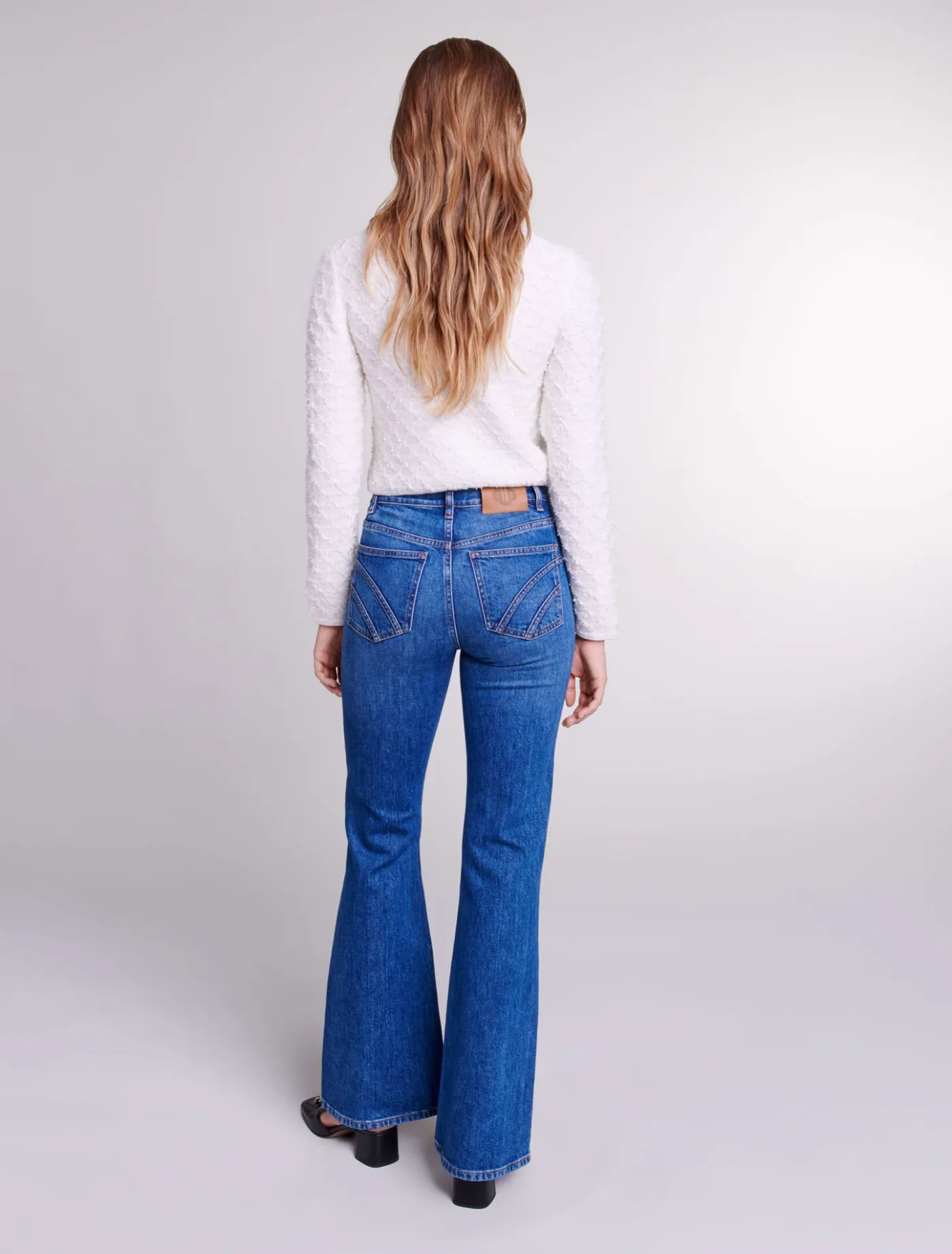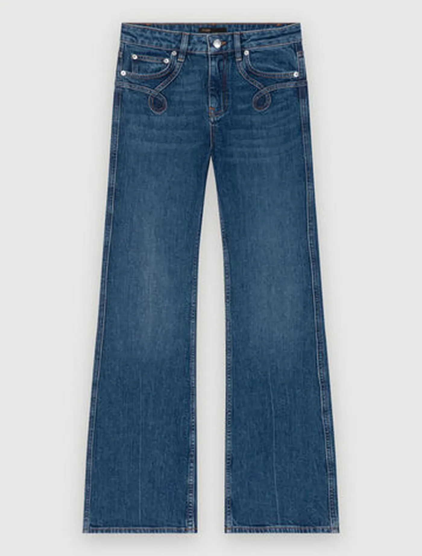 These faded denim jeans have a flared cut and a mid-rise waist. They are embroidered on the pockets. A must-have piece for putting together your Maje looks.