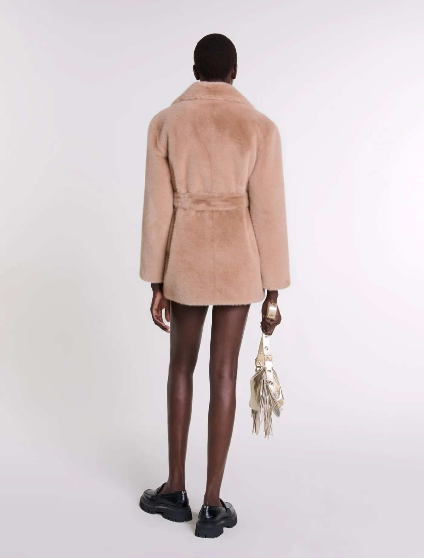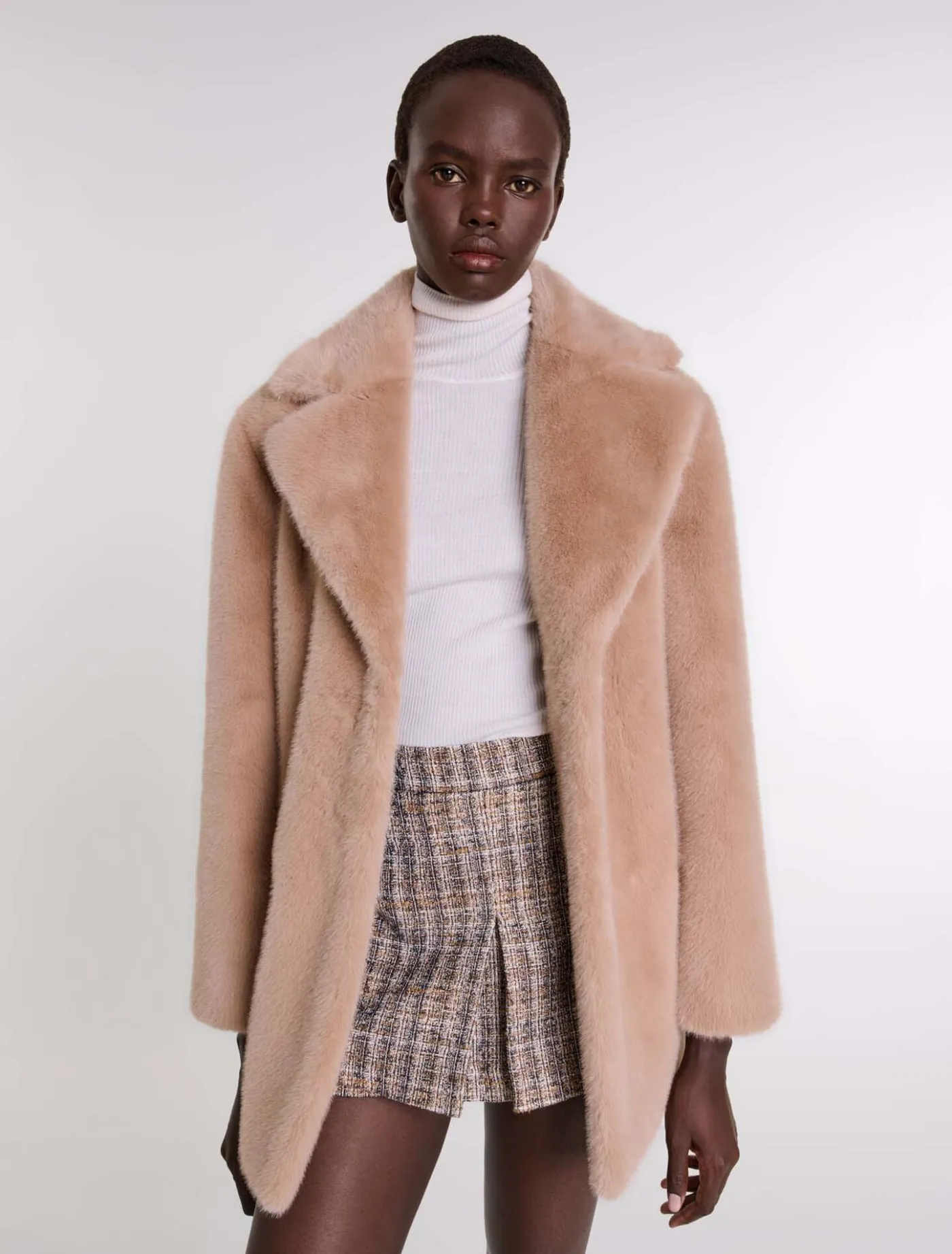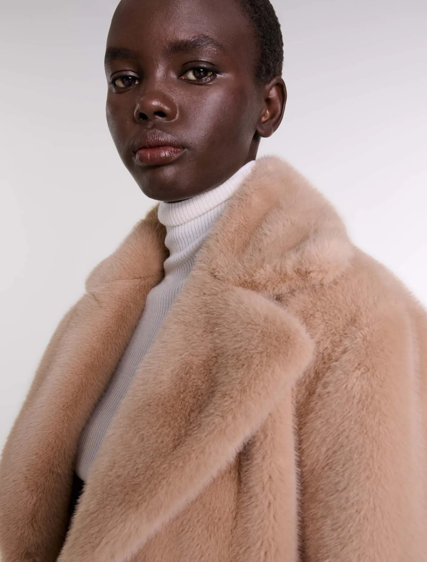 This fully lined, mid-length coat in ultra-soft fur creates an elegant, structured silhouette. Featuring long sleeves, two pockets and a lapel collar, it can be trimmed with a tie belt for a fitted or casual look.