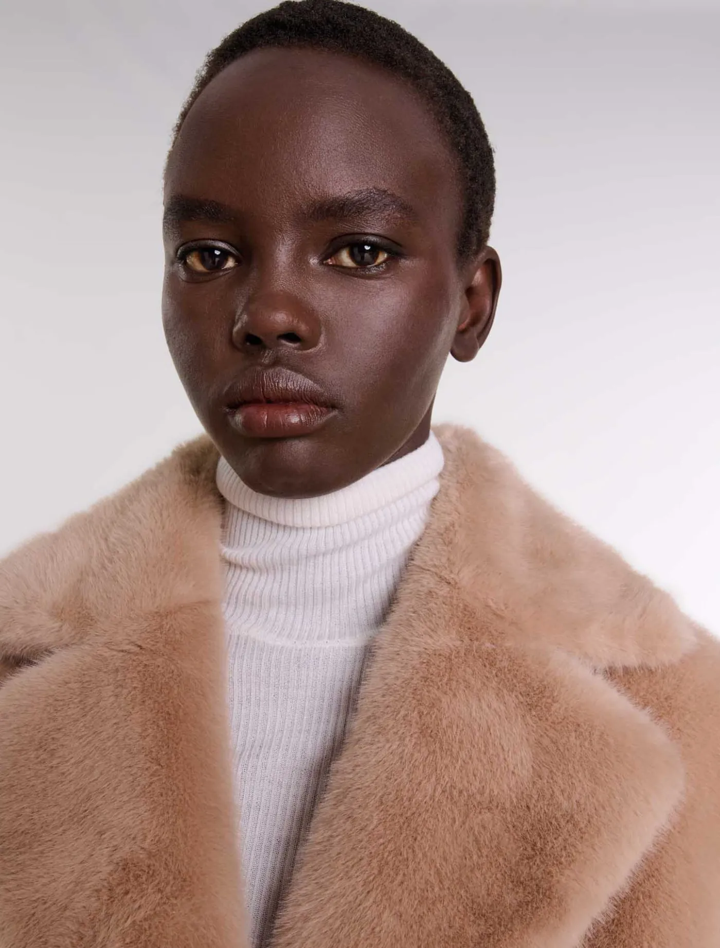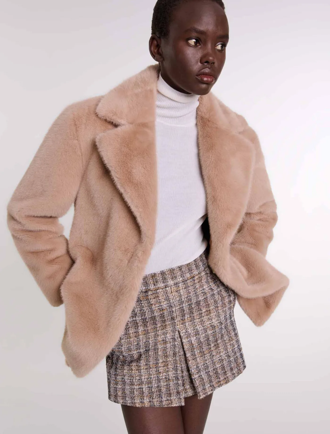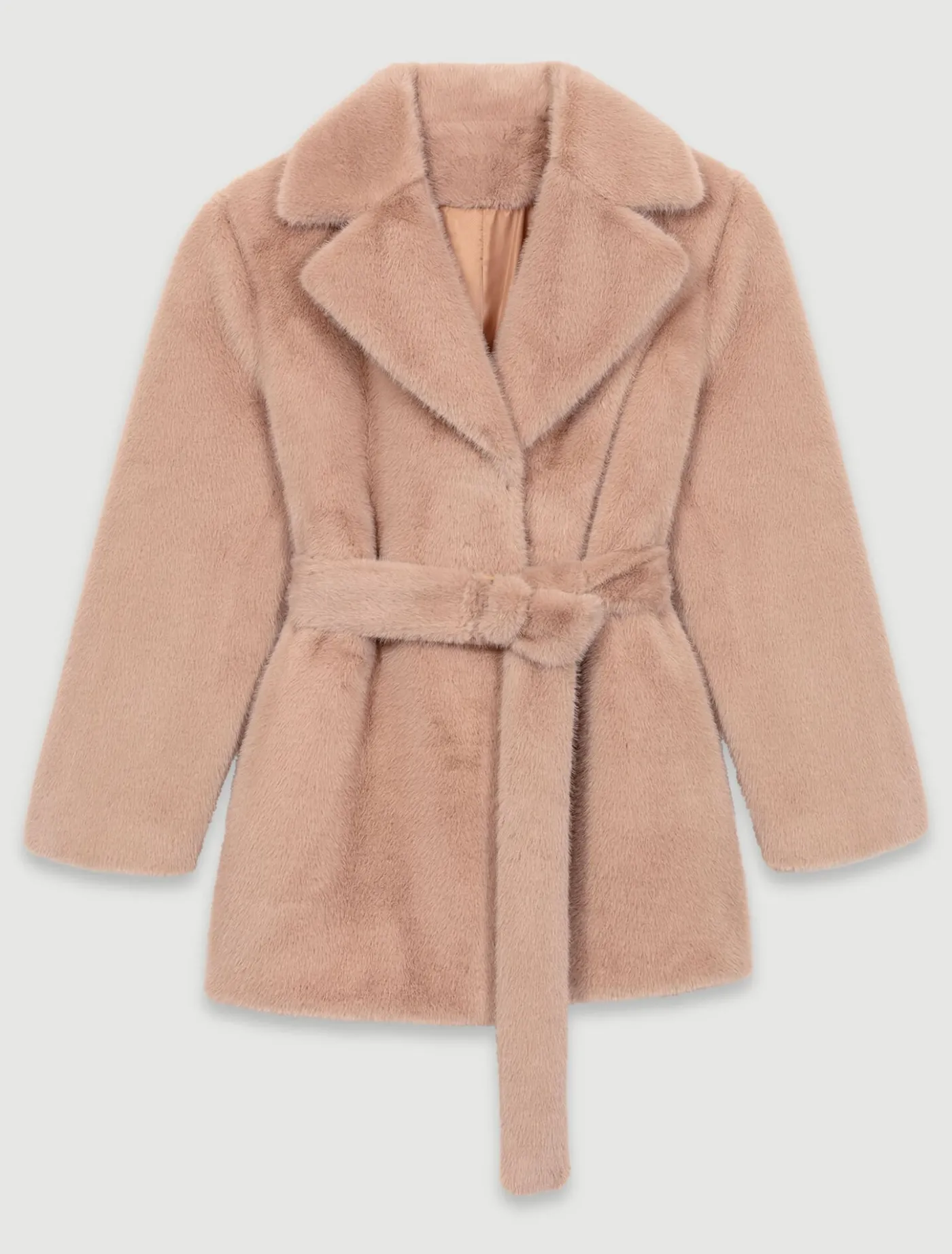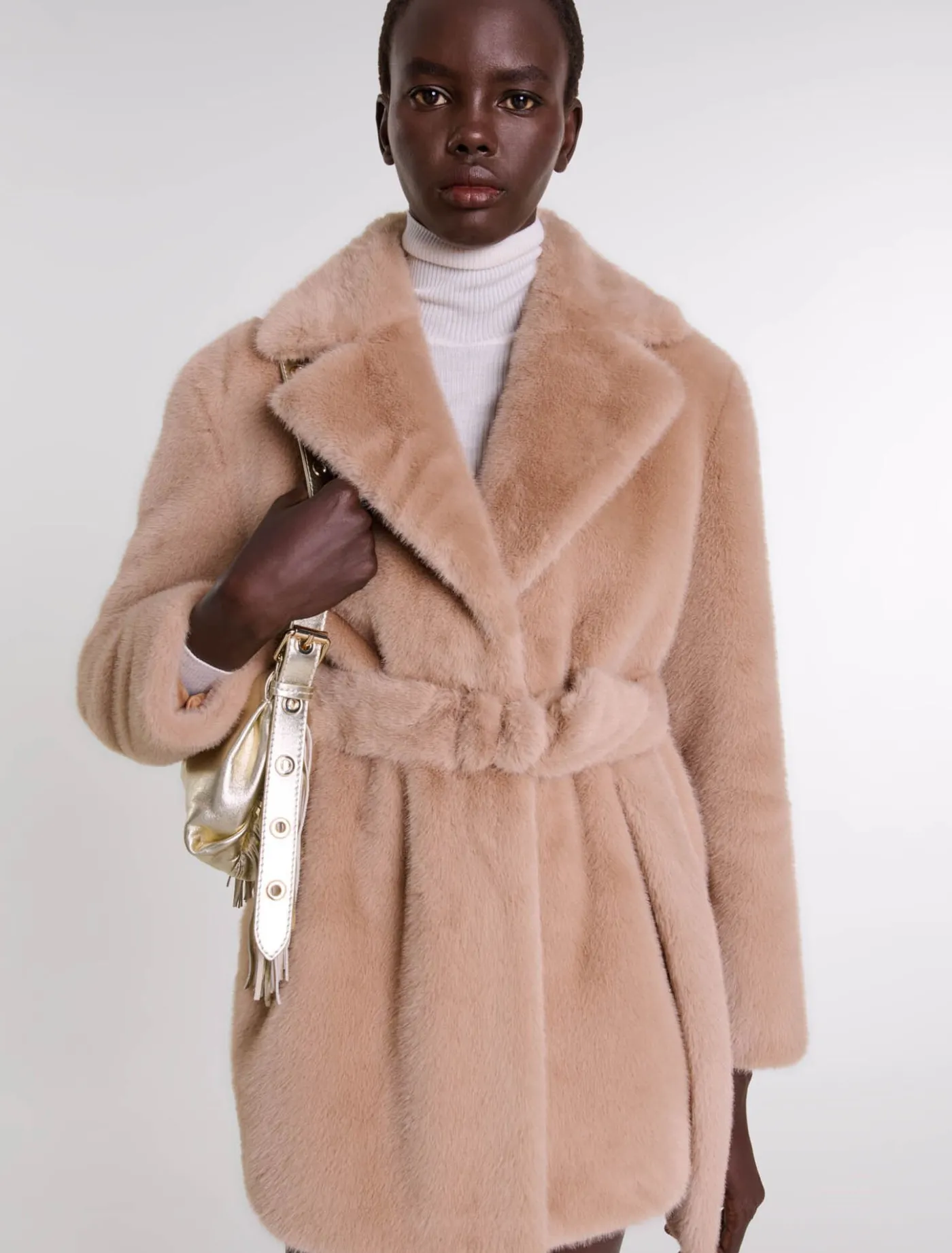 This fully lined, mid-length coat in ultra-soft fur creates an elegant, structured silhouette. Featuring long sleeves, two pockets and a lapel collar, it can be trimmed with a tie belt for a fitted or casual look.