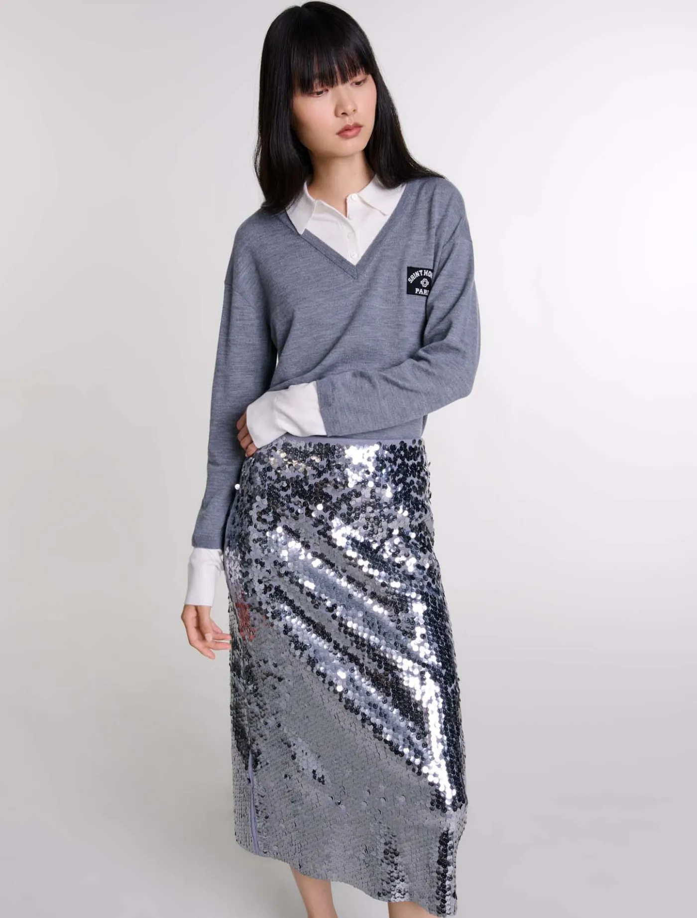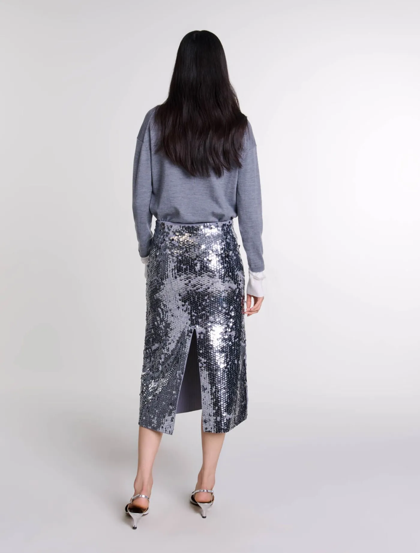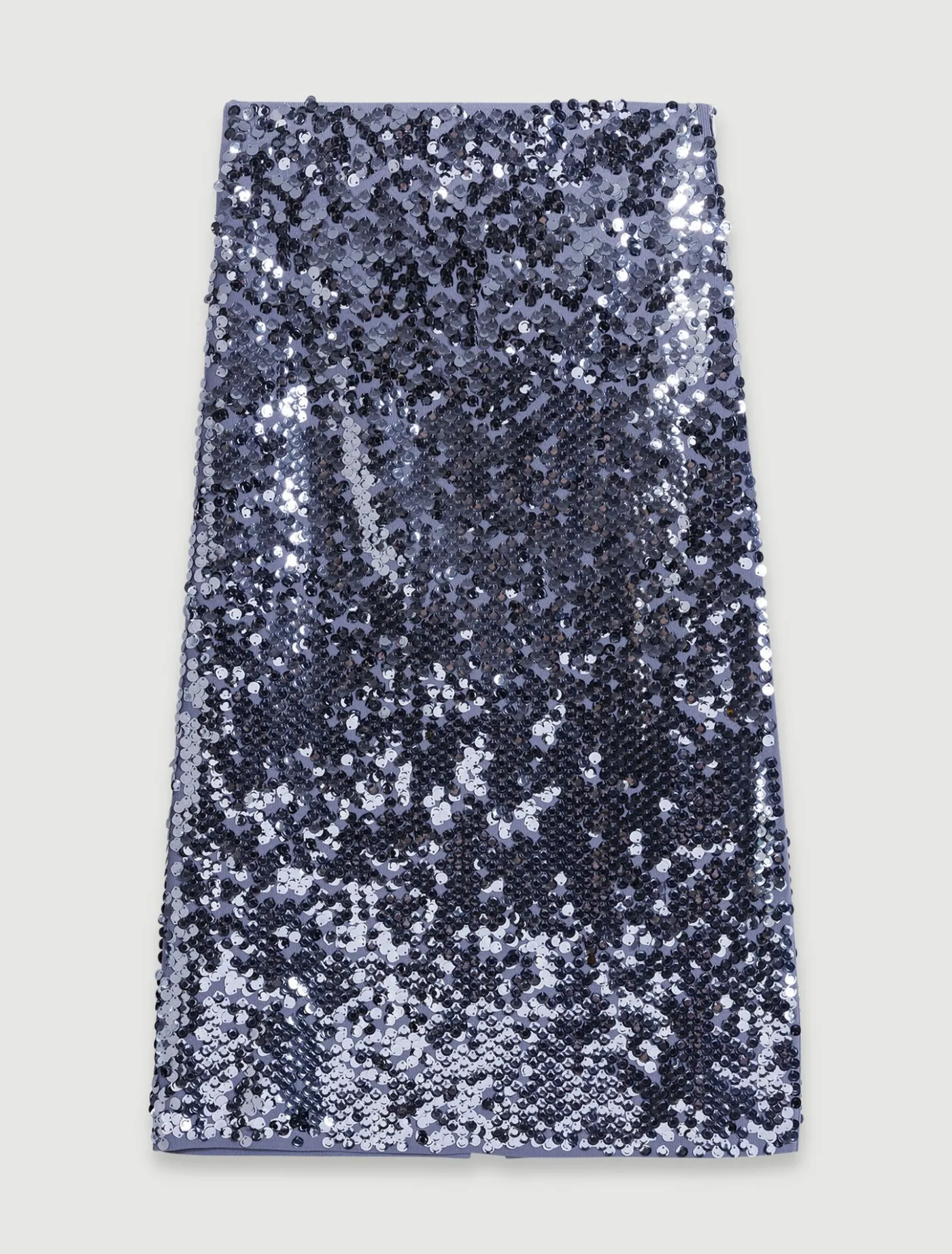 Made from stretch fabric, this straight-fit midi skirt is embellished with all-over silver sequins, brightening up your look with every step. With their side zip fastening, they flatter the figure and feature a bold slit at the back.