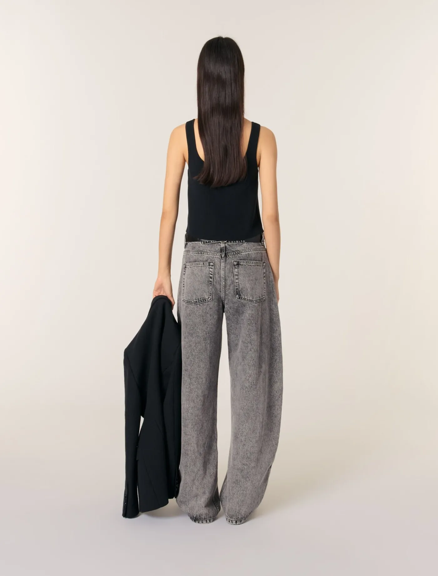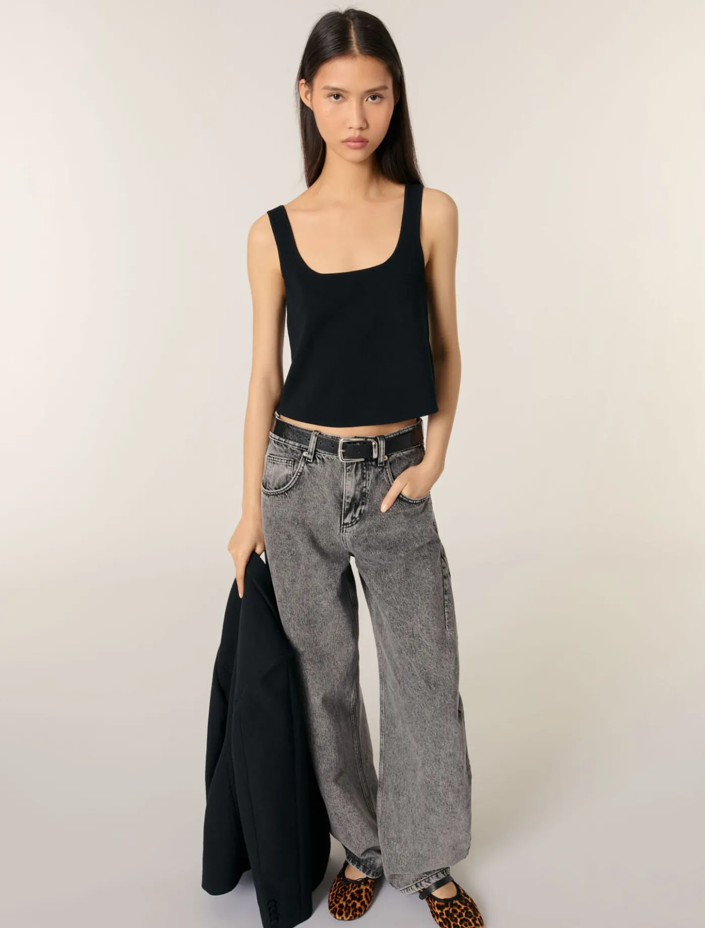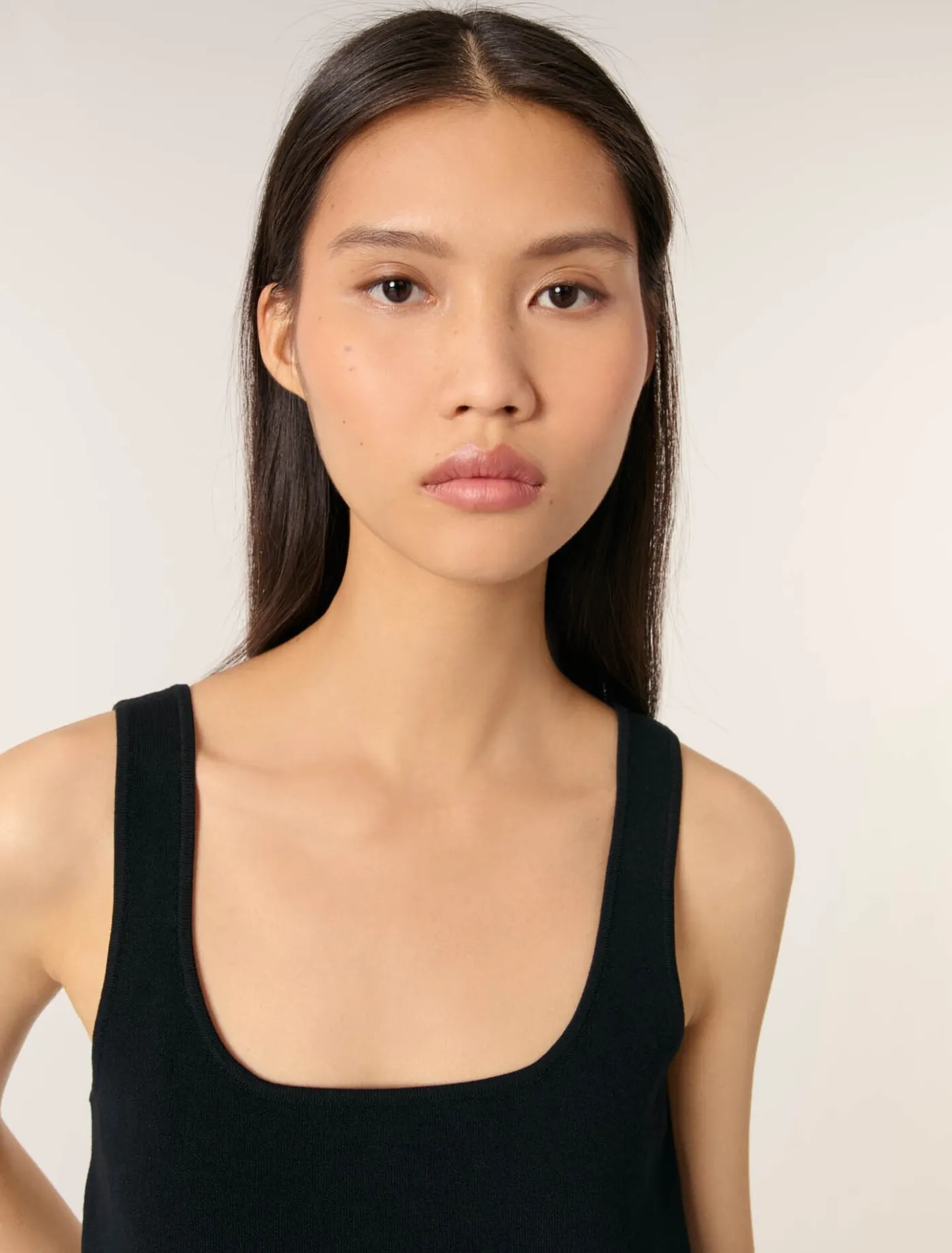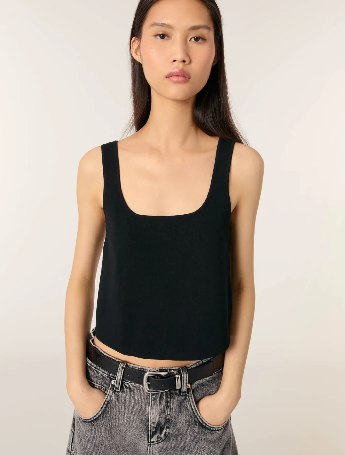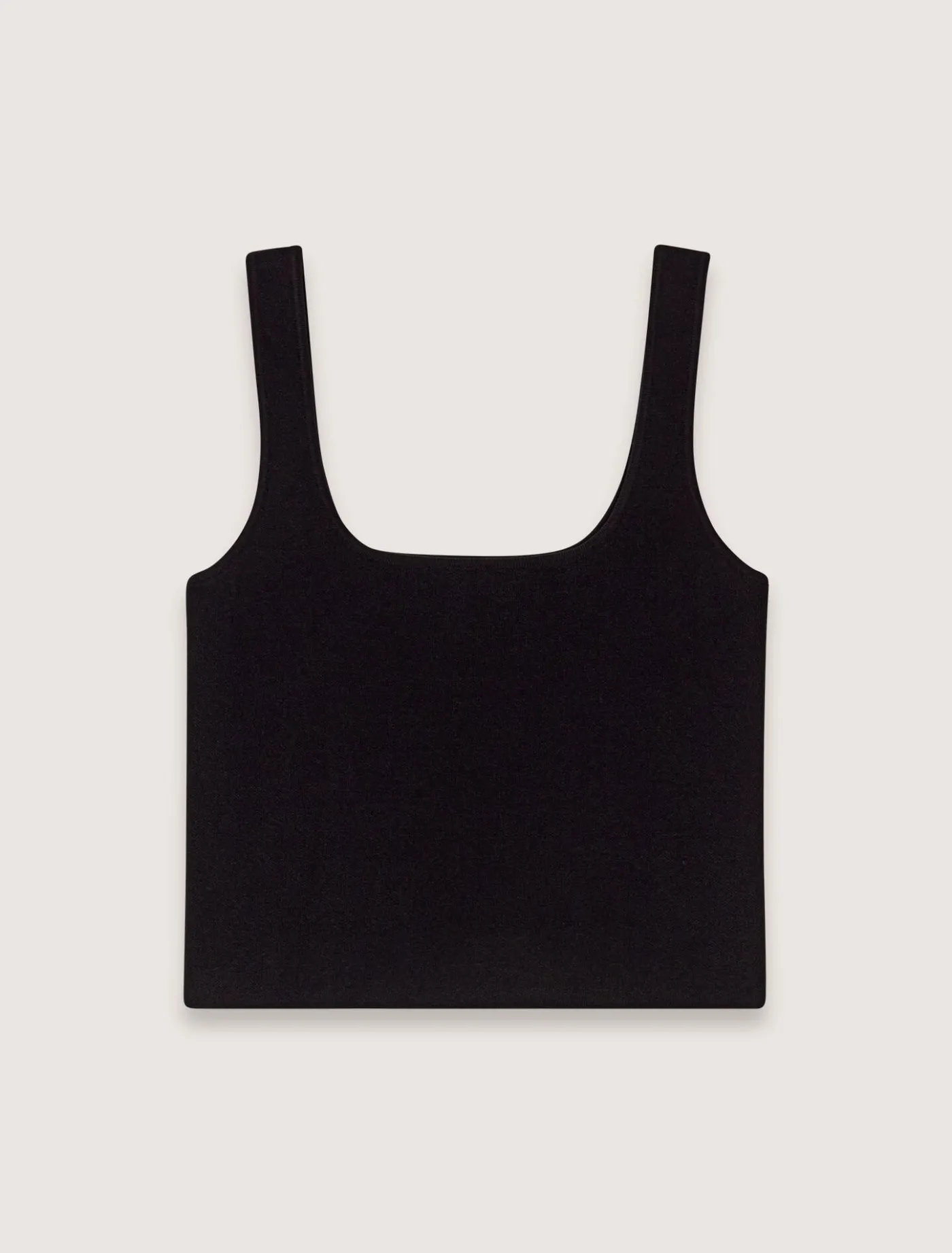 This stretch-knit crop top can be worn like a second skin. A square neckline and wide straps create a minimalist, structured silhouette. A discreet and elegant metal Clover tag gives the back a distinctive style.