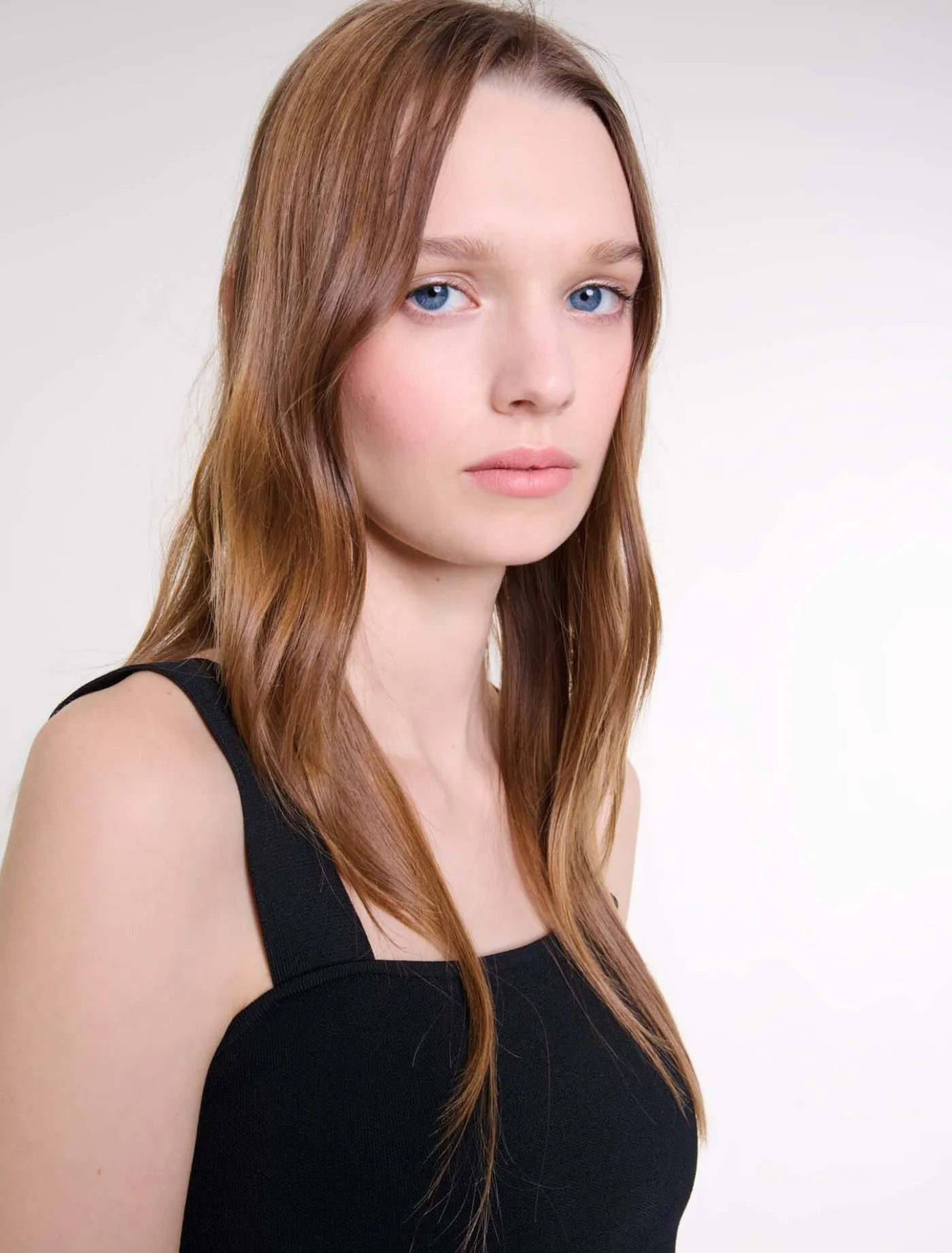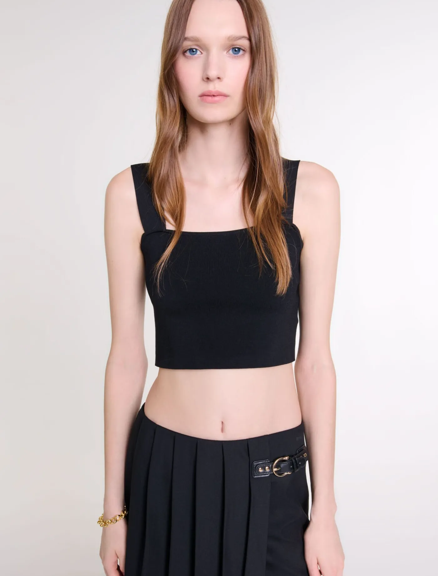 Close-fitting, short black knitted top. Plain-coloured stretch knit fabric. Wide straps. Slightly square neckline. Can be worn with the JACLYNA knitted skirt to complete the look.