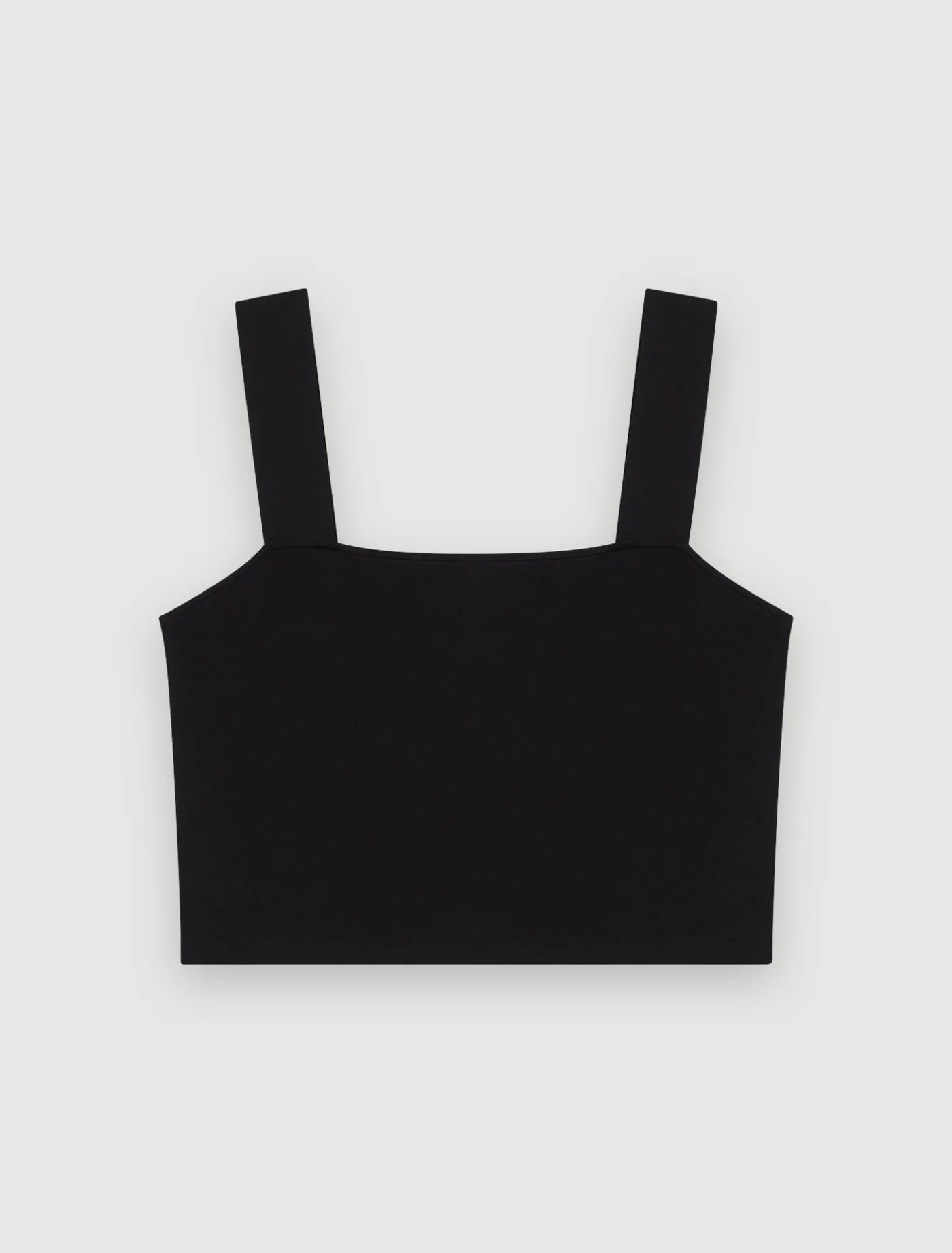 Close-fitting, short black knitted top. Plain-coloured stretch knit fabric. Wide straps. Slightly square neckline. Can b…