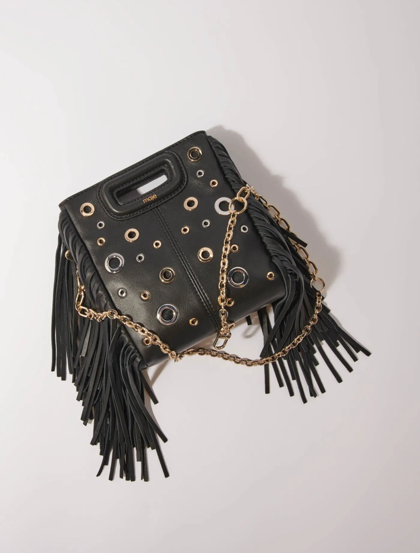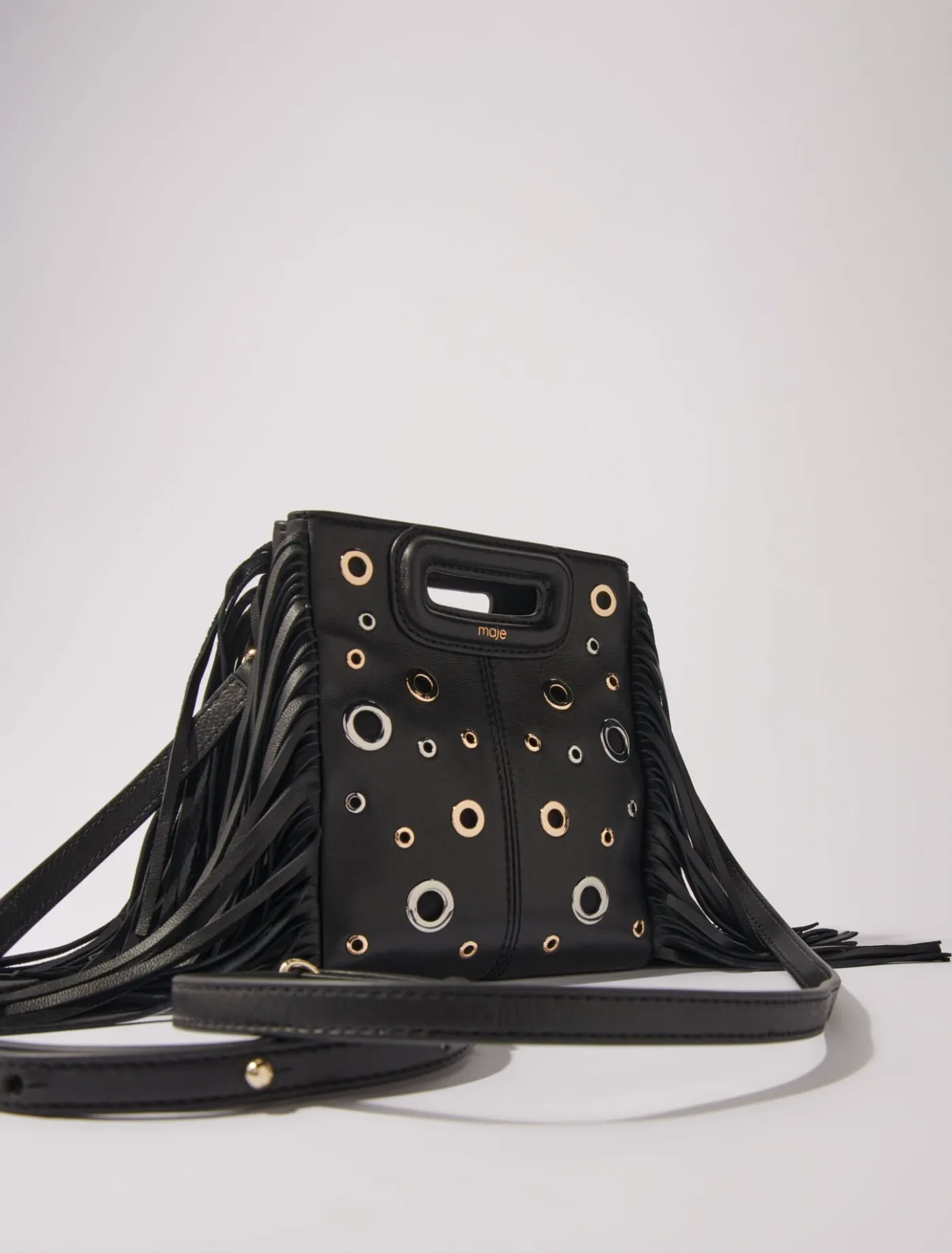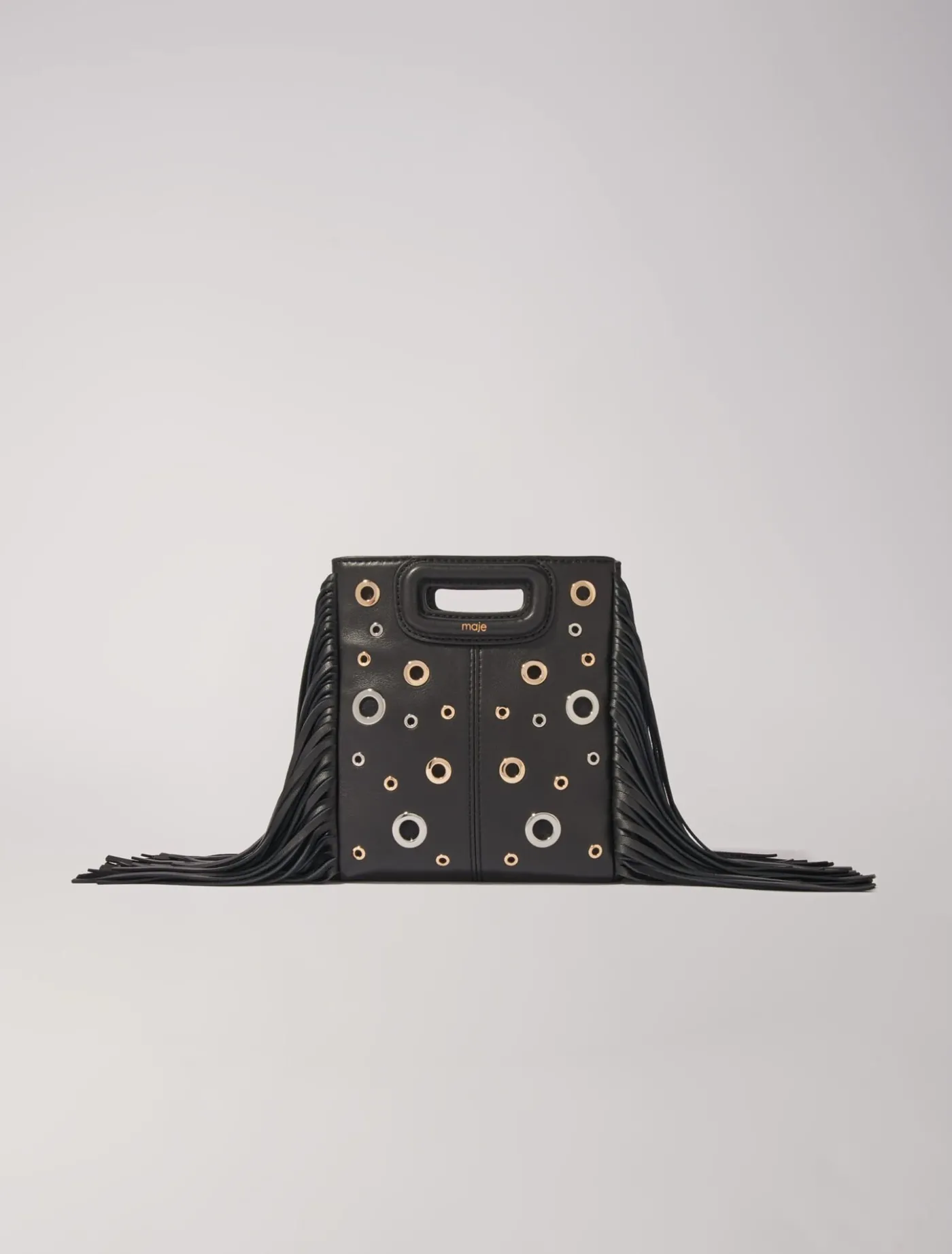 Maje’s iconic M bag comes in a mini version in plain leather accentuated with bi-colour eyelets. Embellished with fringe detailing on the sides and a sheathed handle, it features an embossed logo and a signature engraved on the lobster clasps. It has a practical magnetic fastening and an adjustable, removable strap that allows it to be carried in a variety of ways: by hand, on the shoulder or crossbody.