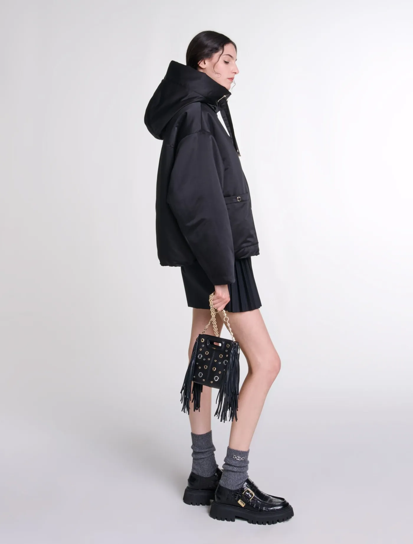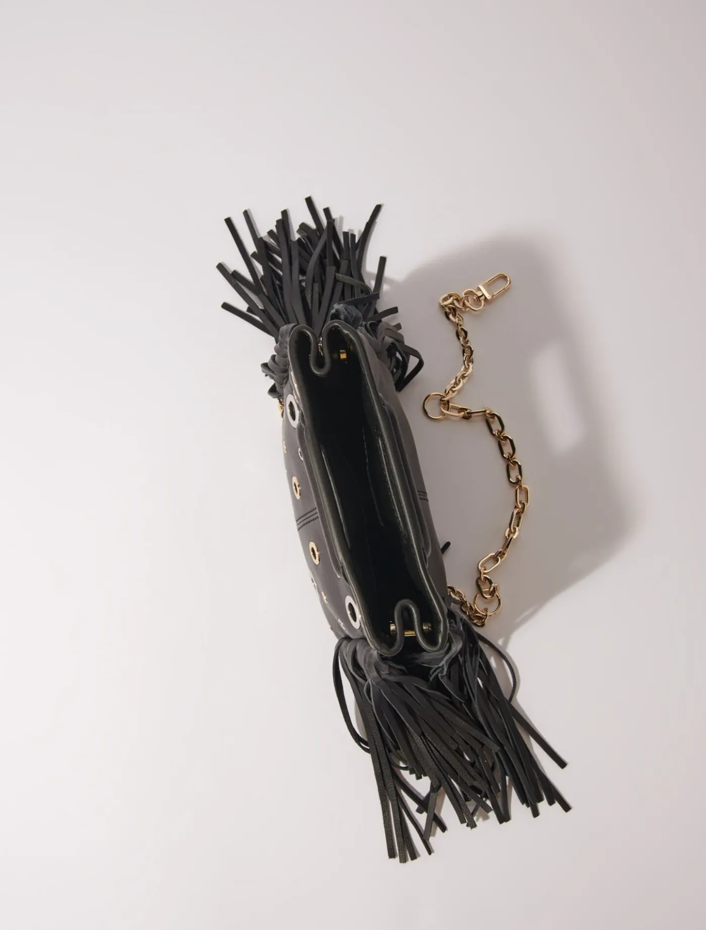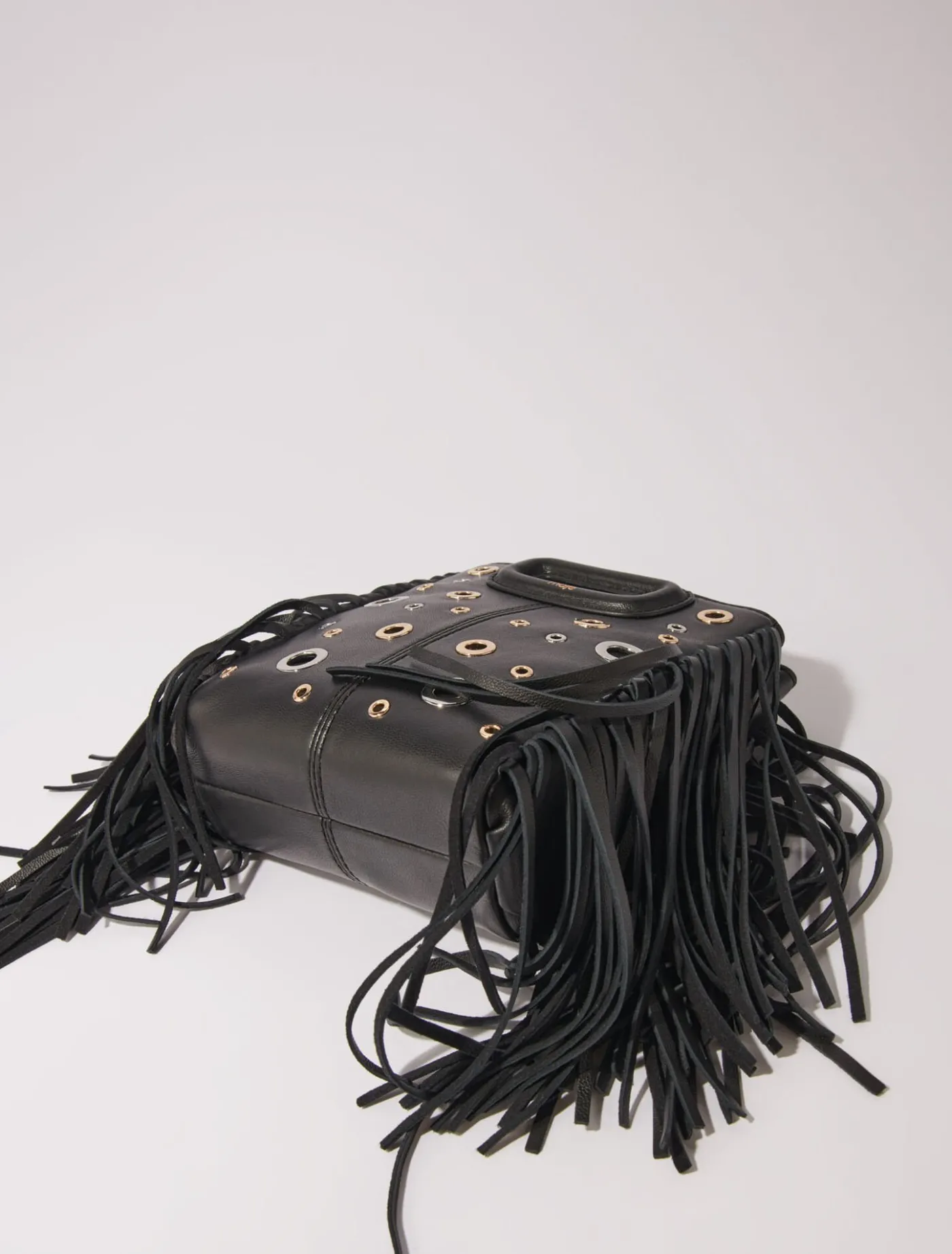 Maje’s iconic M bag comes in a mini version in plain leather accentuated with bi-colour eyelets. Embellished with fringe detailing on the sides and a sheathed handle, it features an embossed logo and a signature engraved on the lobster clasps. It has a practical magnetic fastening and an adjustable, removable strap that allows it to be carried in a variety of ways: by hand, on the shoulder or crossbody.
