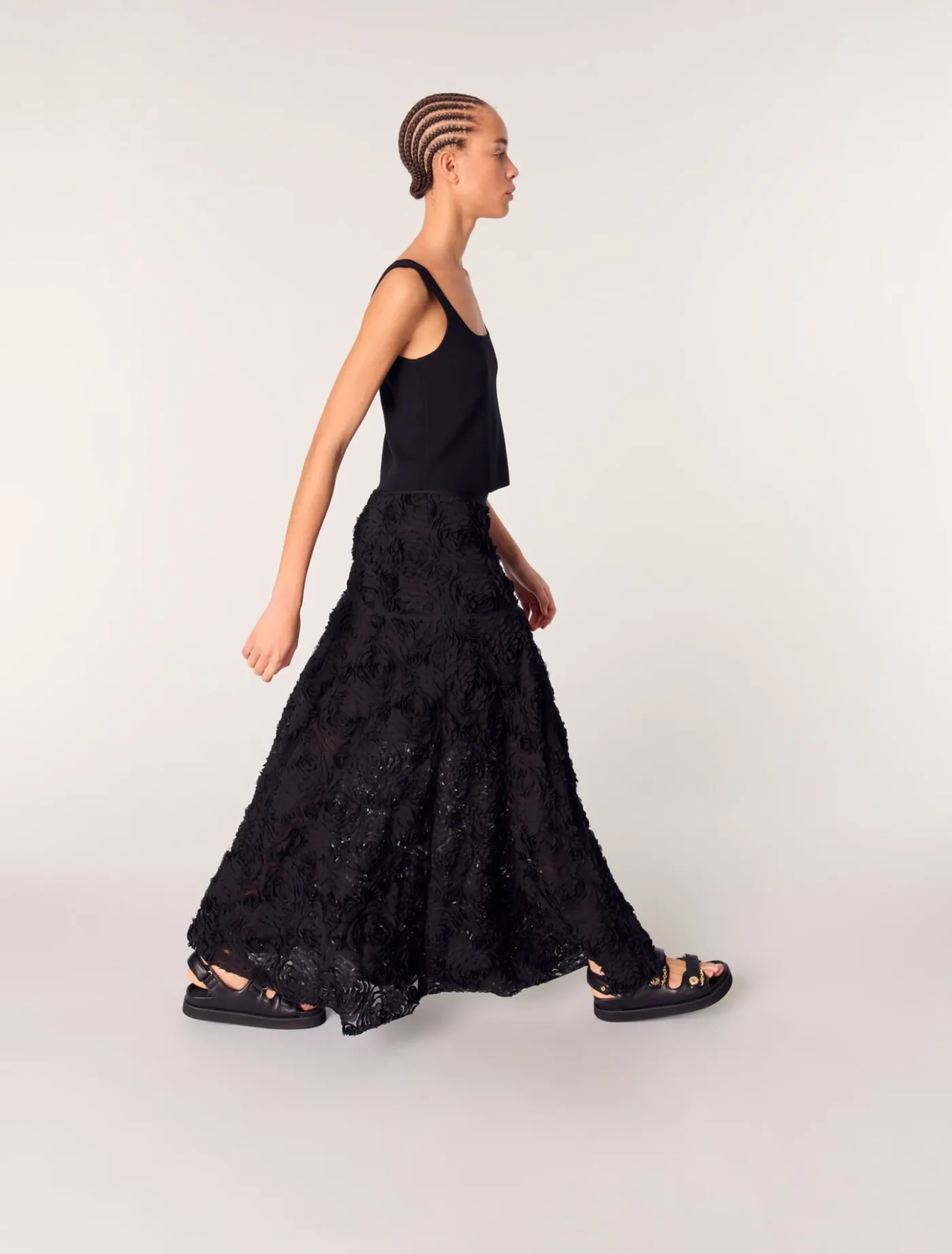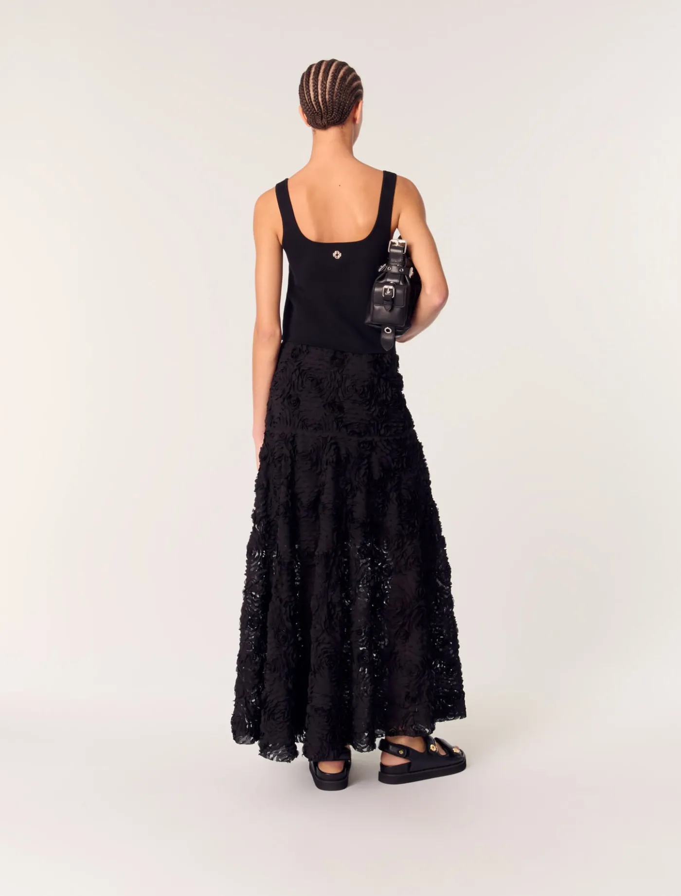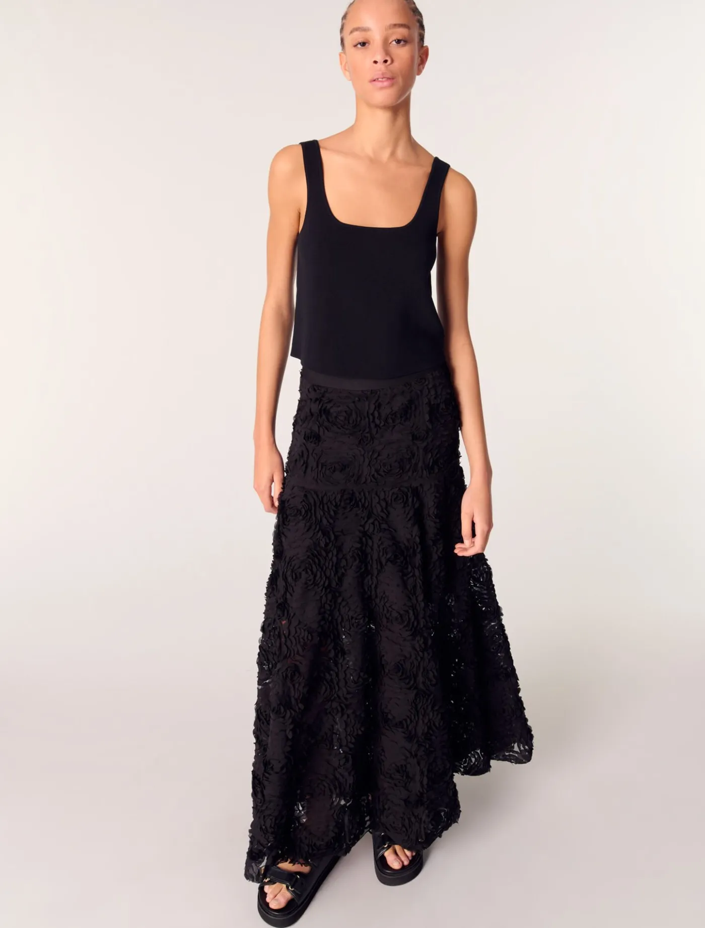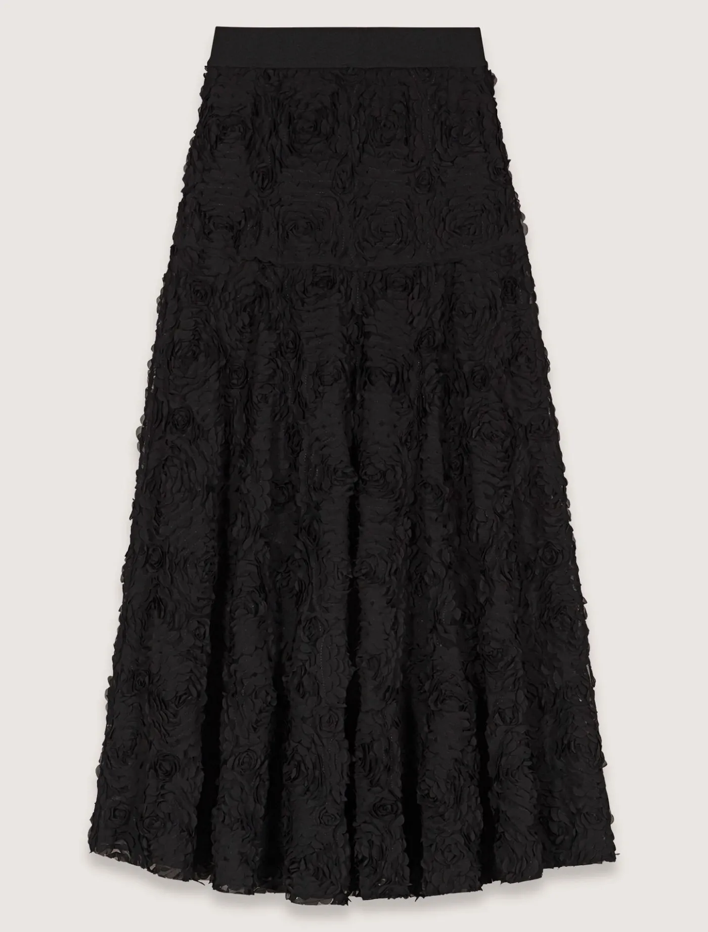This long skirt is made from tulle embellished with embroidered flowers. It has a full, flared style, for airy elegance with every step. It has a short lining for optimum comfort, and an elasticated waistband.