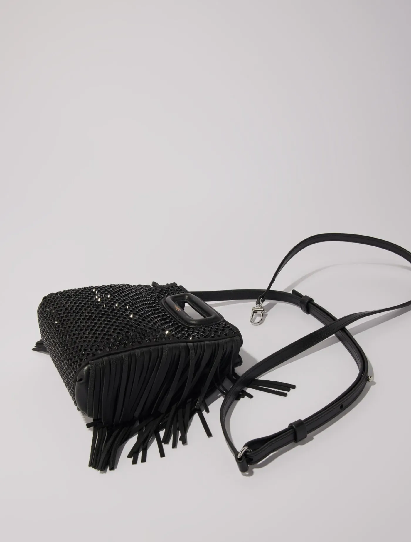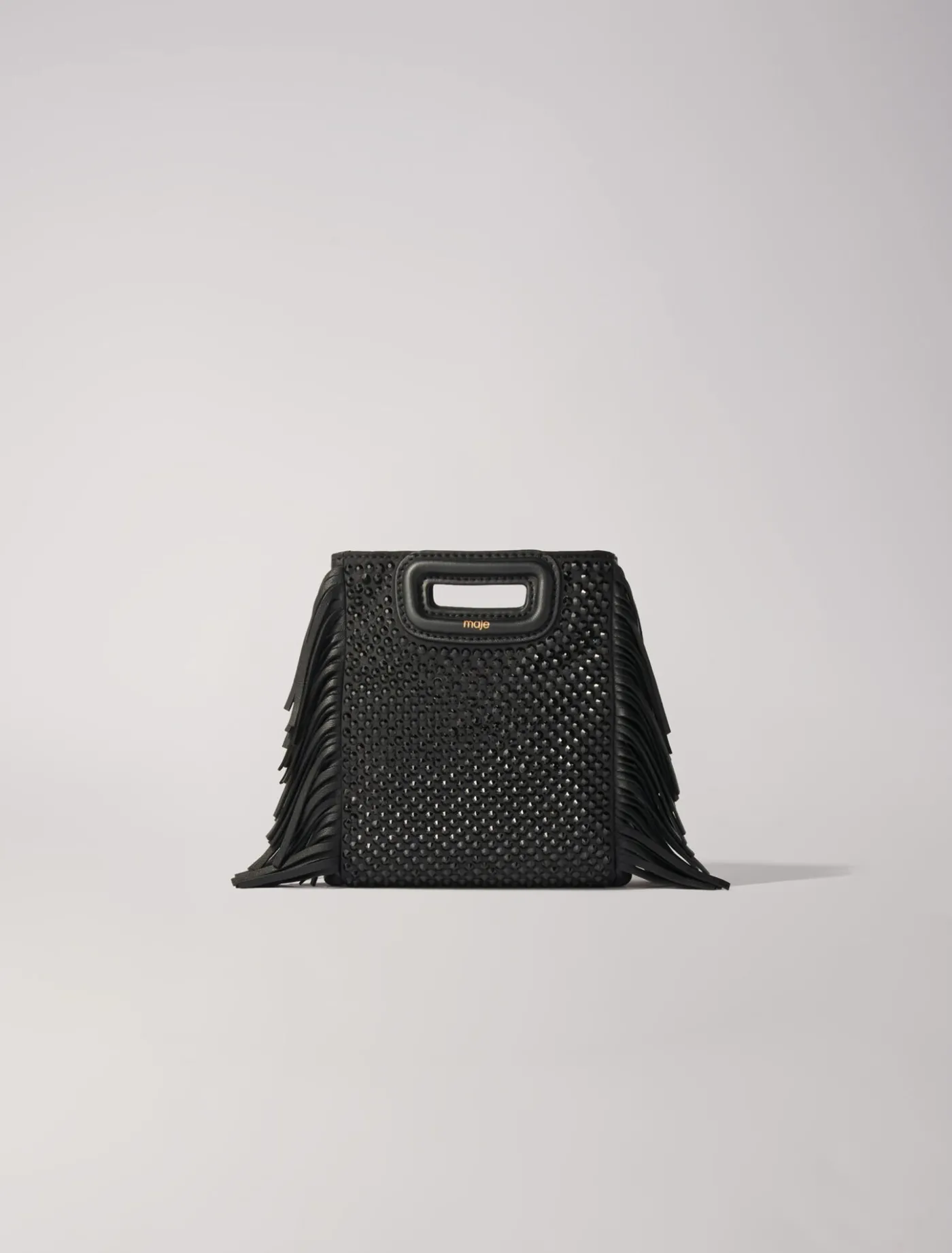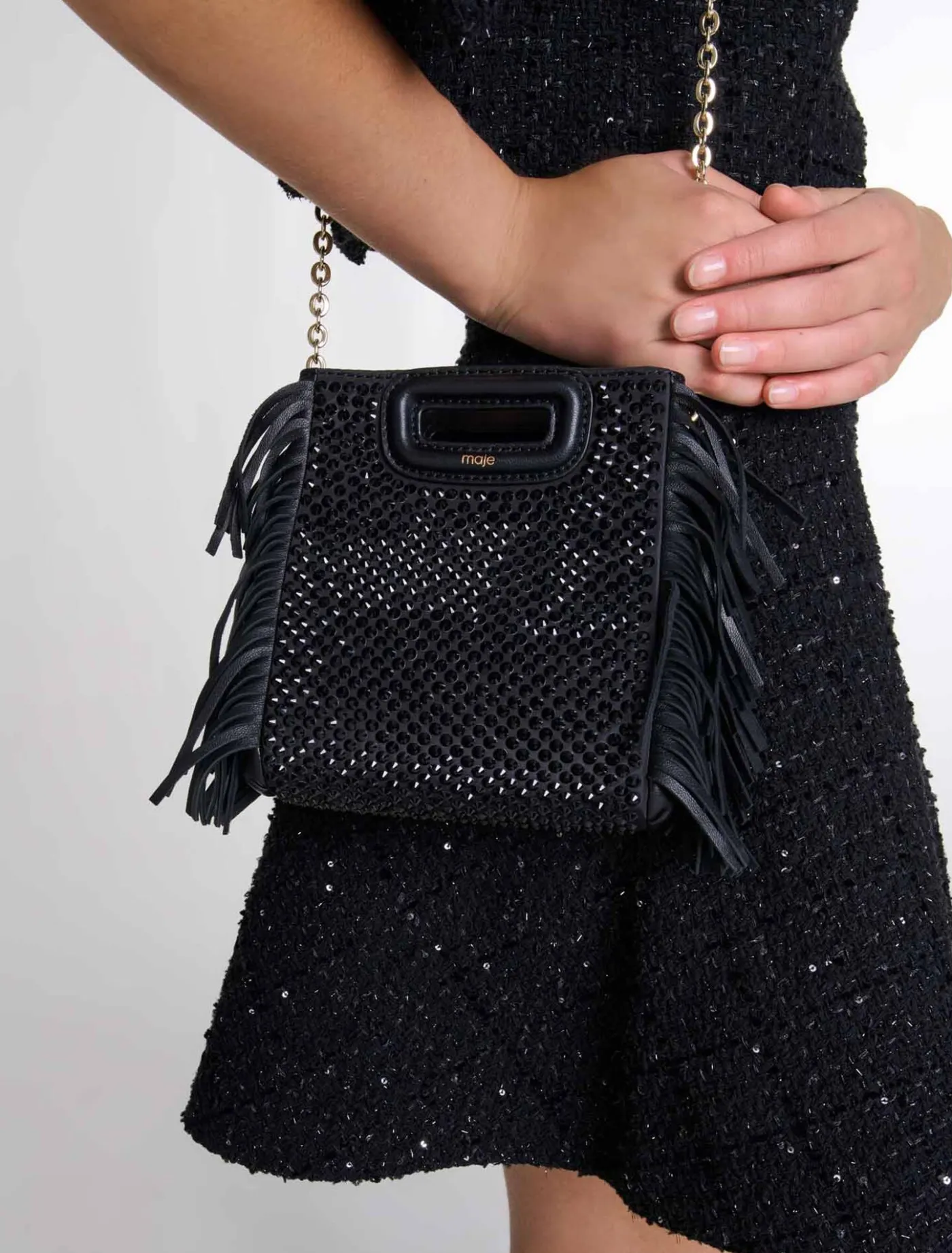 Maje’s iconic M bag comes in a mini version studded with all-over tone-on-tone rhinestones. Embellished with fringe detailing on the sides and a sheathed handle, it features an embossed logo and a signature engraved on the lobster clasps. It has a practical magnetic fastening and an adjustable, removable strap that allows it to be carried in a variety of ways: by hand, on the shoulder or crossbody.
