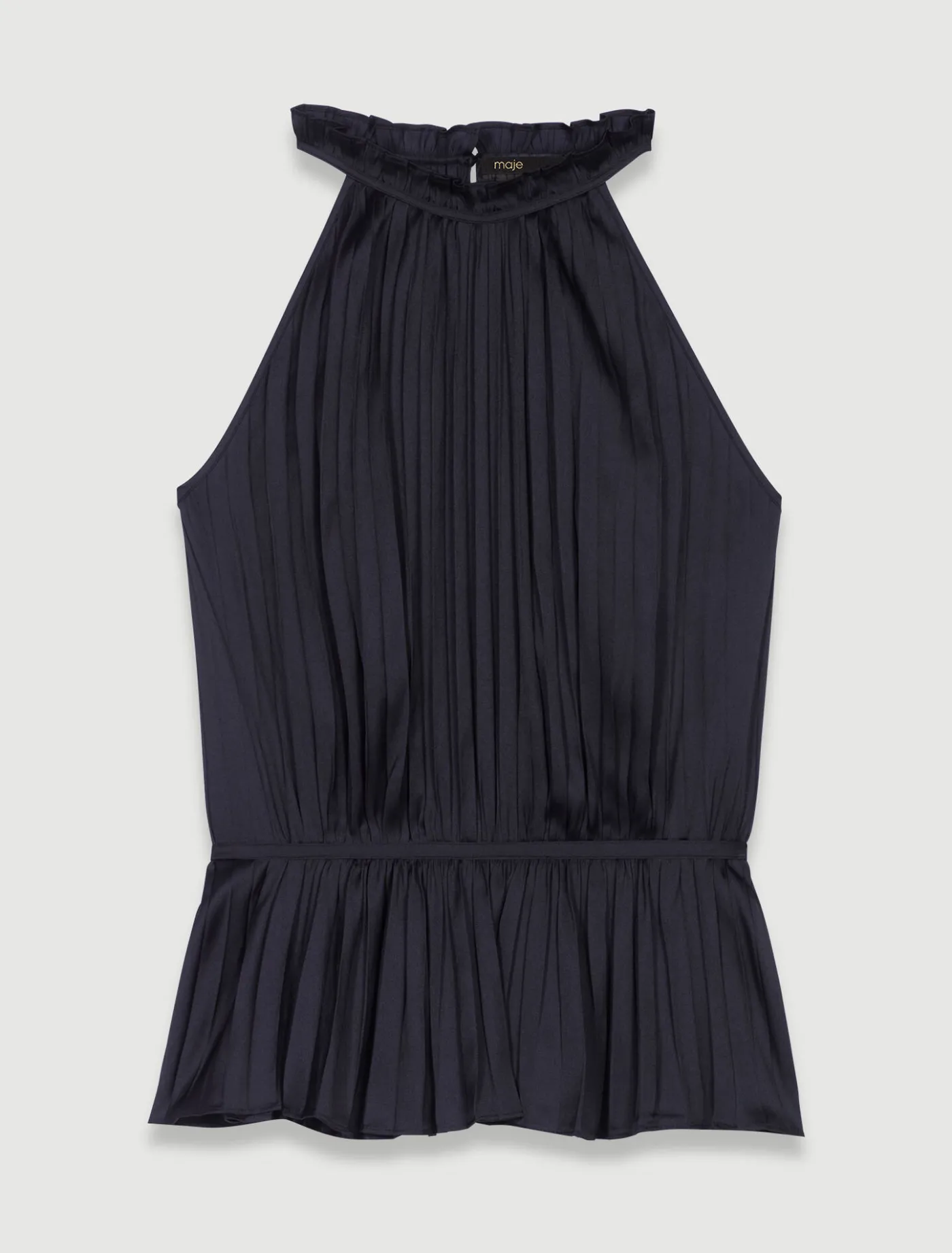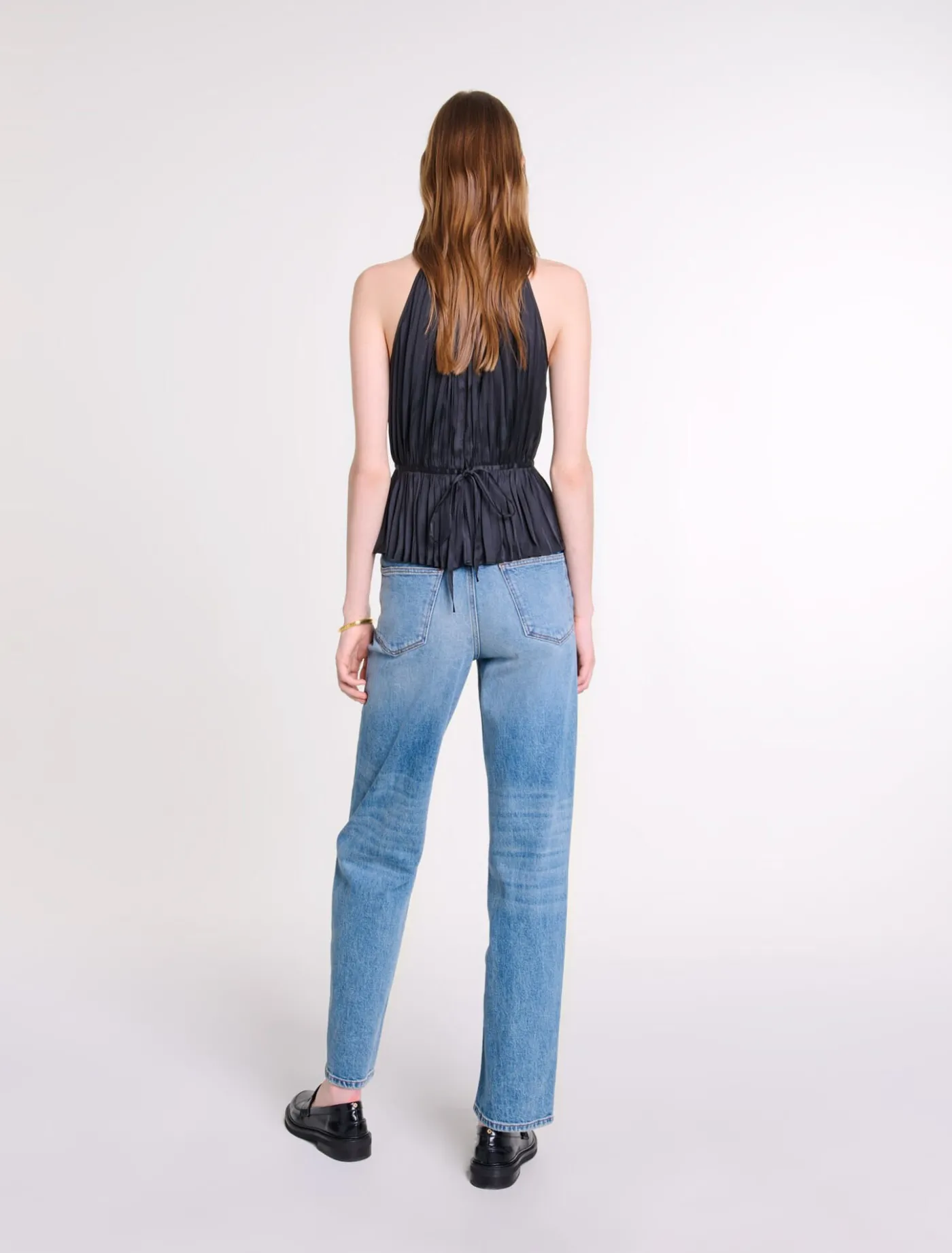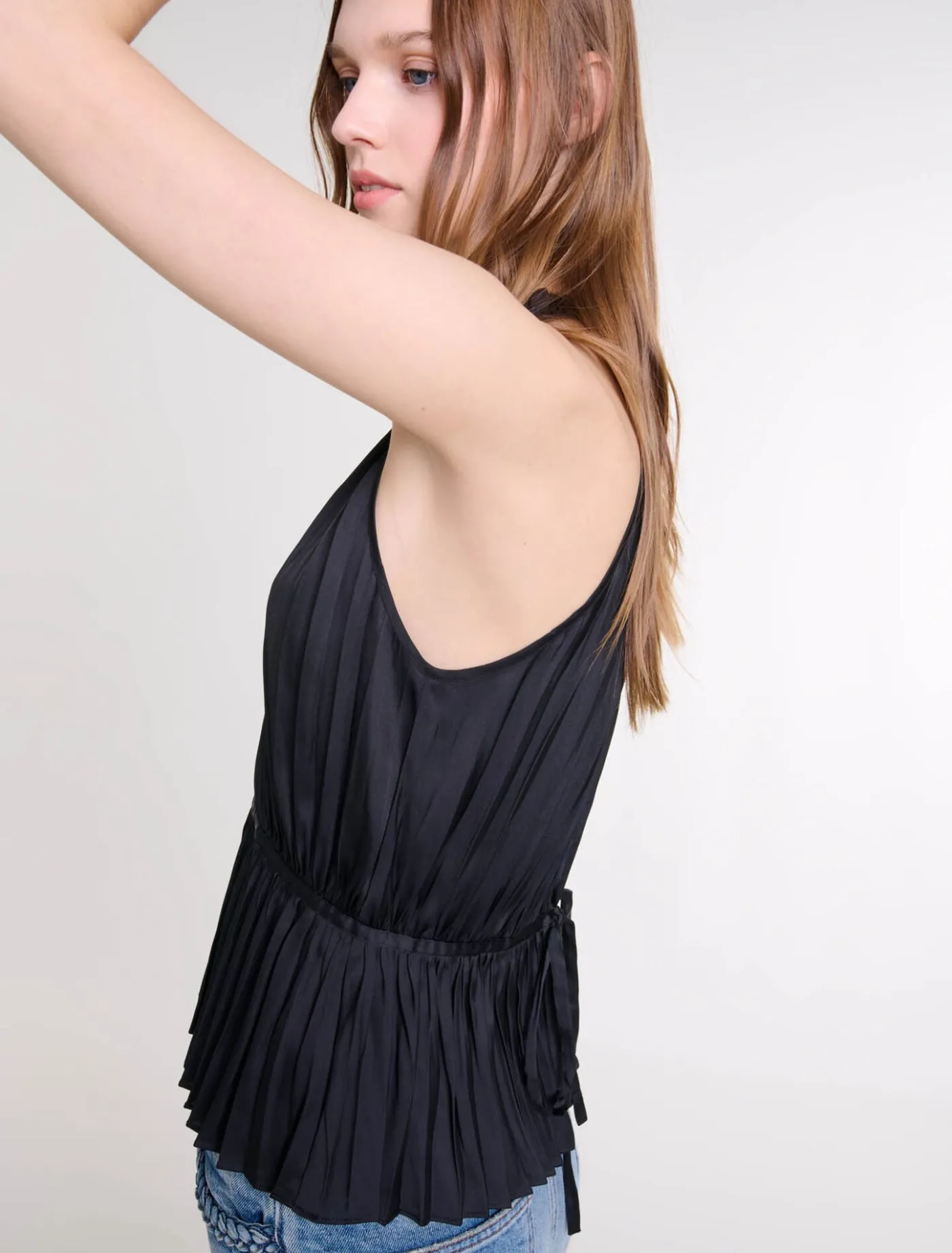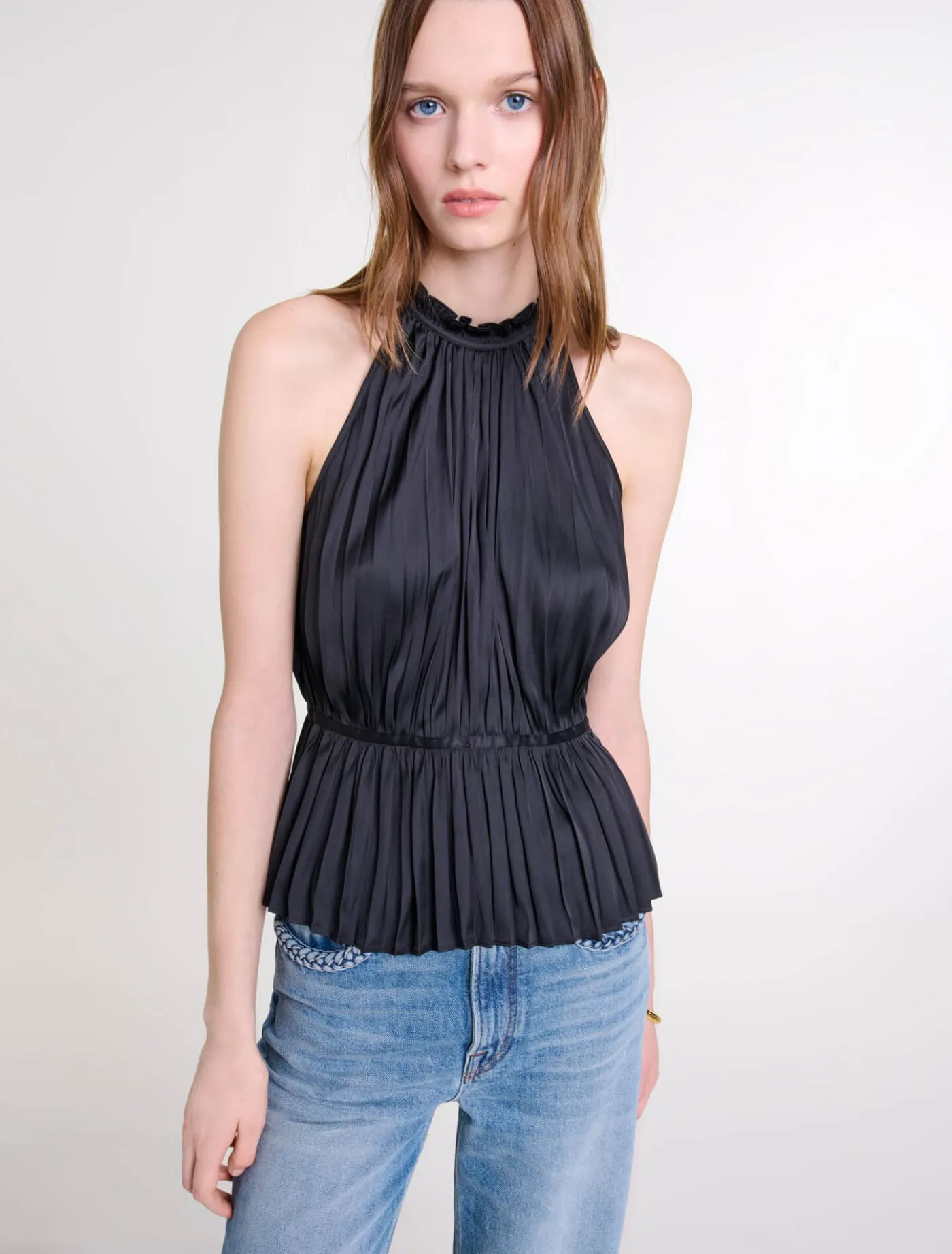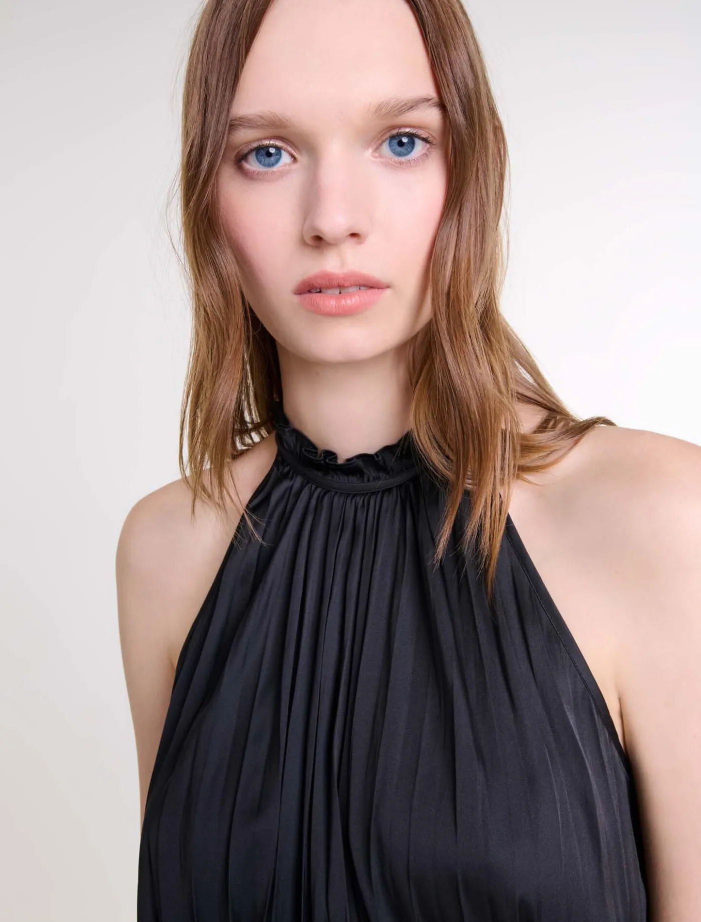 This elegant straight satin top with subtle pleats instantly lends style to your outfits. With American-style armholes and a covered button at the nape of the neck, it has a ruffled collar and an low back. With ties at the back, it creates a structured, fitted silhouette.