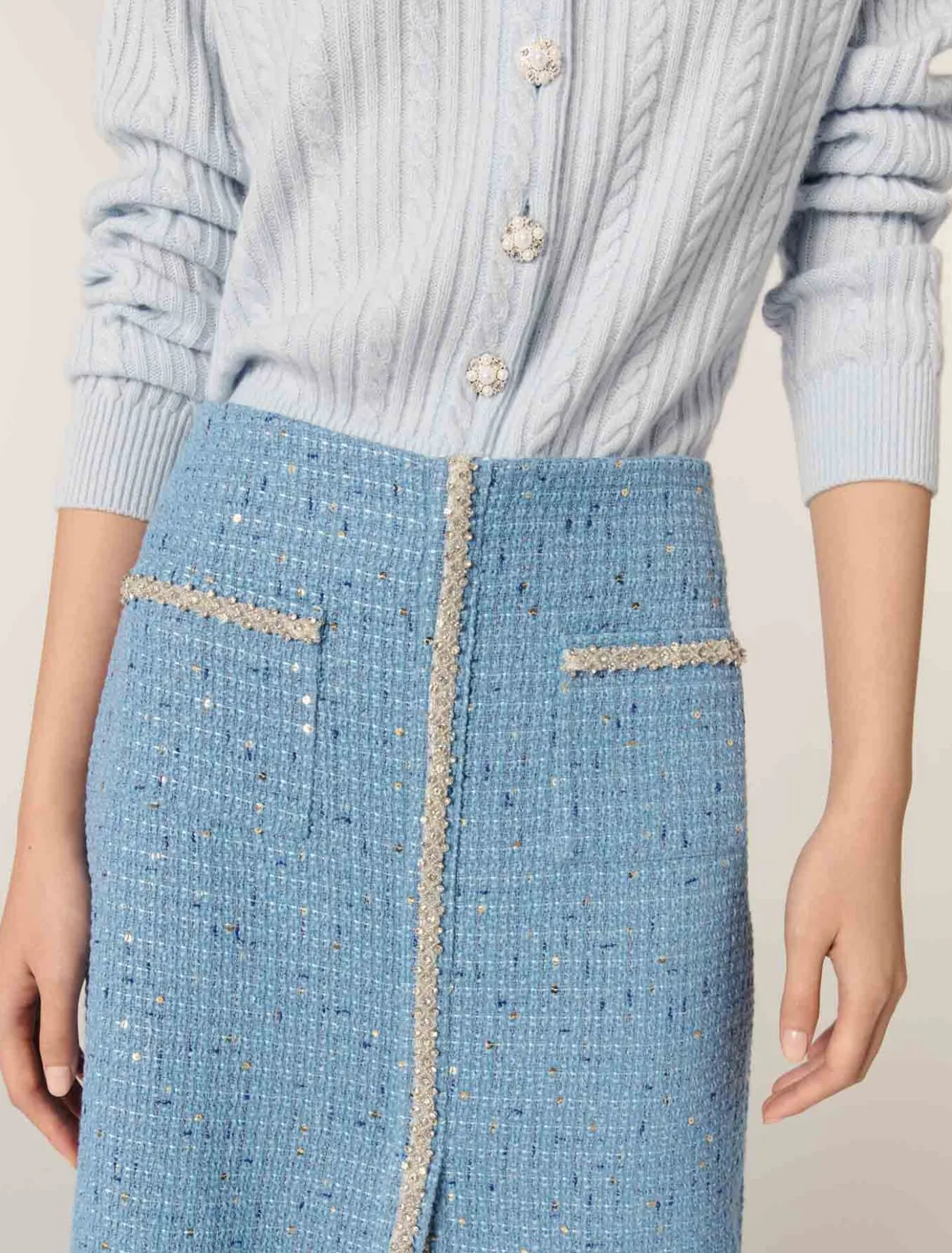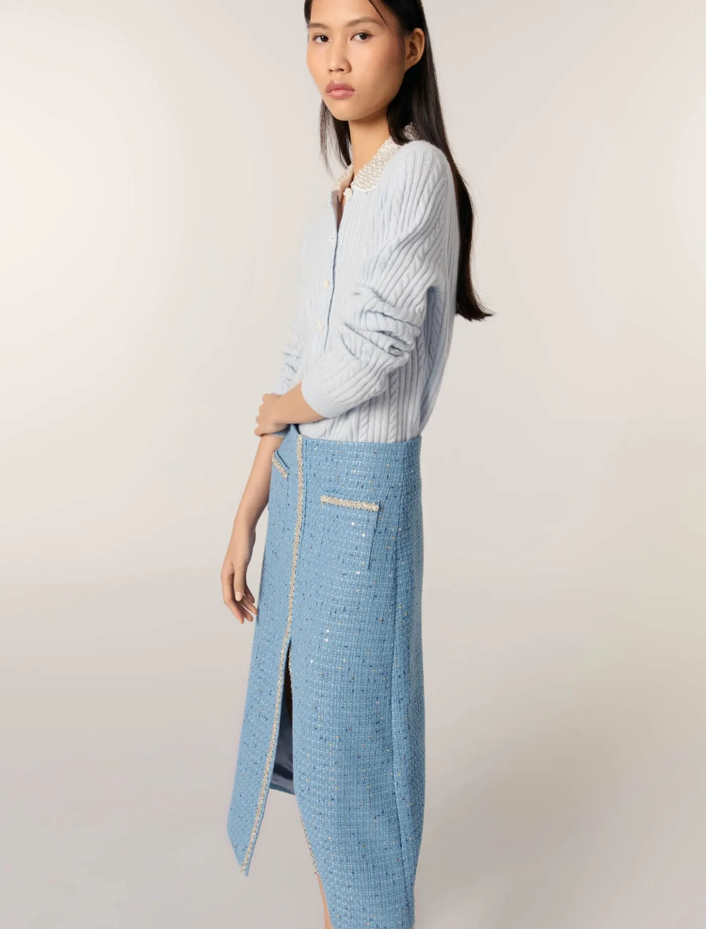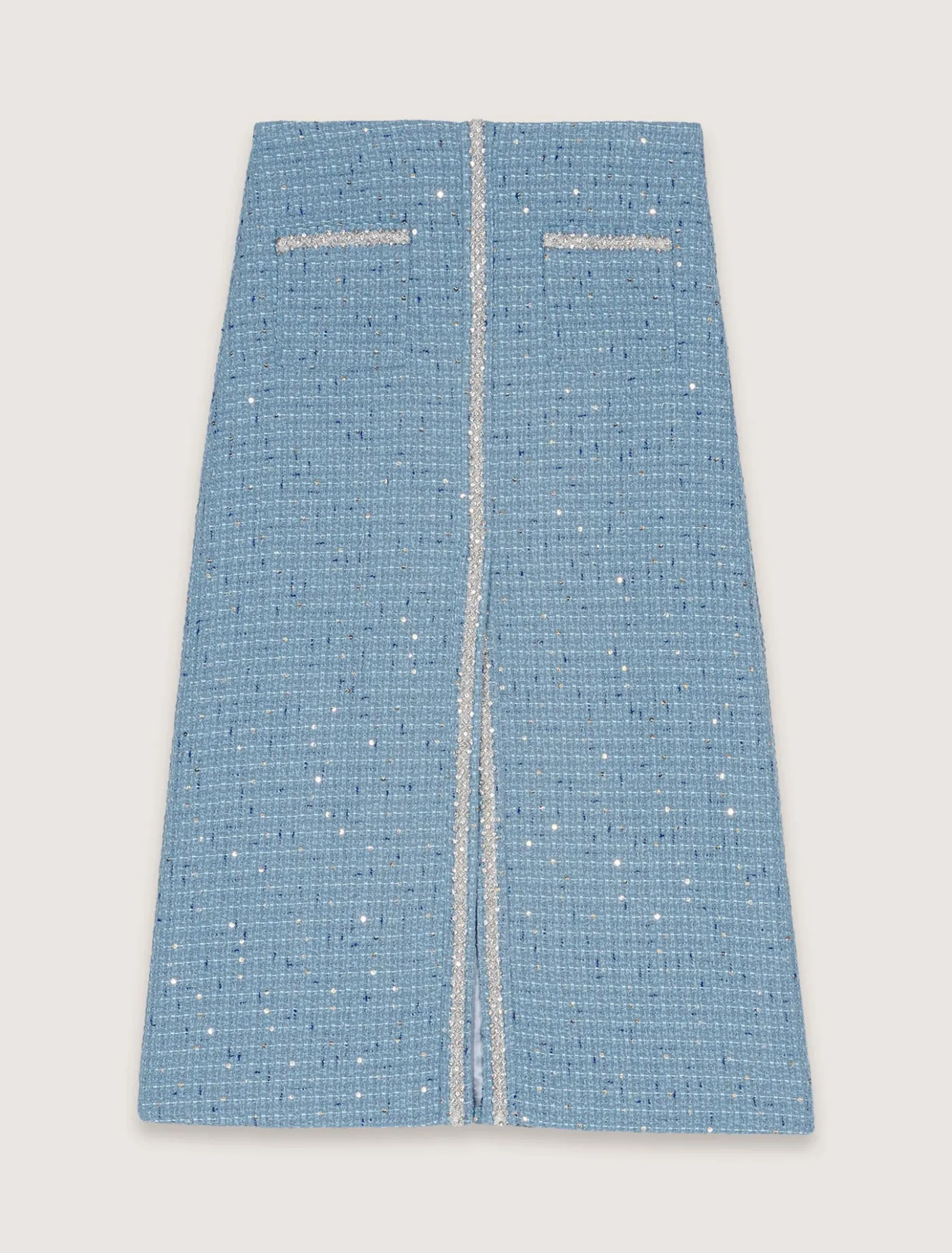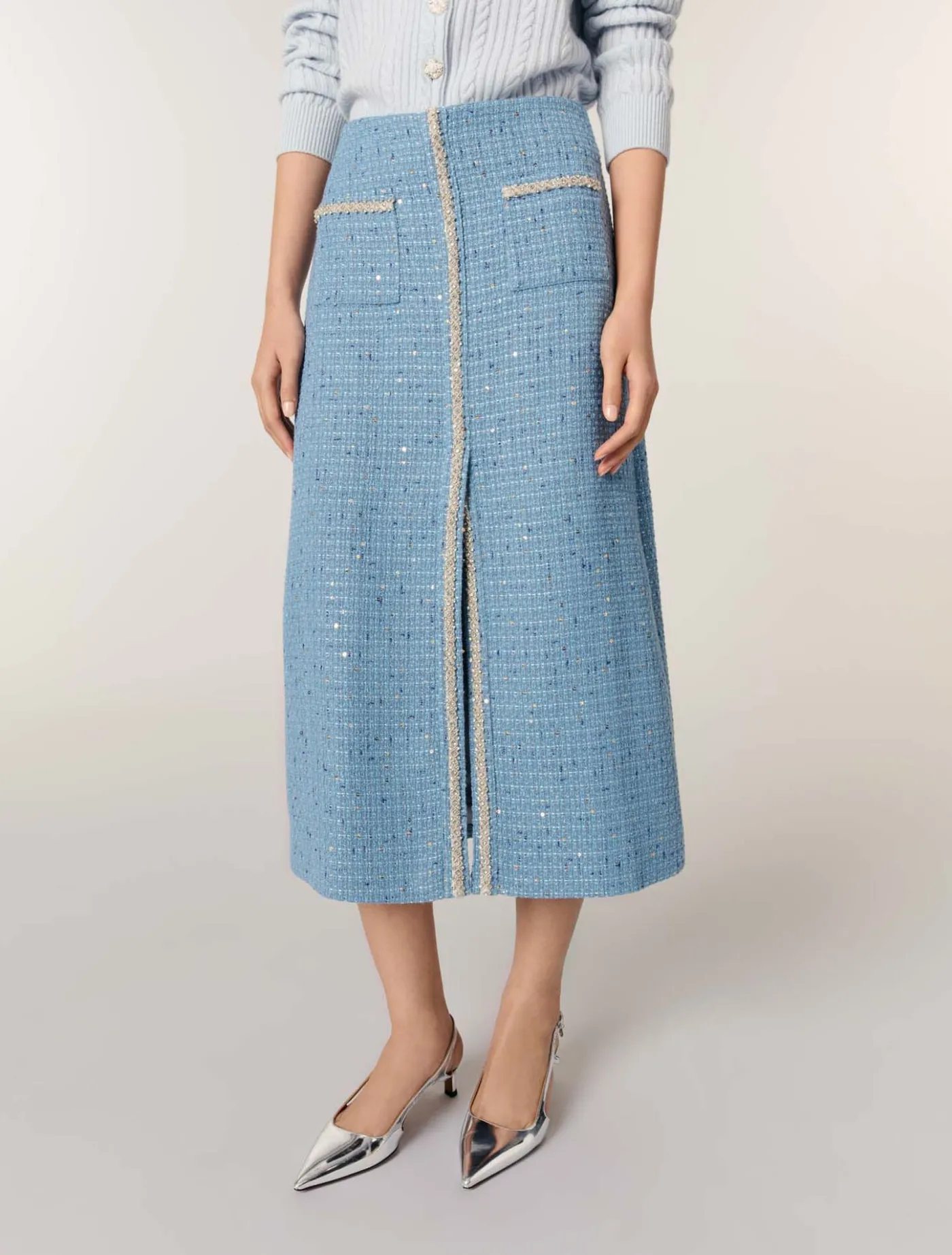Made from blue tweed with sequins, this midi skirt is lined with satin. Two patch pockets emphasise the high waist, while rhinestone trim and a front slit elongate your figure.