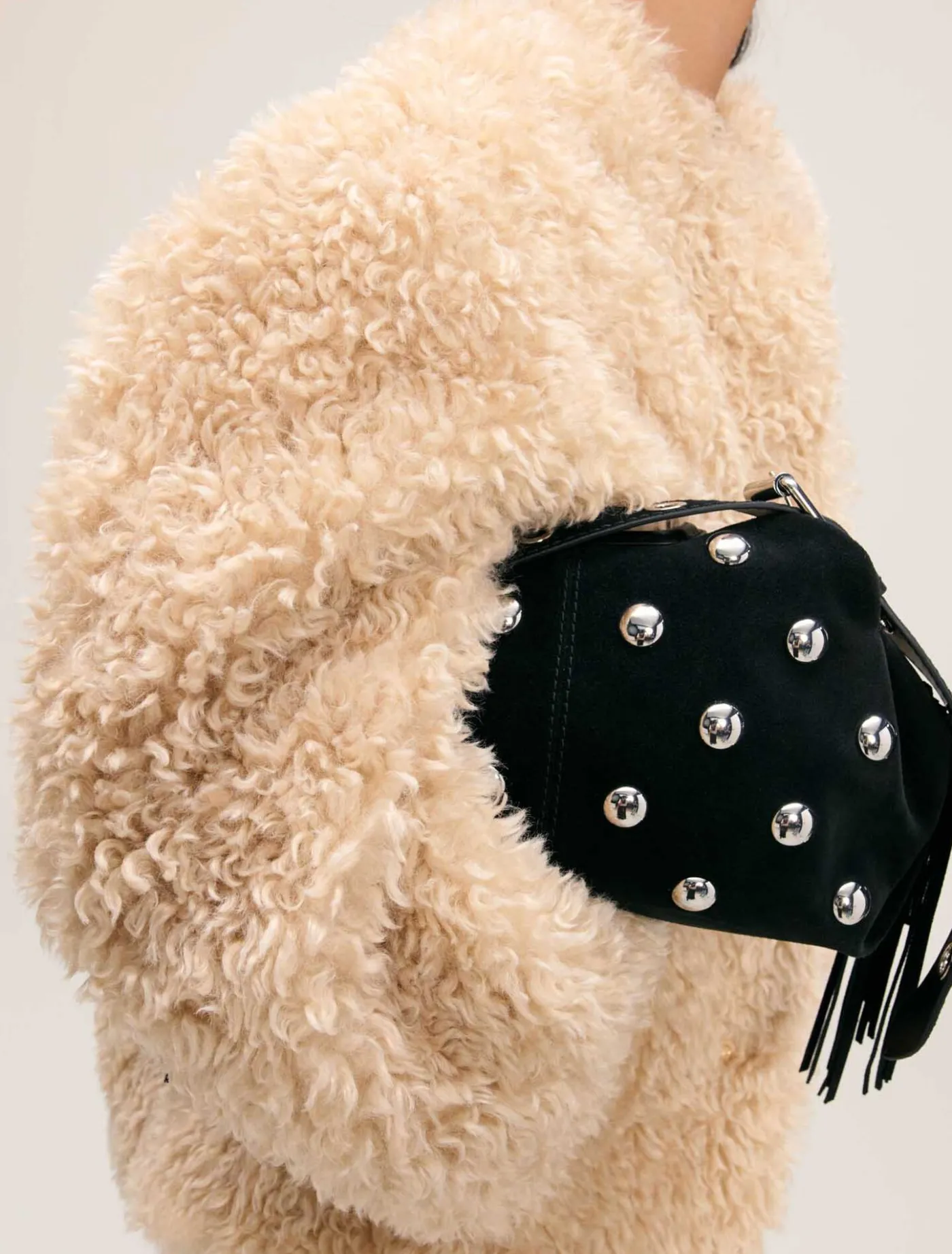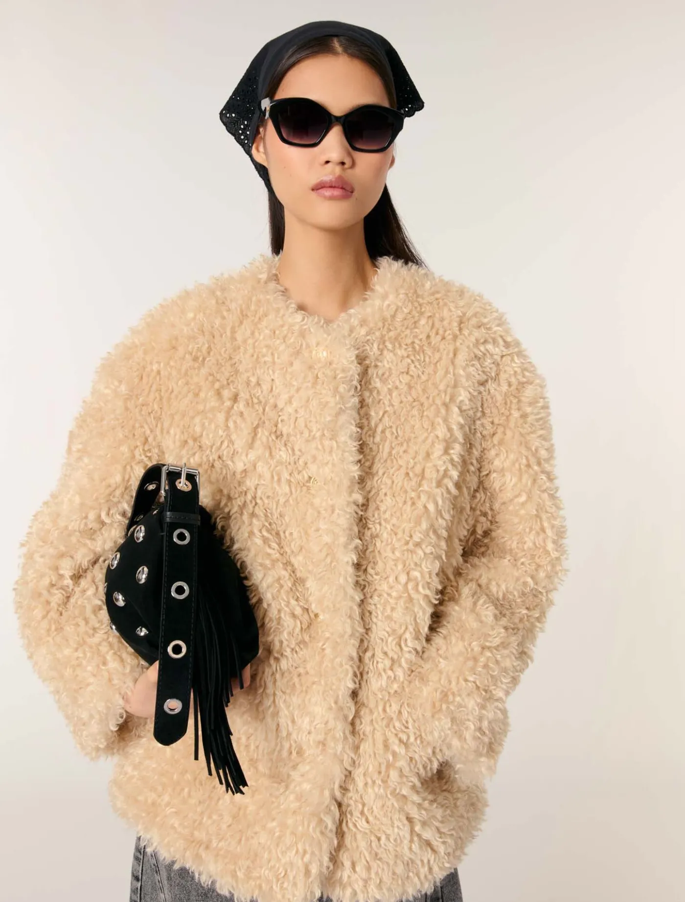 Made from long-haired faux fur with a curly effect, this short coat is very warm to wrap up in and has a soft, textured fabric. It has Clover gold buttons and two pockets.