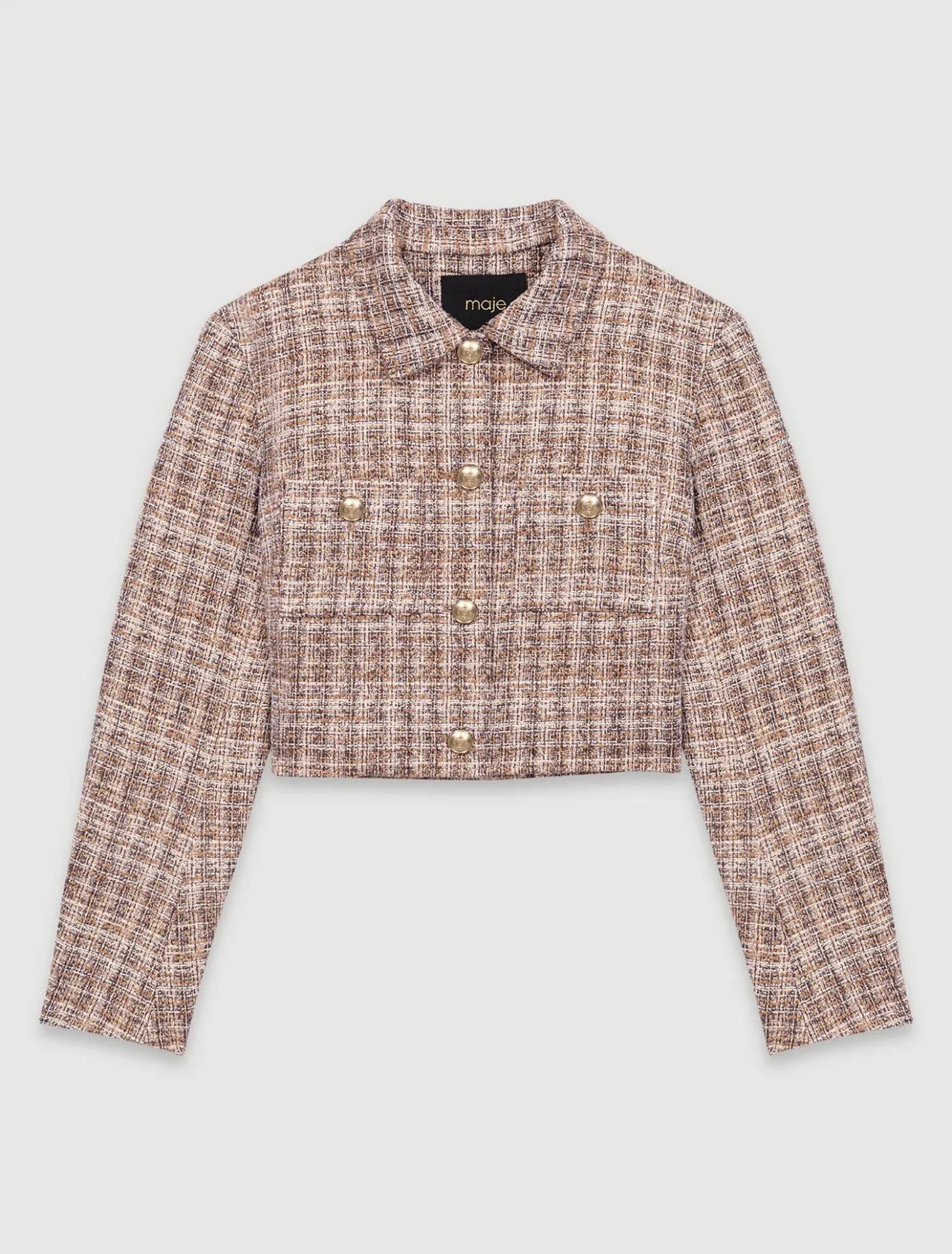 Featuring a Clover satin-effect lining, this cropped tweed jacket structures your look elegantly. Featuring a shirt collar, round neck and long sleeves, it has gold buttons down the front as well as on the two patch pockets.