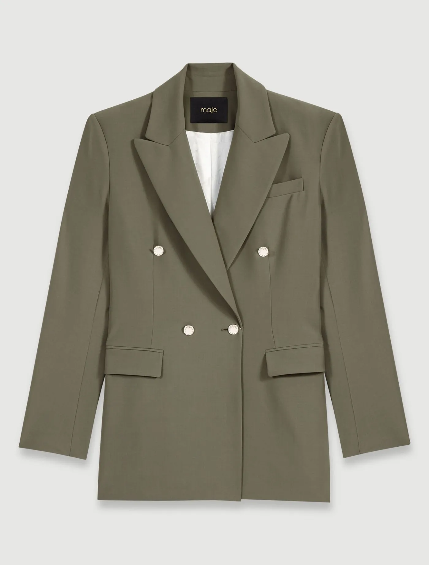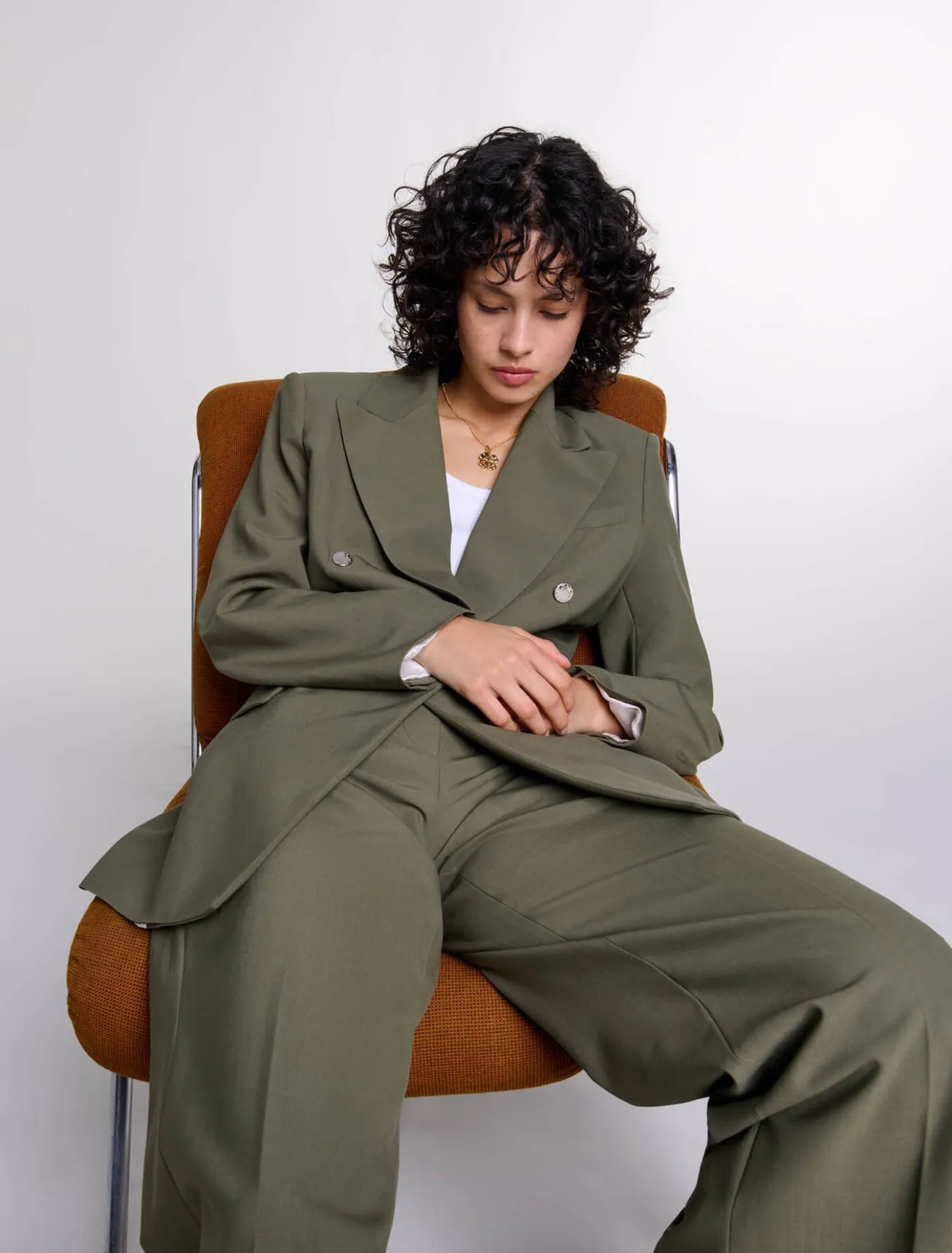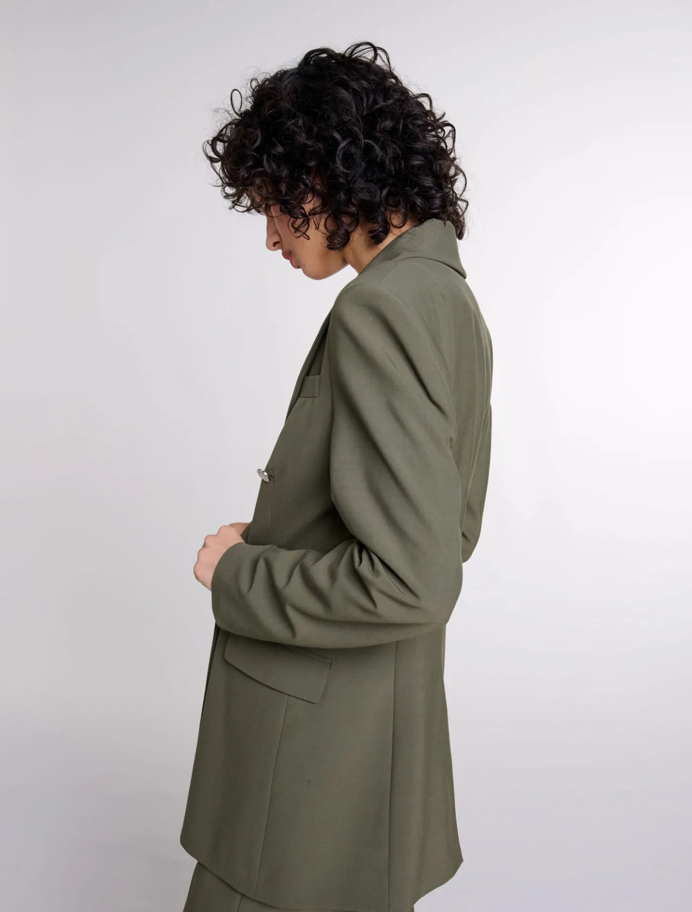 Inspired by the officer style, this suit jacket creates a chic, structured silhouette with a cinched, flared waist. Two flap pockets and a welt chest pocket, a large lapel collar, shoulder pads and a double-breasted design complete the assertive look.
