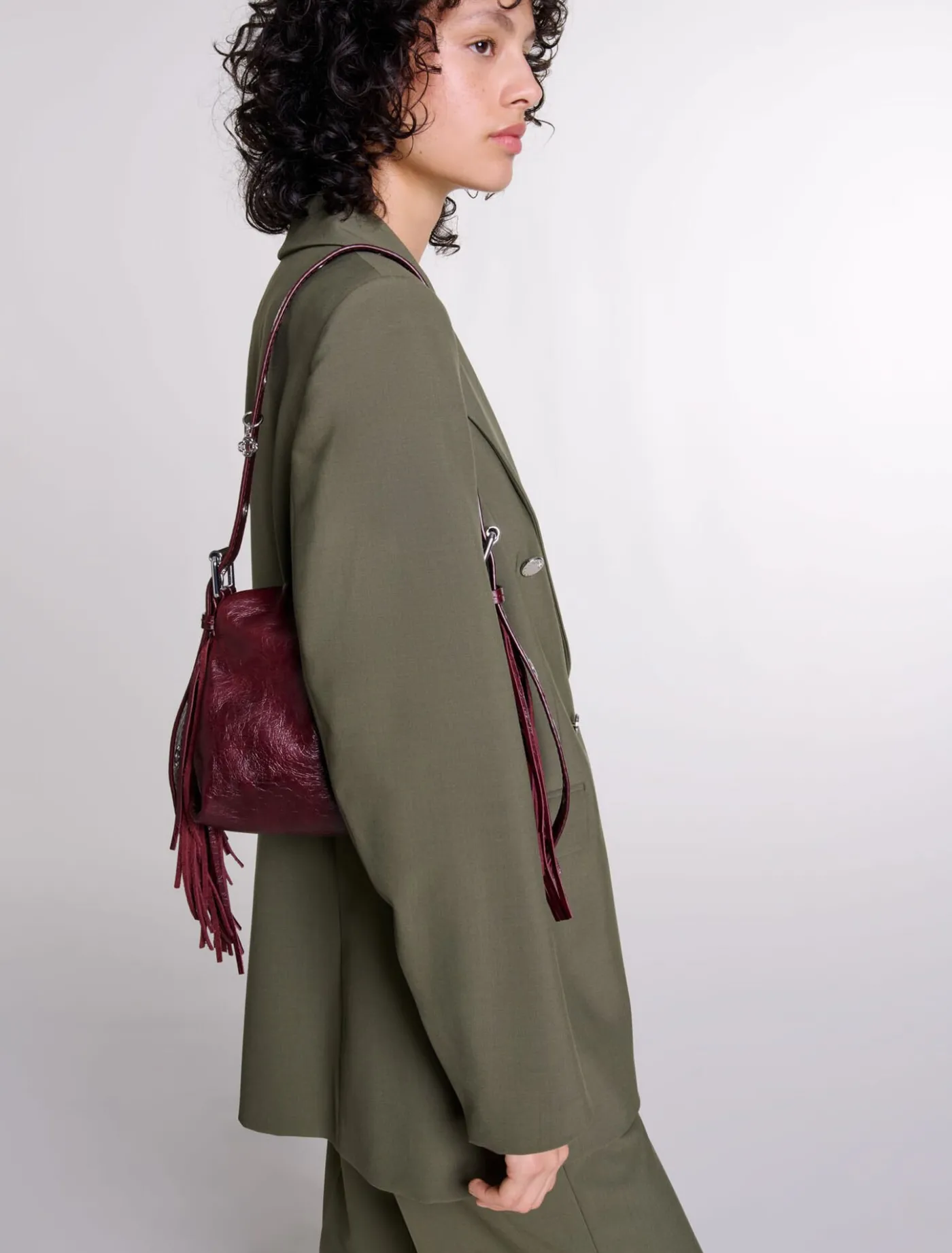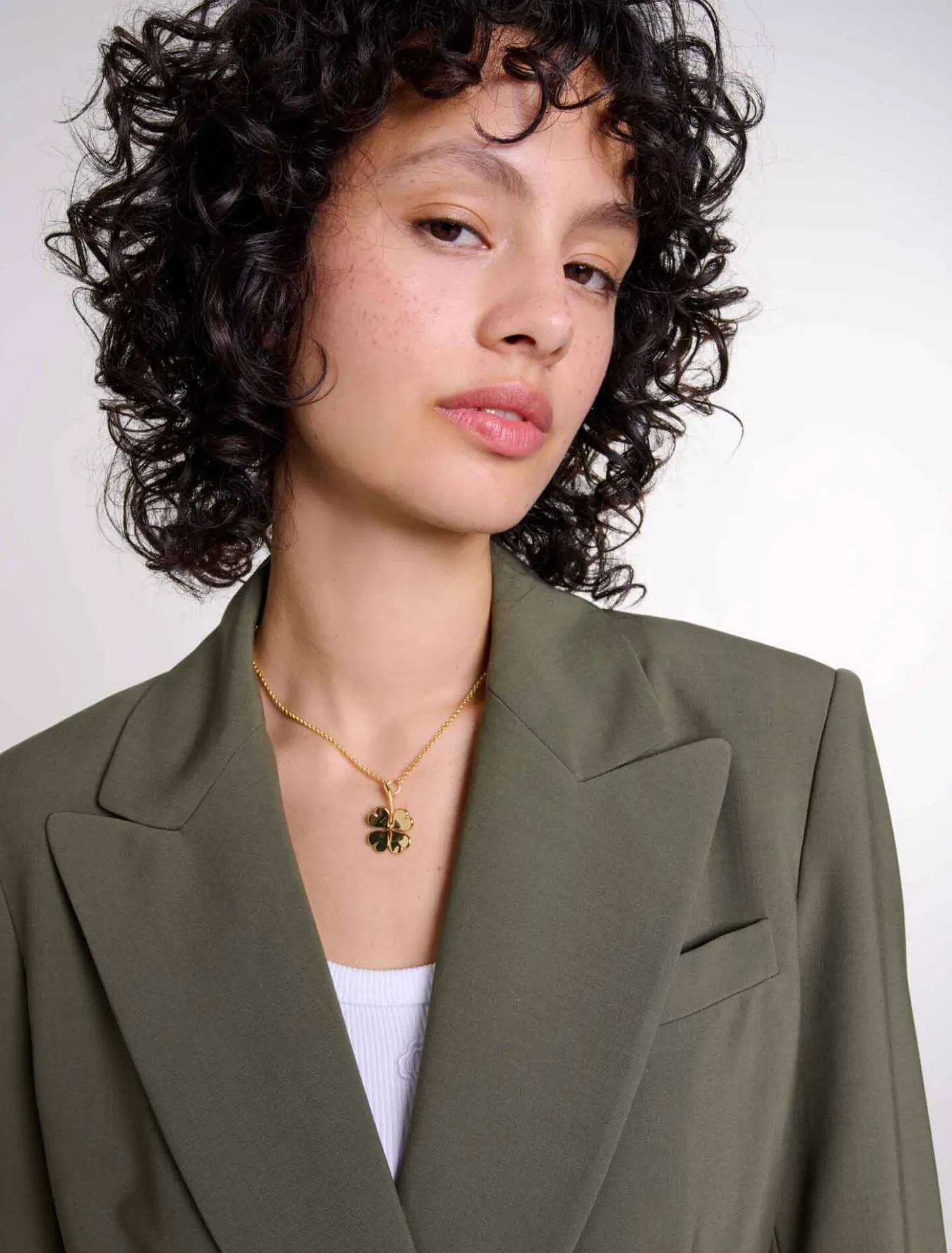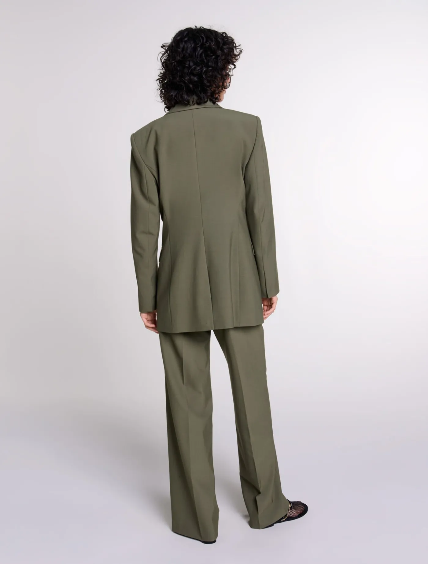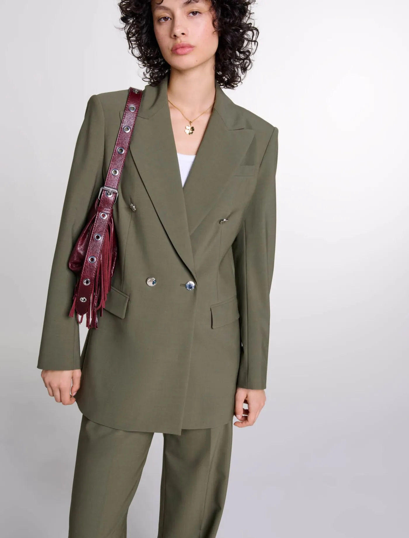 Inspired by the officer style, this suit jacket creates a chic, structured silhouette with a cinched, flared waist. Two flap pockets and a welt chest pocket, a large lapel collar, shoulder pads and a double-breasted design complete the assertive look.
