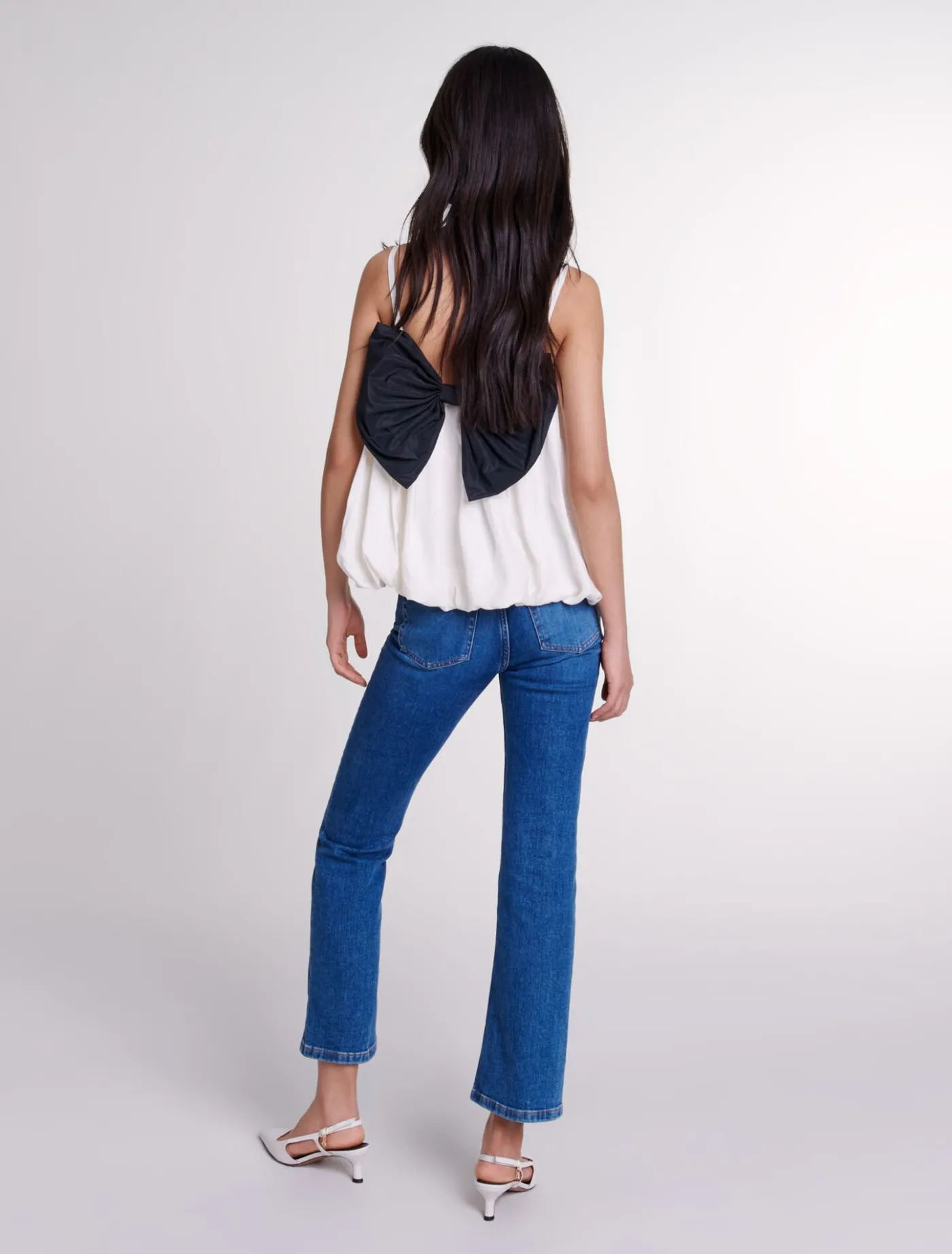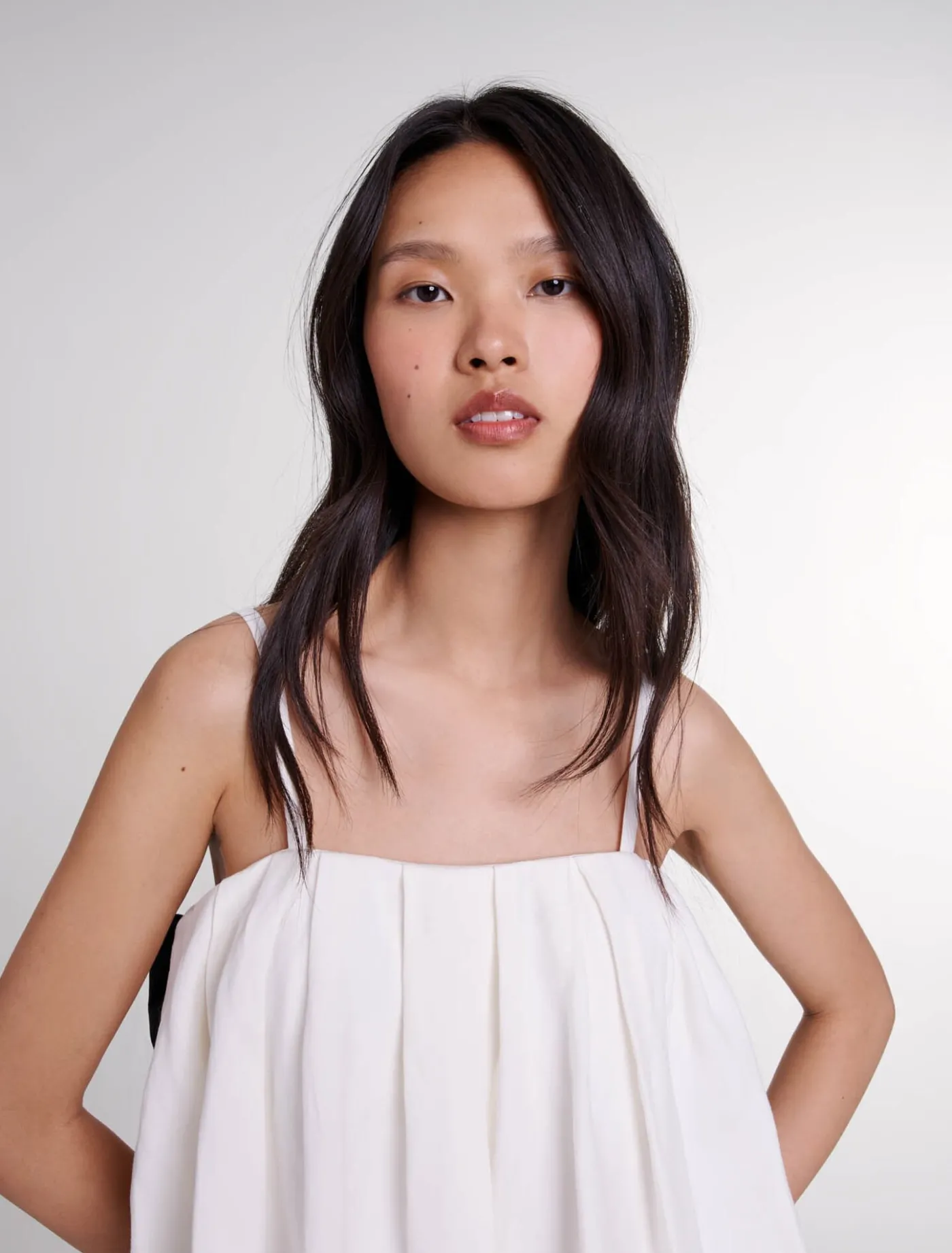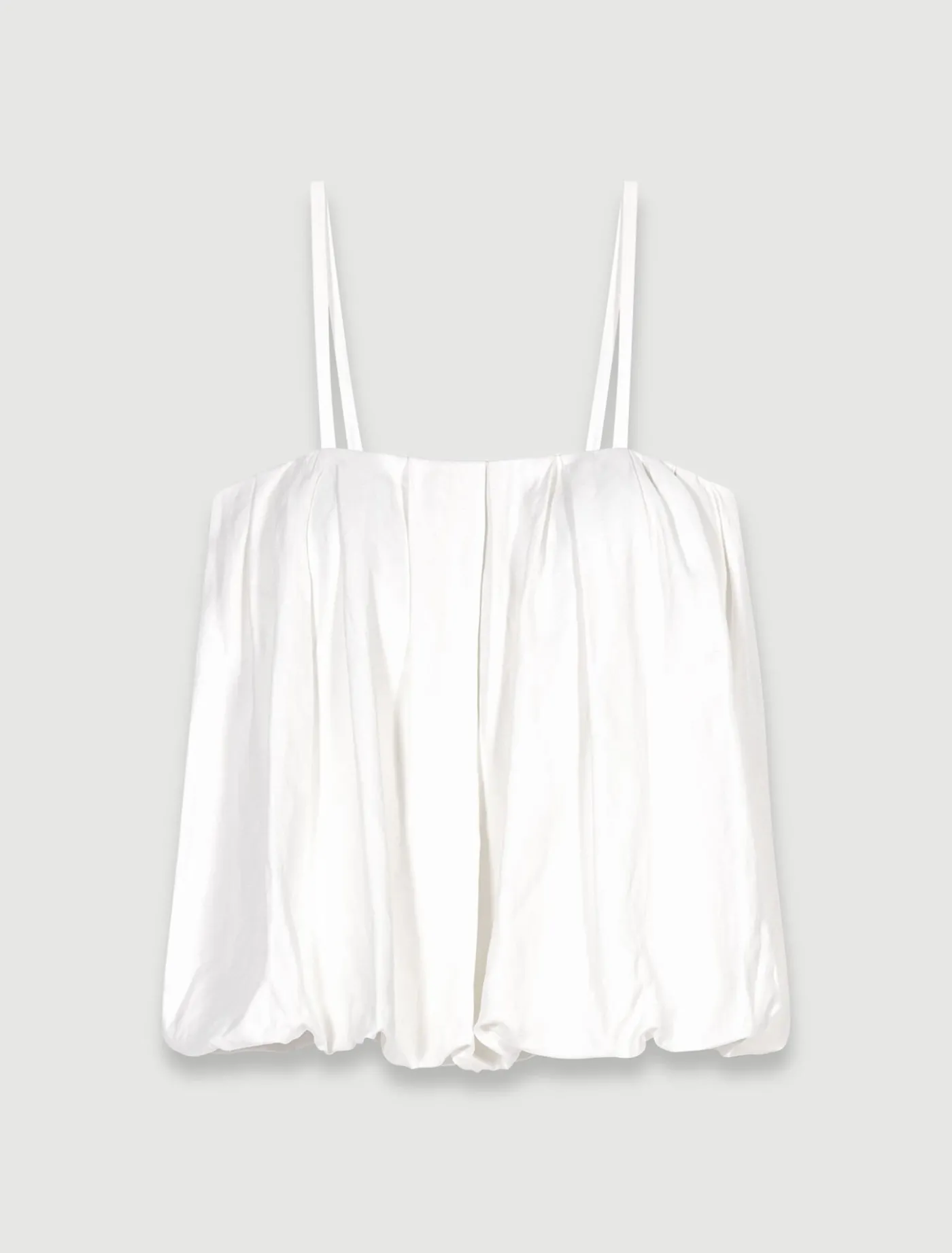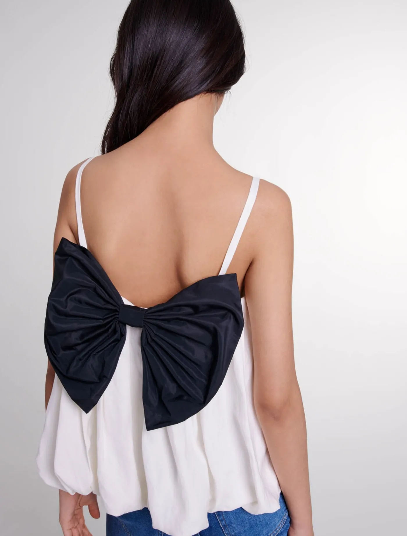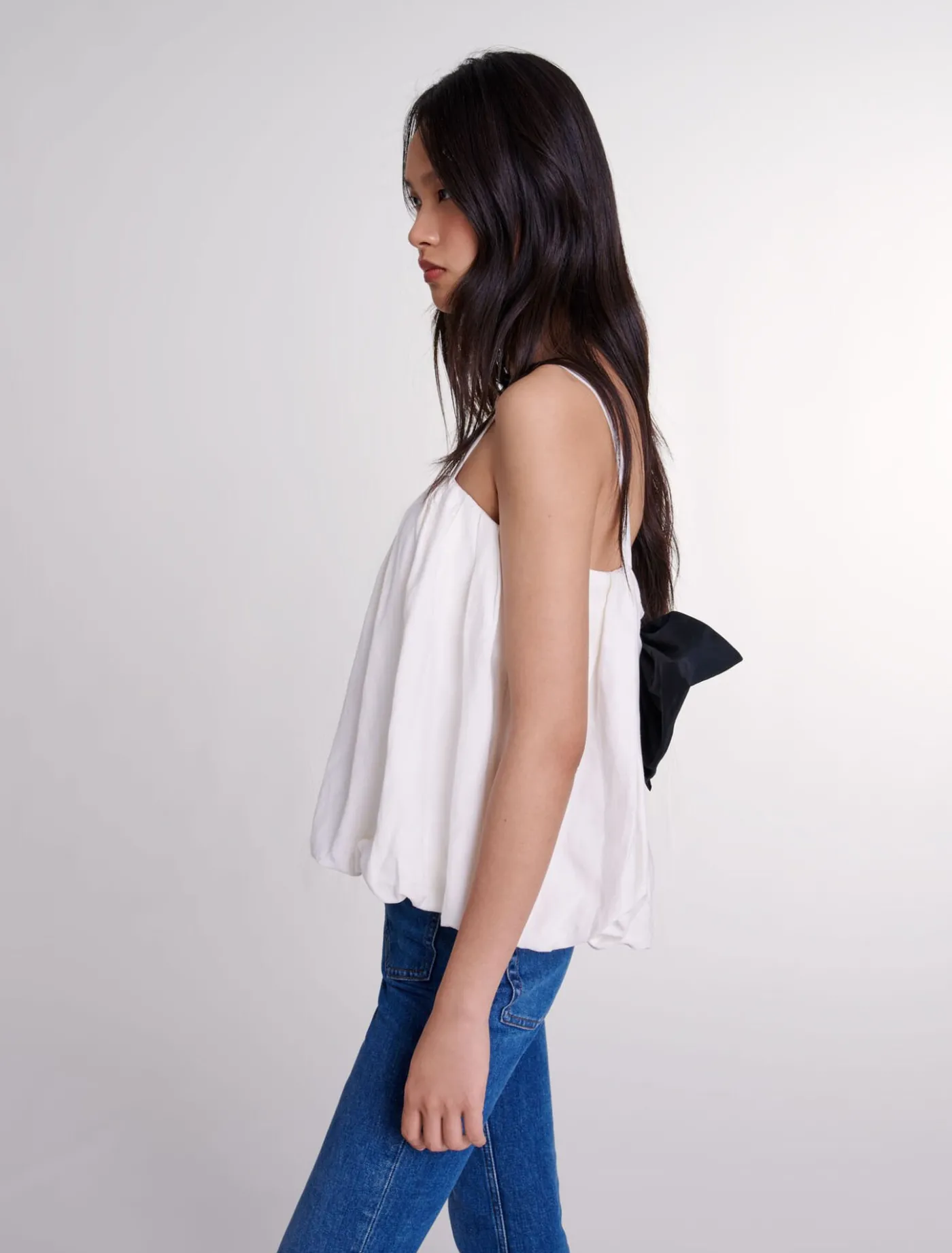This top plays on volume, with pleats and a ball effect. Alongside spaghetti straps with adjustable buttons, it has a built-in bra and a removable brooch in the form of an XL bow at the back.