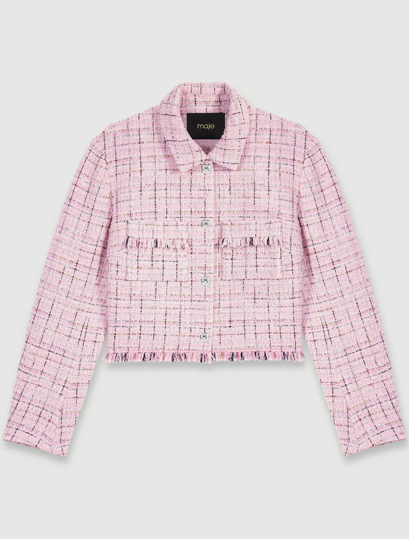 Embellished with silver buttons and fringed edges, this cropped jacket in tweed with metallic threads has a subtle touch of sparkle. It has a structured straight fit, accentuated by a zip, a shirt collar, two patch chest pockets and long sleeves.