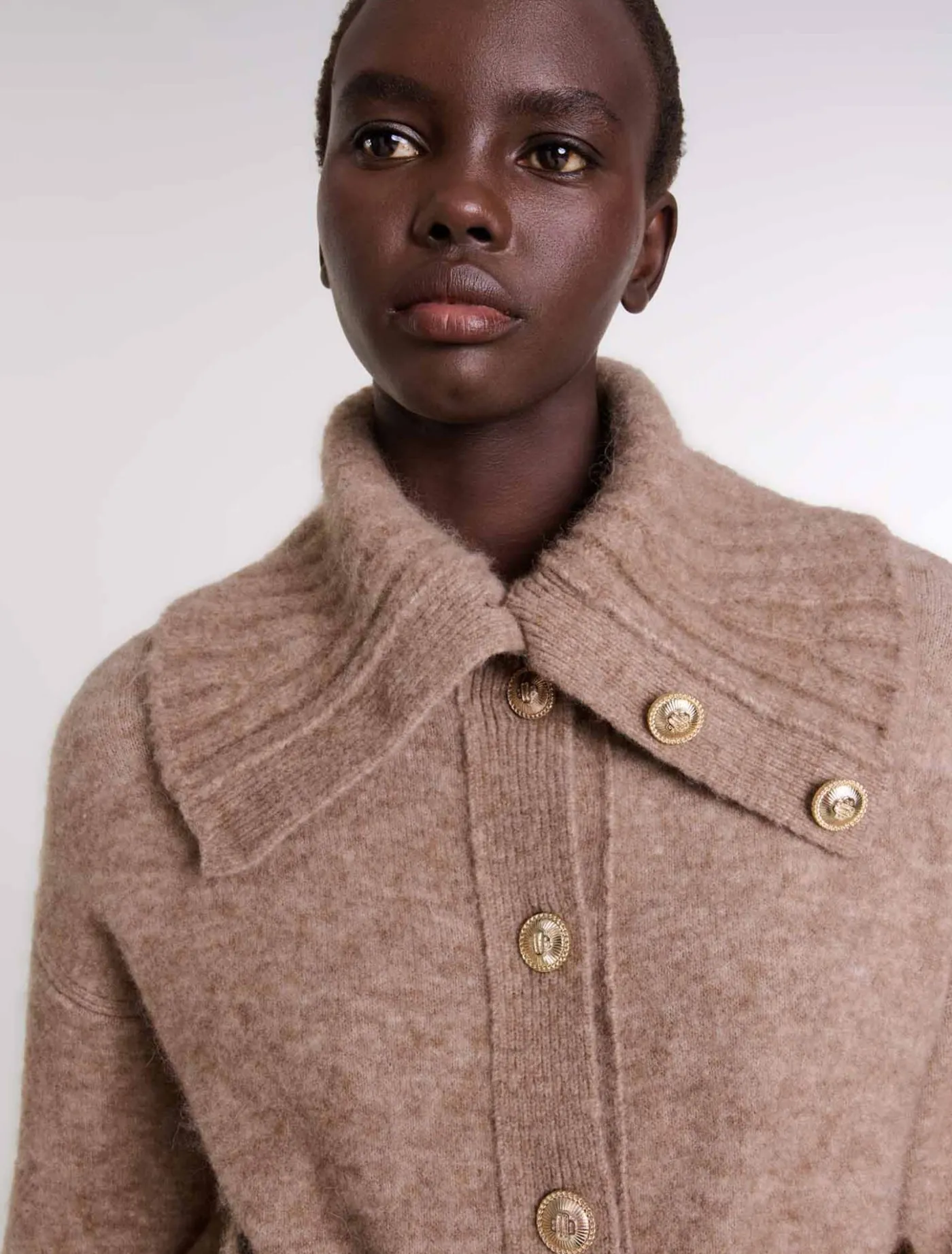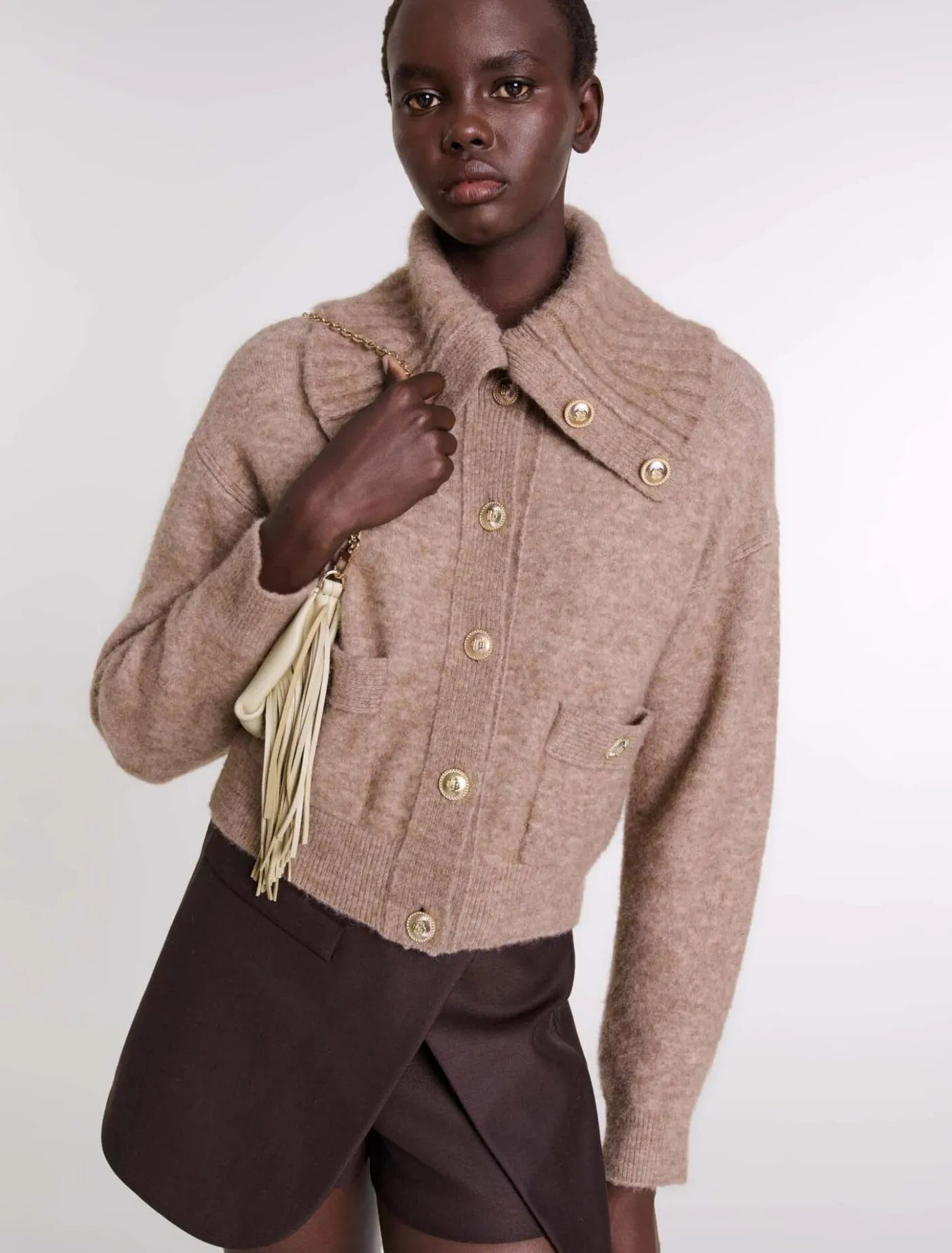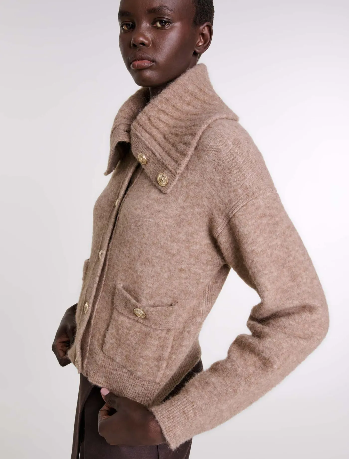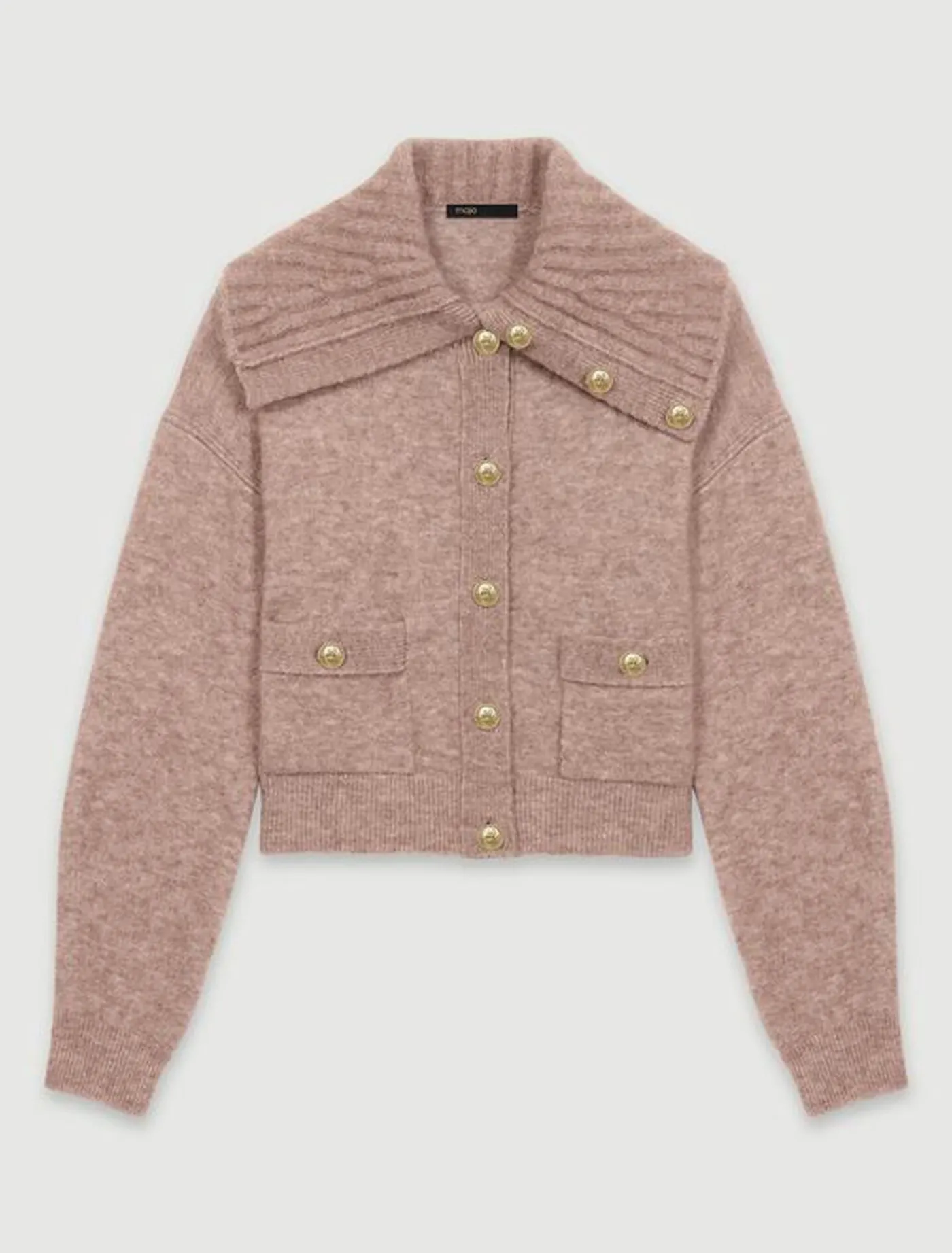 This cropped jumper with long sleeves can be worn undone for a casual look or fastened for a more structured silhouette. The wide sailor-jacket collar, two patch pockets and fastening with gold Clover buttons, make it an elegant and versatile piece.